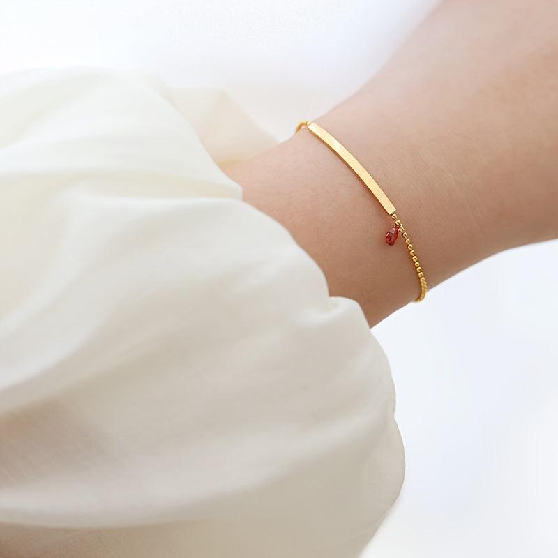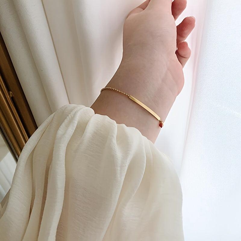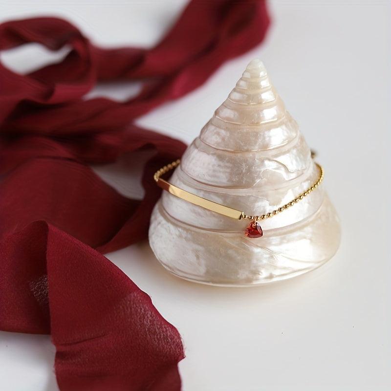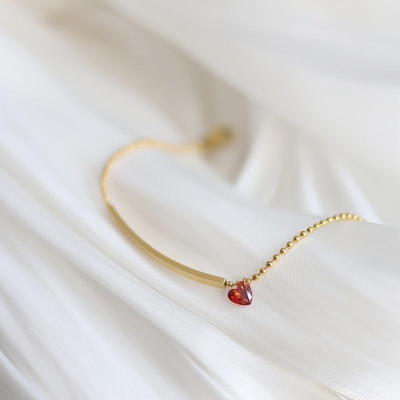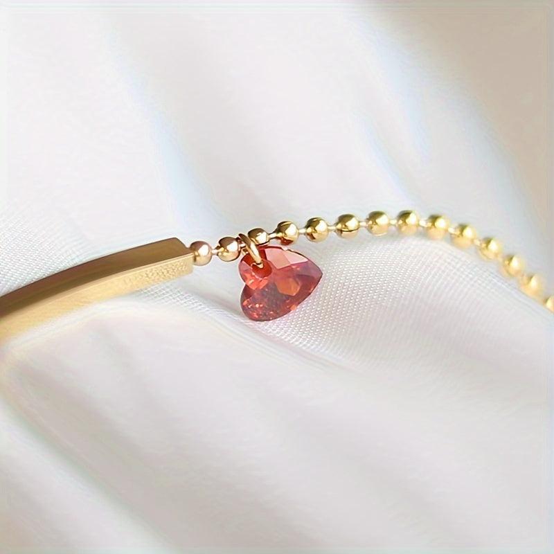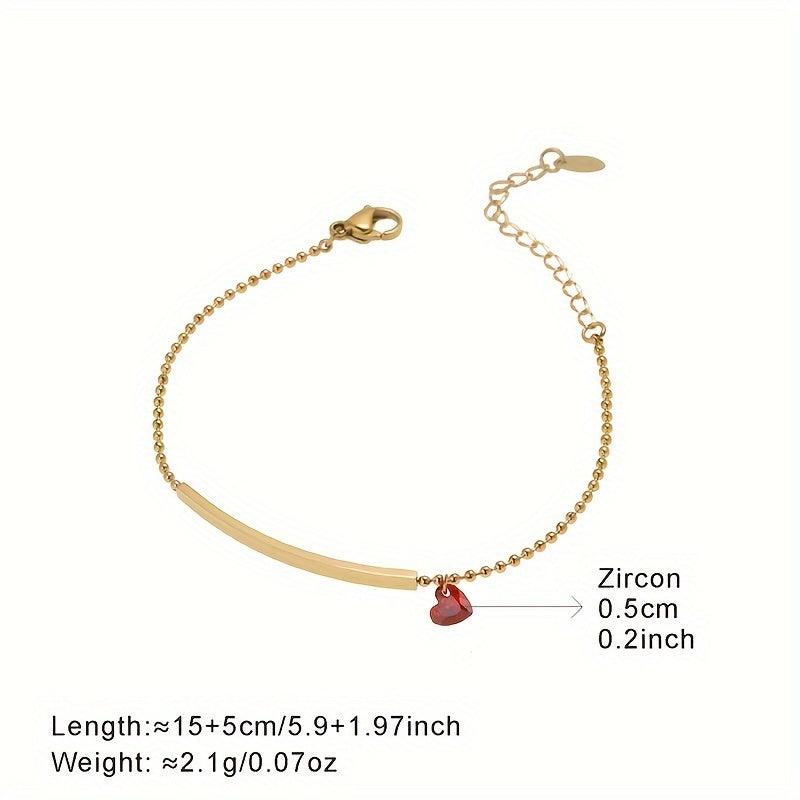 Elegant red heart charm bracelet made of high-quality stainless steel plated with 18K gold. Features sparkling CZ stones and an adjustable chain. Perfect gift for a loved one.