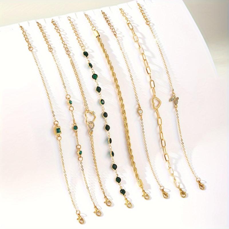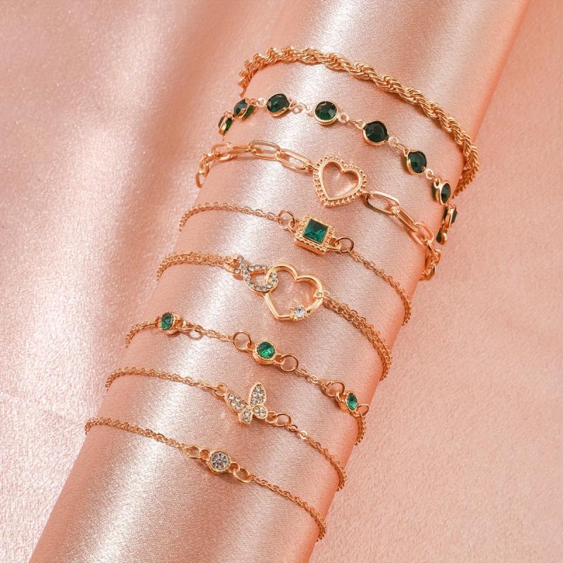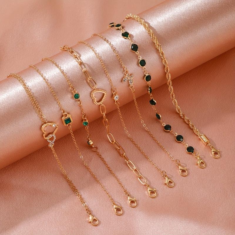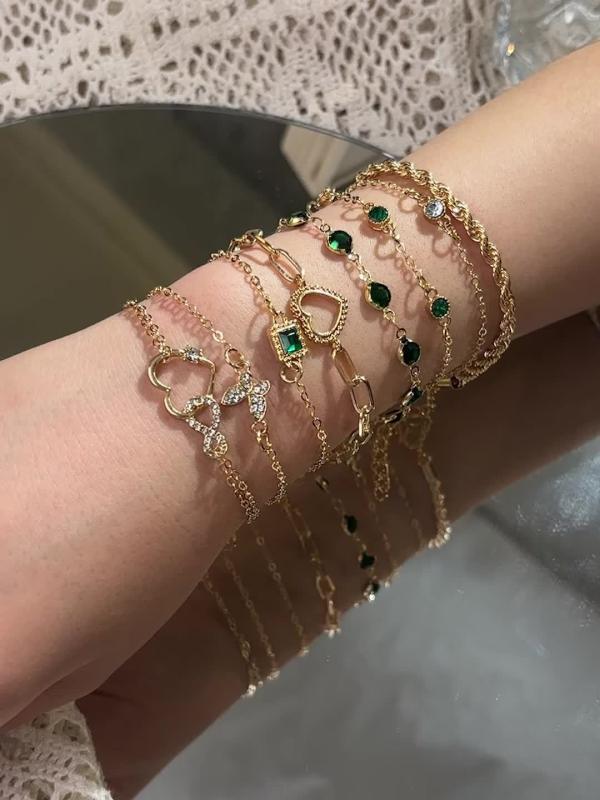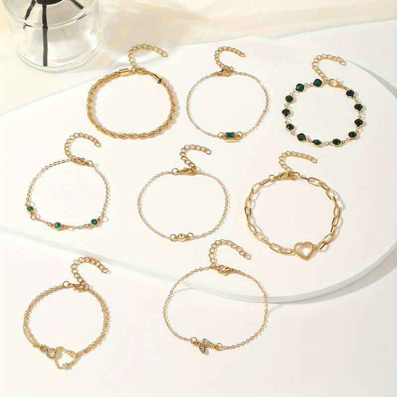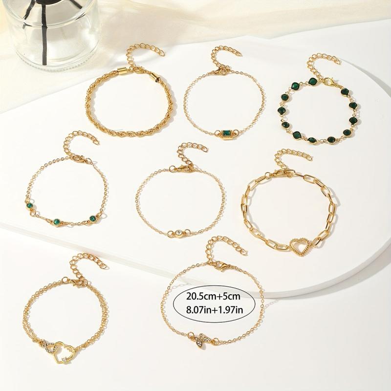 Elevate your style with this chic 8pcs bracelet set featuring heart and geometric designs with rhinestone accents. Perfect for daily wear or special occasions.