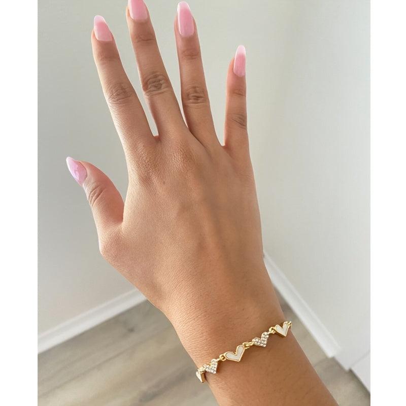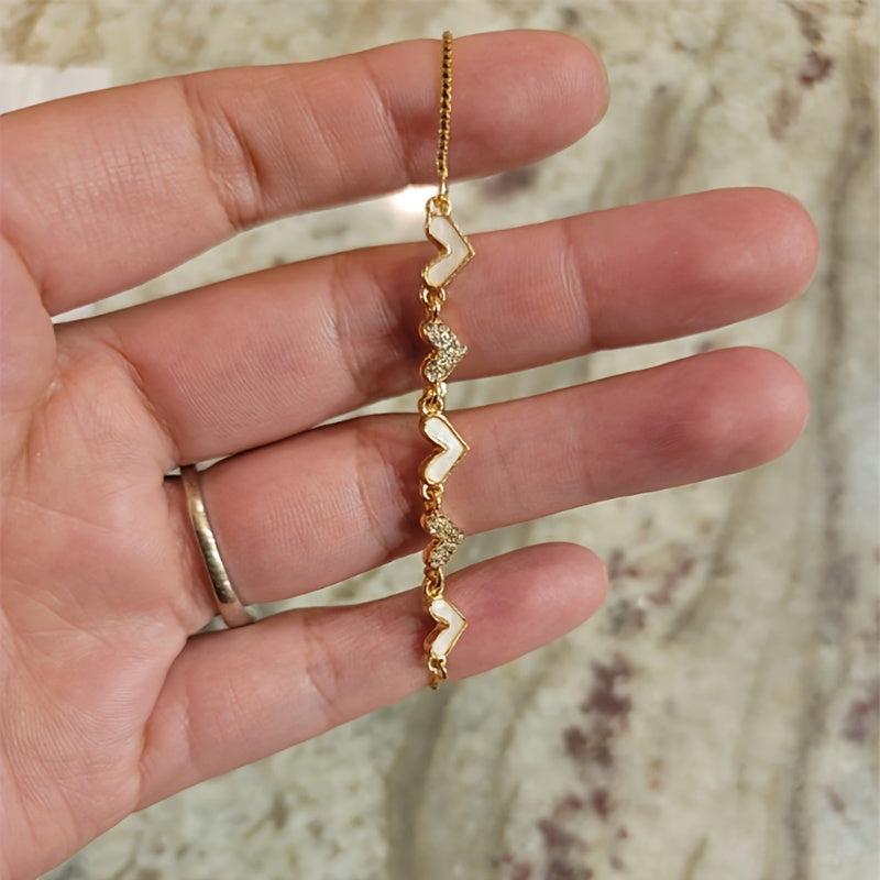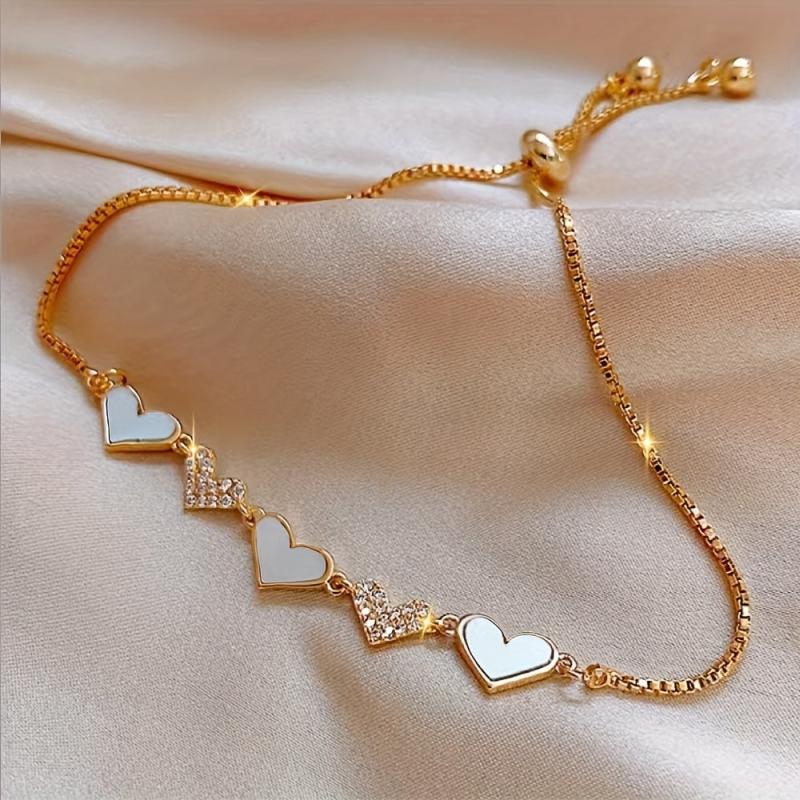 Elegant metal bracelet embellished with heart-shaped rhinestones, ideal for Valentine's Day or as a thoughtful gift for a loved one.