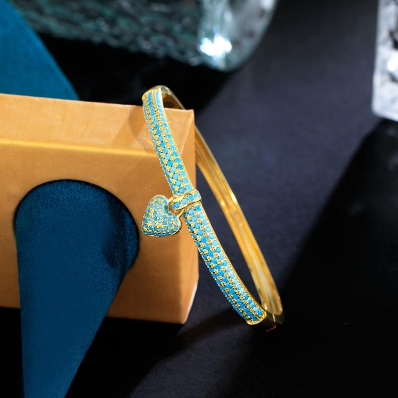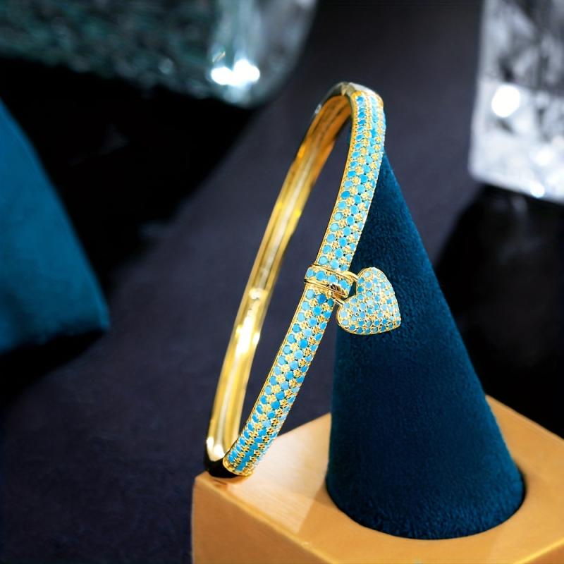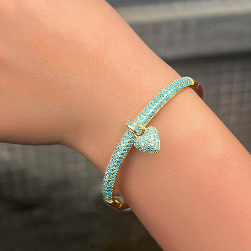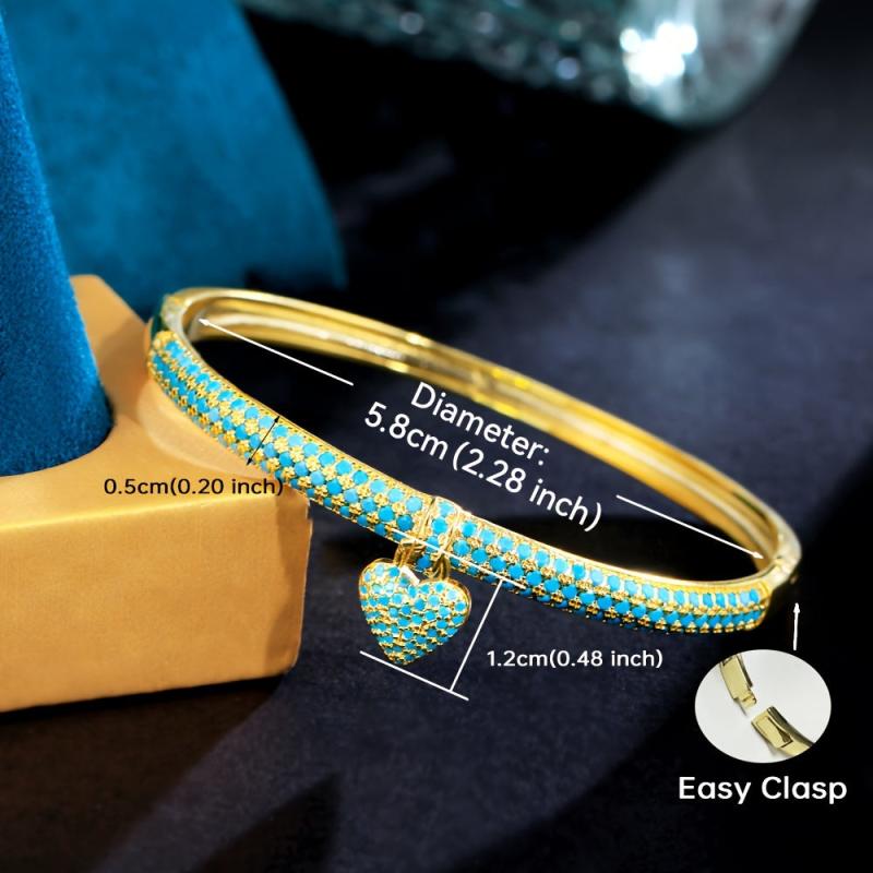This beautiful bangle features a heart shaped turquoise stone set in a golden plated round open cuff design. The bangle has a diameter of 5 inches and is adorned with micro pave synthetic stones for added sparkle and elegance.
