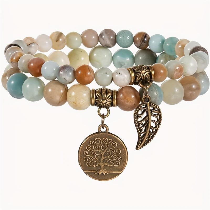 Set of 2 bracelets featuring life tree and leaf charms designed to alleviate anxiety with healing stones and crystals. Perfect for reducing stress and promoting relaxation.