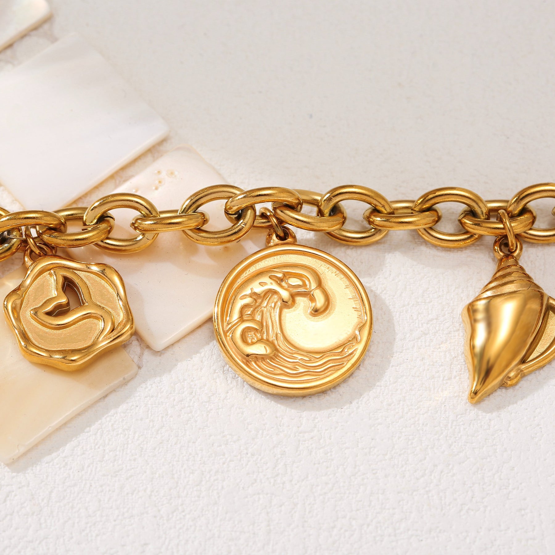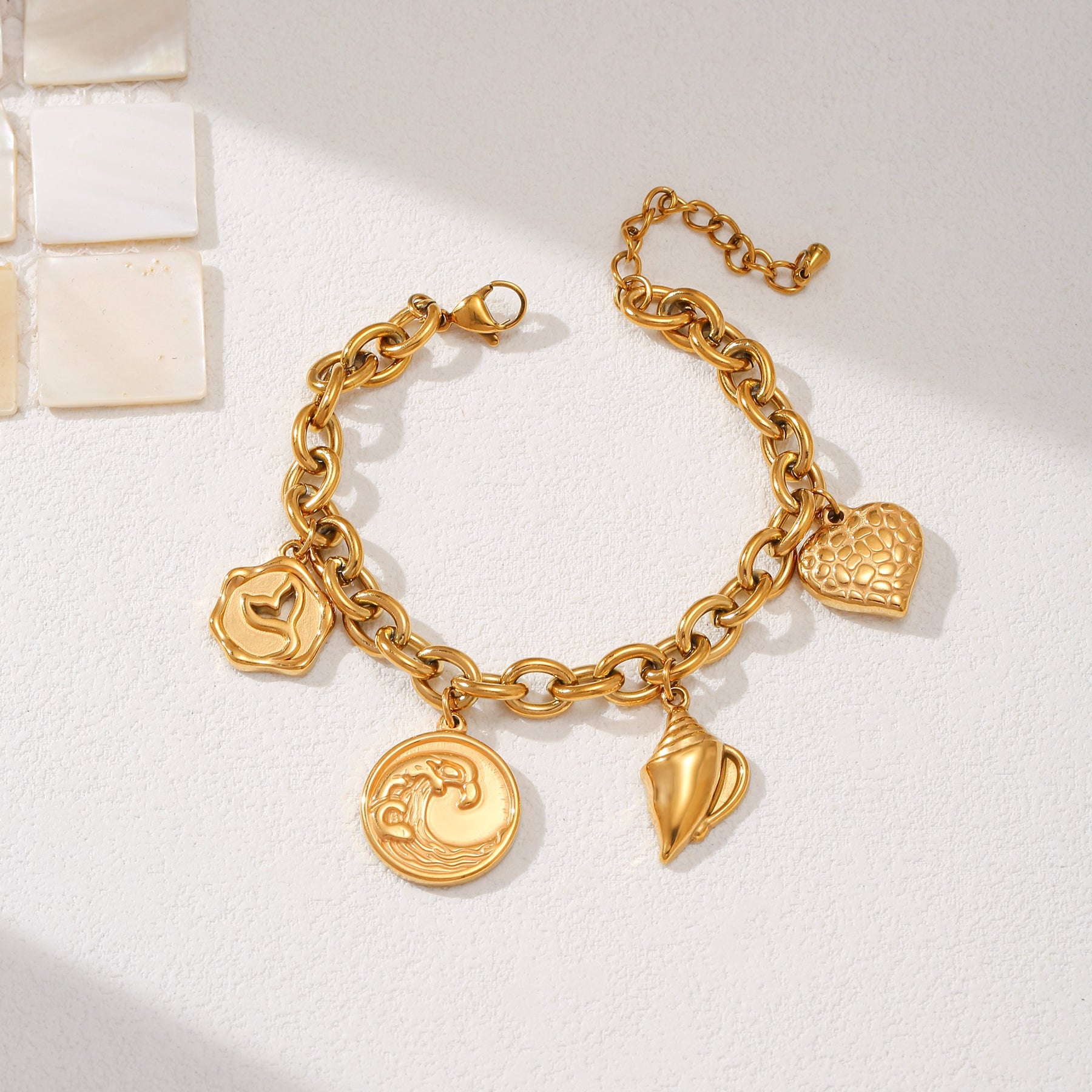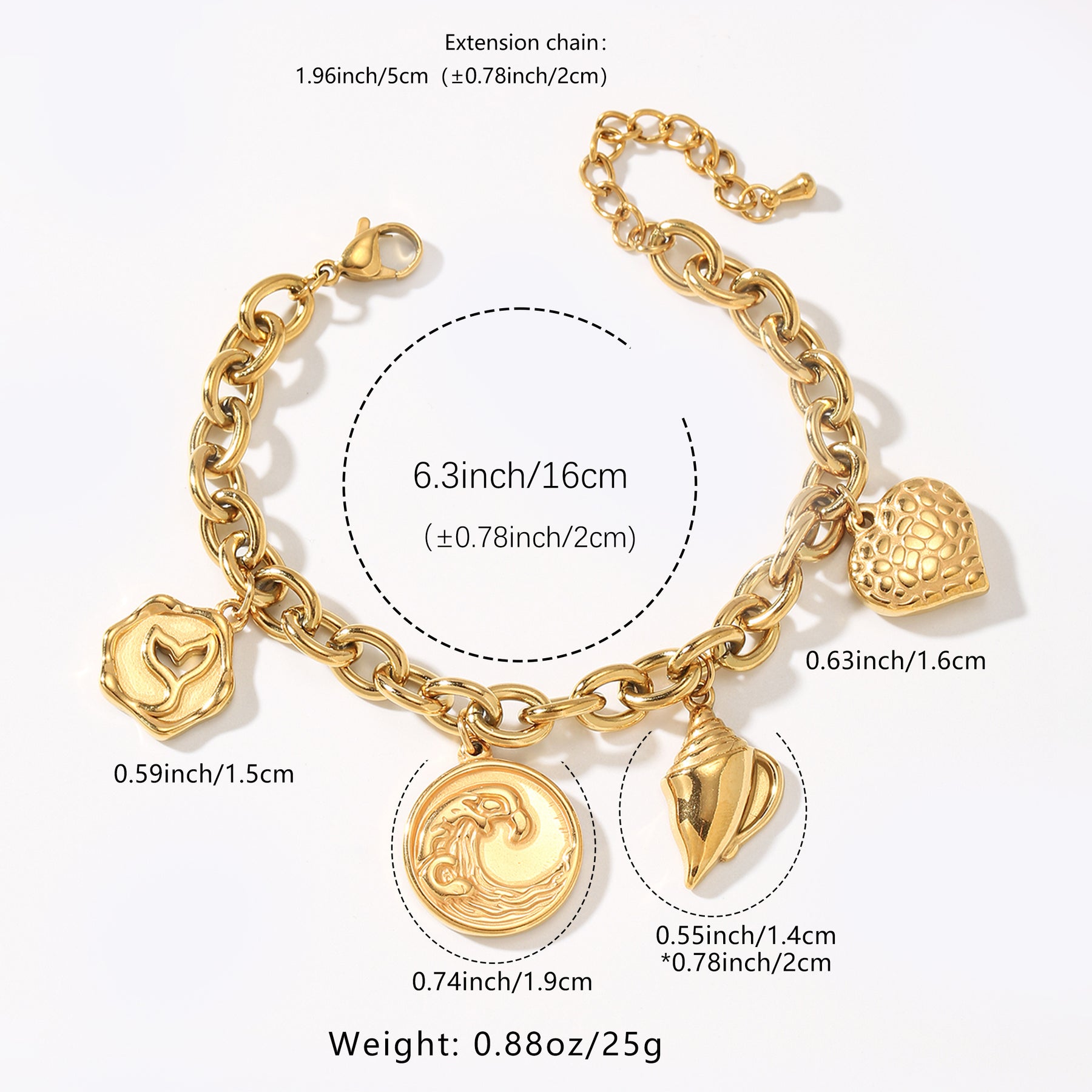 Embrace elegance with the LNCHRAN Heart Shell Bracelet featuring a golden tone design. Crafted from hypoallergenic stainless steel for lasting wear.
