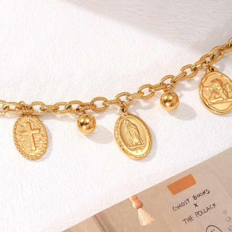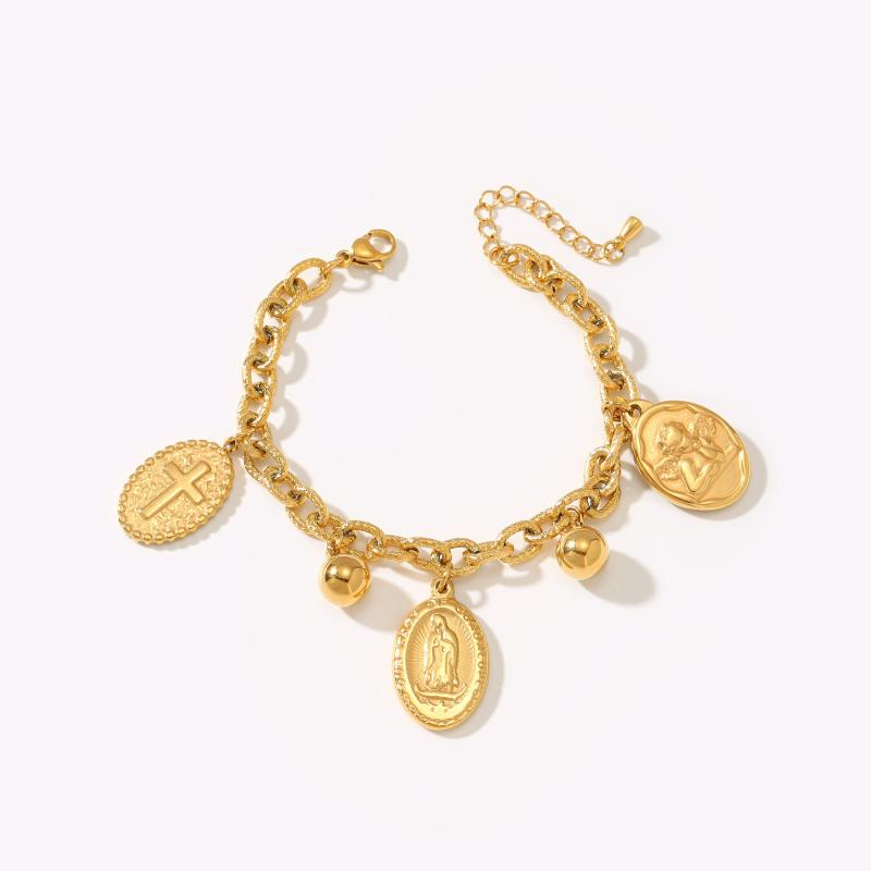 Add a touch of elegance with this golden stainless steel bracelet featuring charming designs. Hypoallergenic and perfect for daily wear.