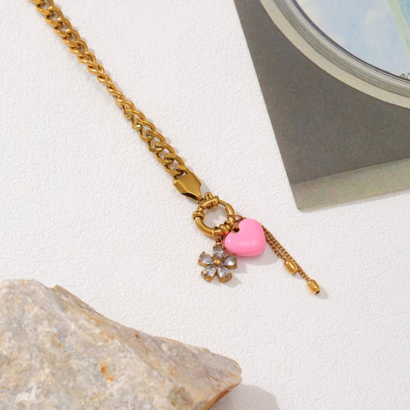 This women's stainless steel bracelet features a peach heart tassel charm with durable resin accents. Perfect for beach vacations and casual wear.