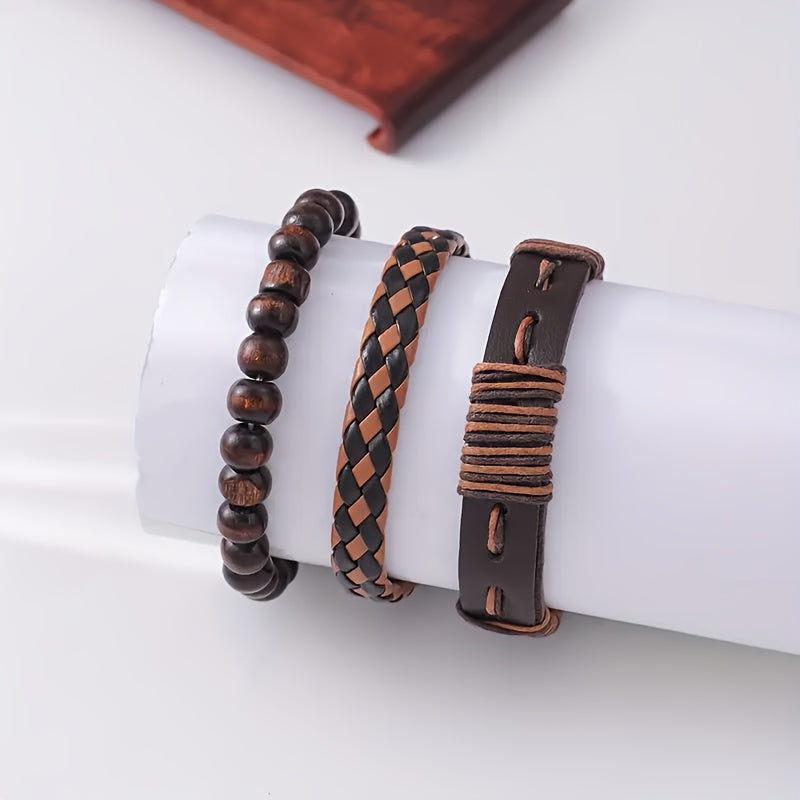 This stylish faux leather bracelet features a combination of beaded, woven, and checkered designs. Perfect gift for couples or fashion-forward individuals.
