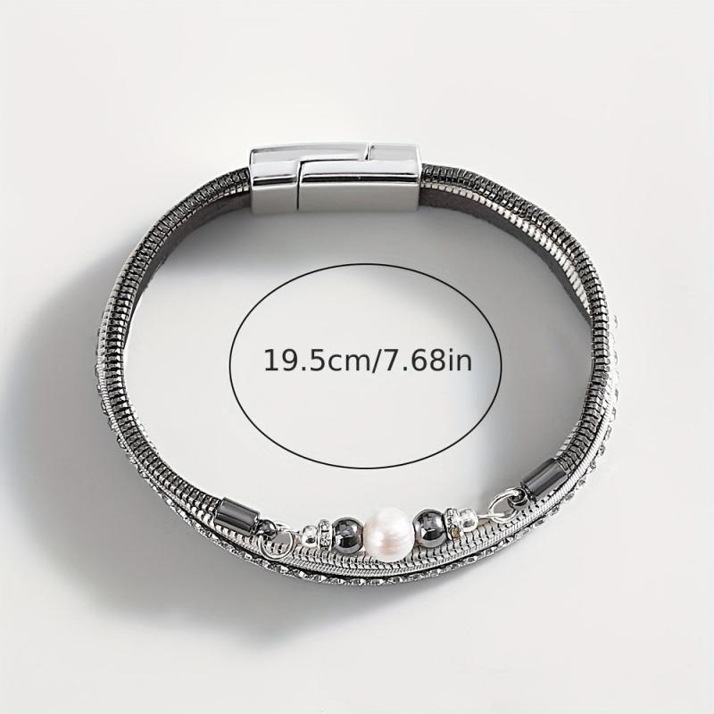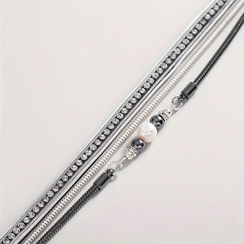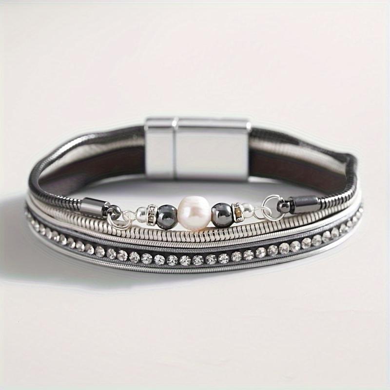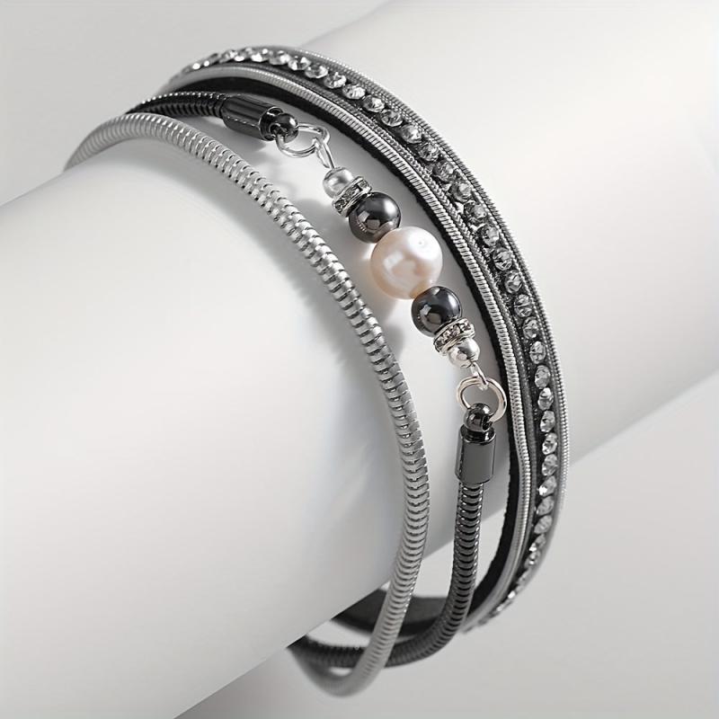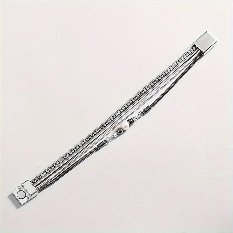 Elevate your vacation style with this beautifully crafted layered metal chain bracelet featuring pearls and rhinestone accents. It's a perfect gift for women who love unique accessories.