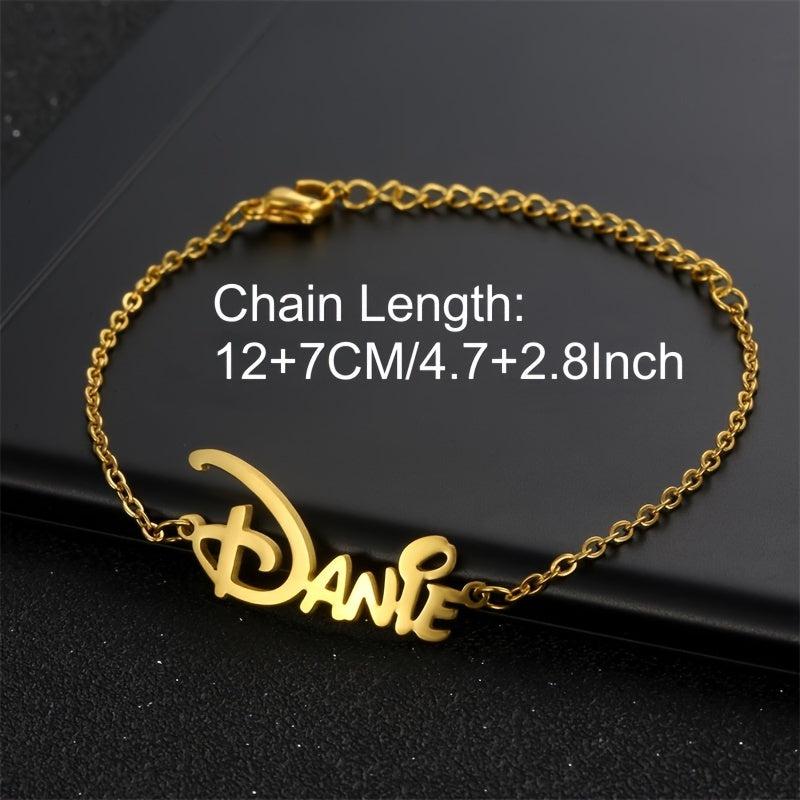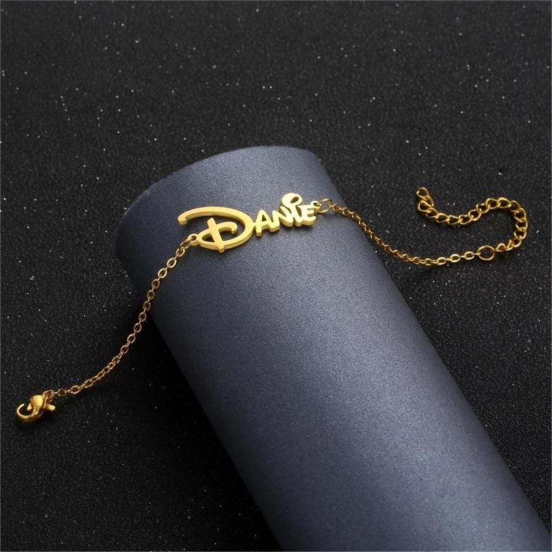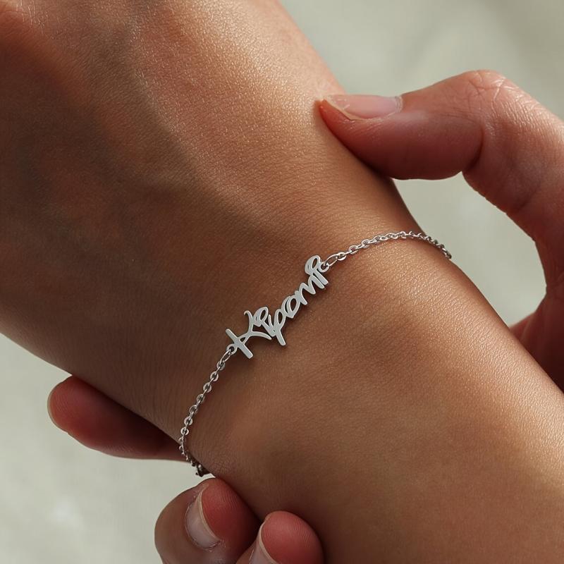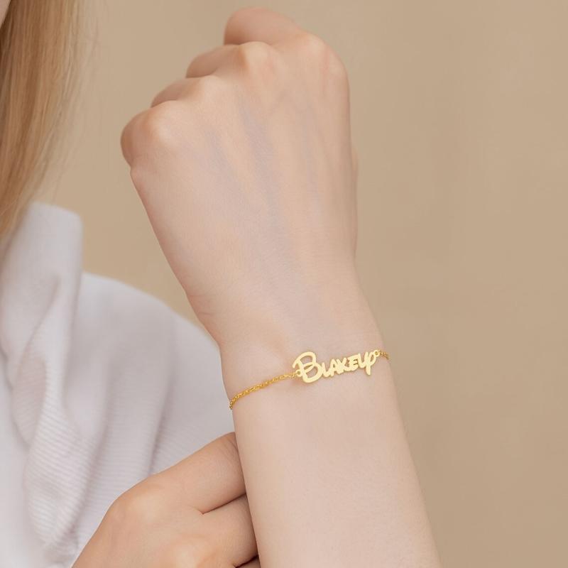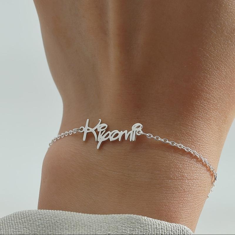 Delicate chain with handwritten font, perfect for casual attire. Custom cartoon name bracelet, a unique gift for women.