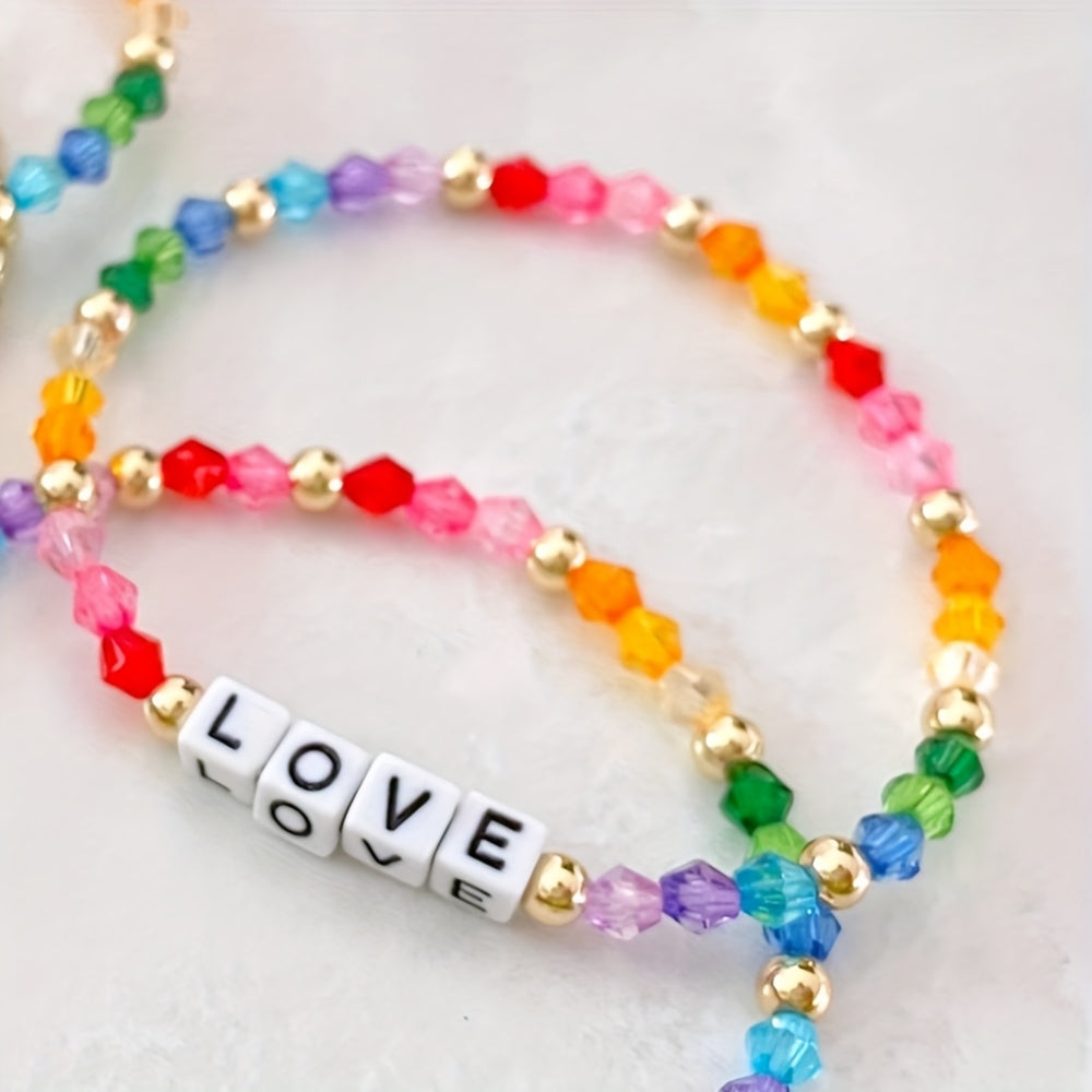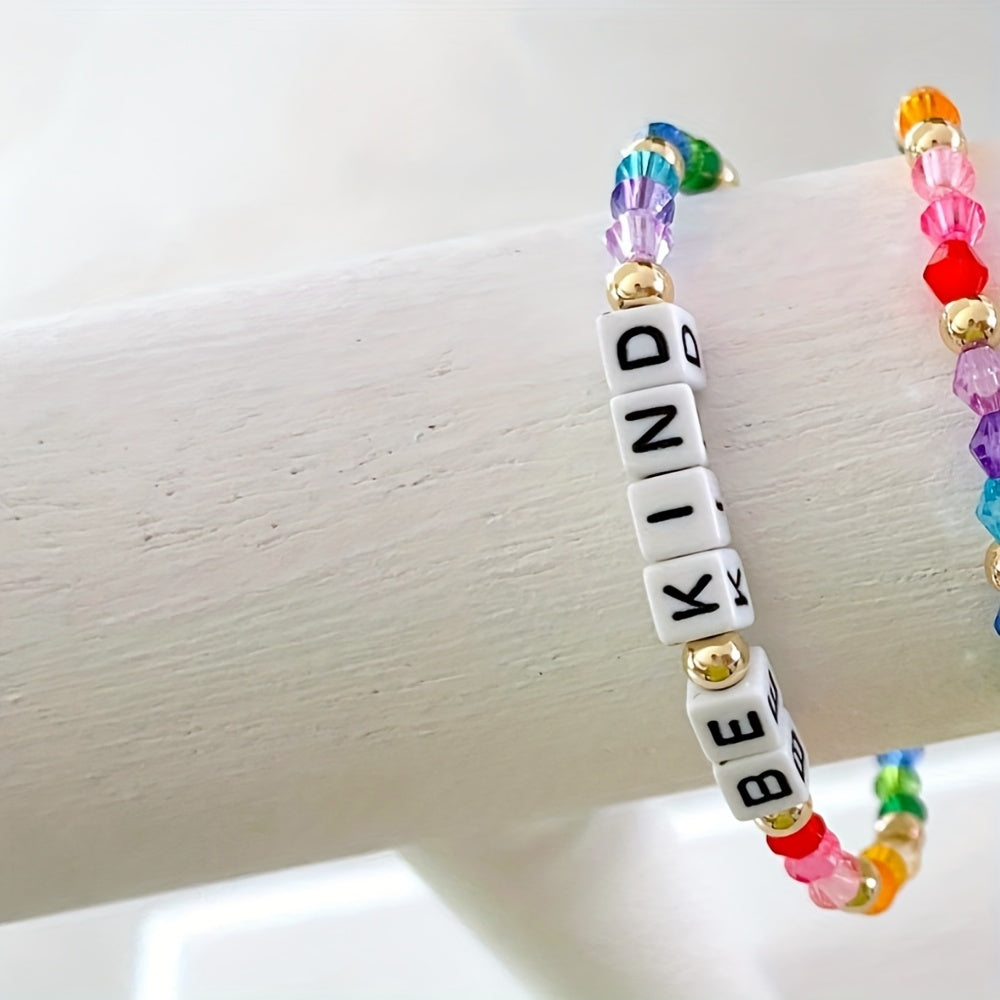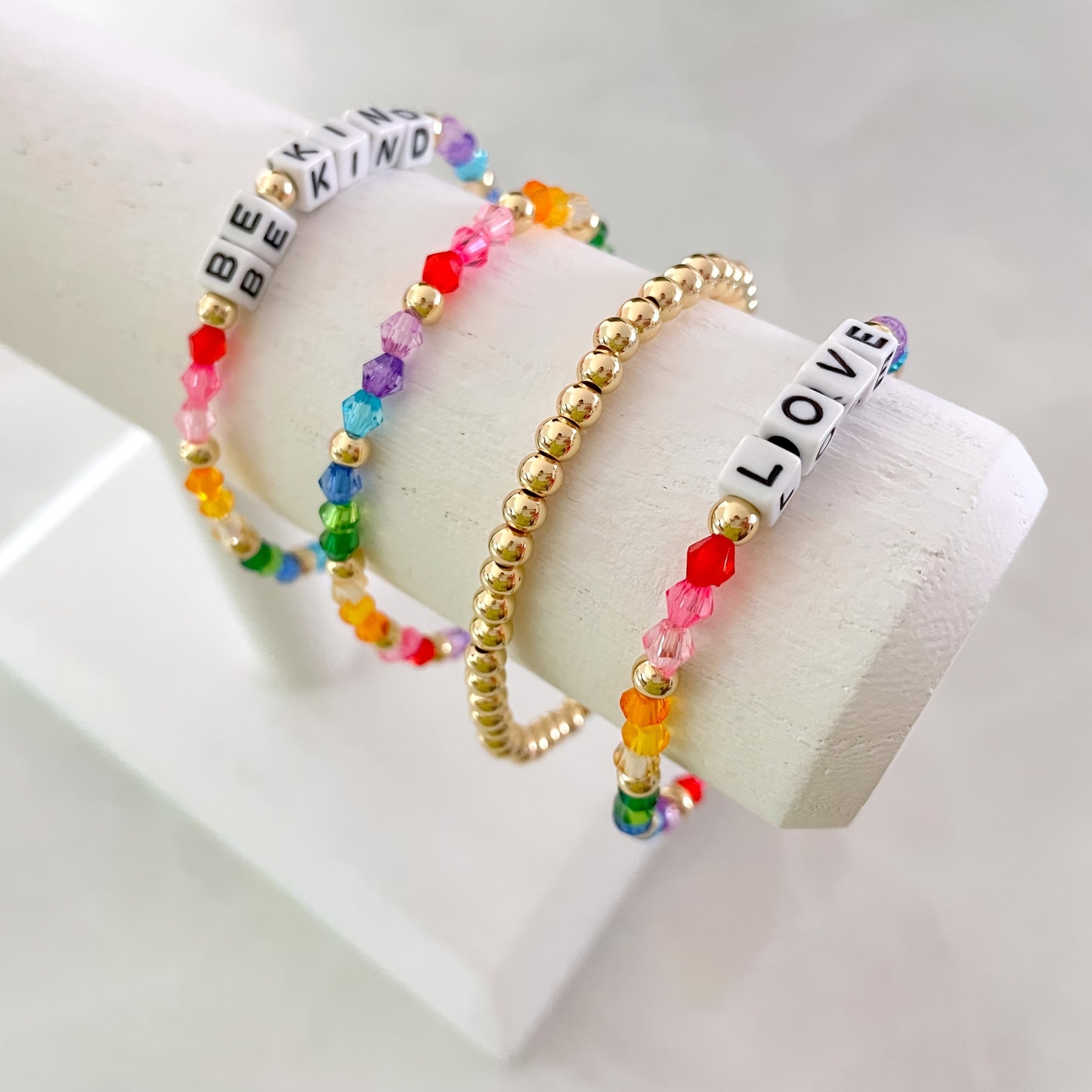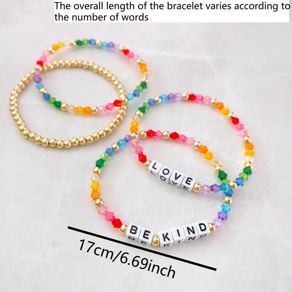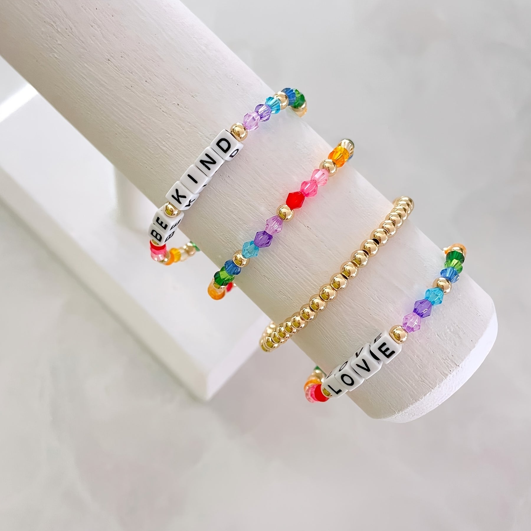 Add a touch of vintage charm with this customizable rainbow beaded name bracelet. Featuring colorful square beads and golden toned accents, this bracelet is a perfect accessory to inspire LOVE & BE KIND.