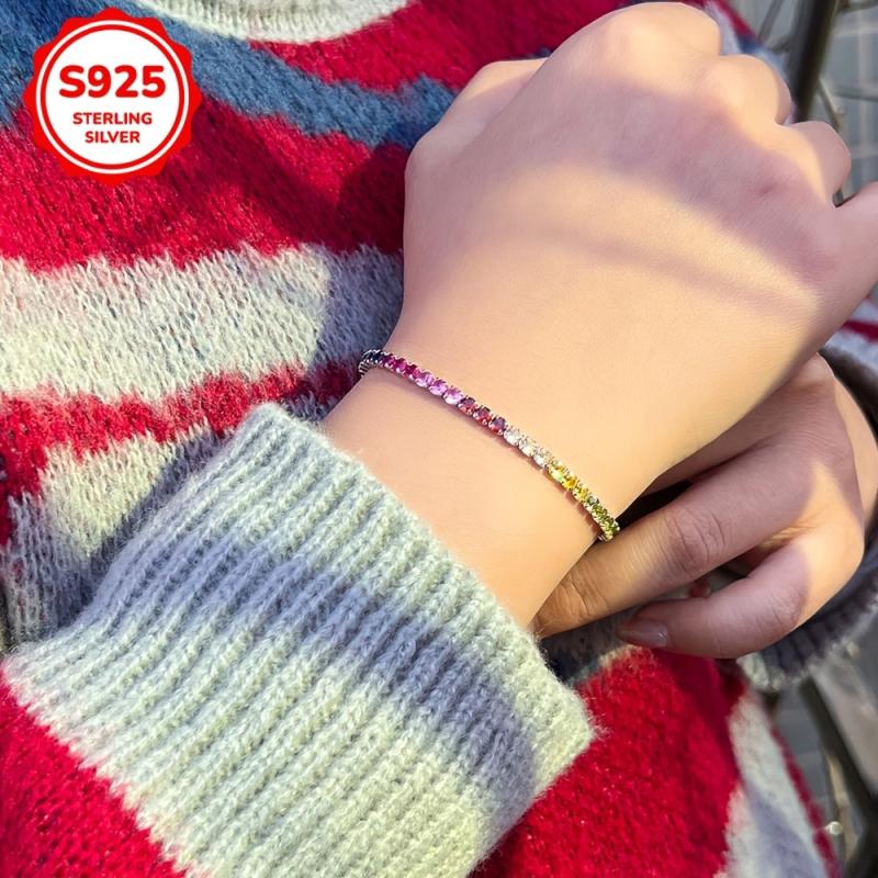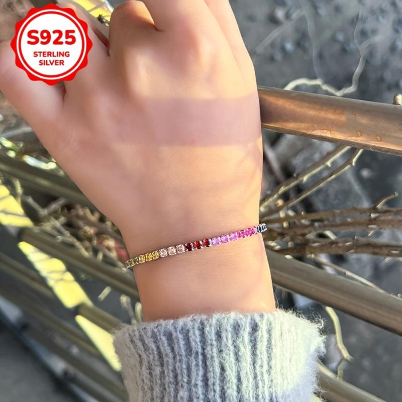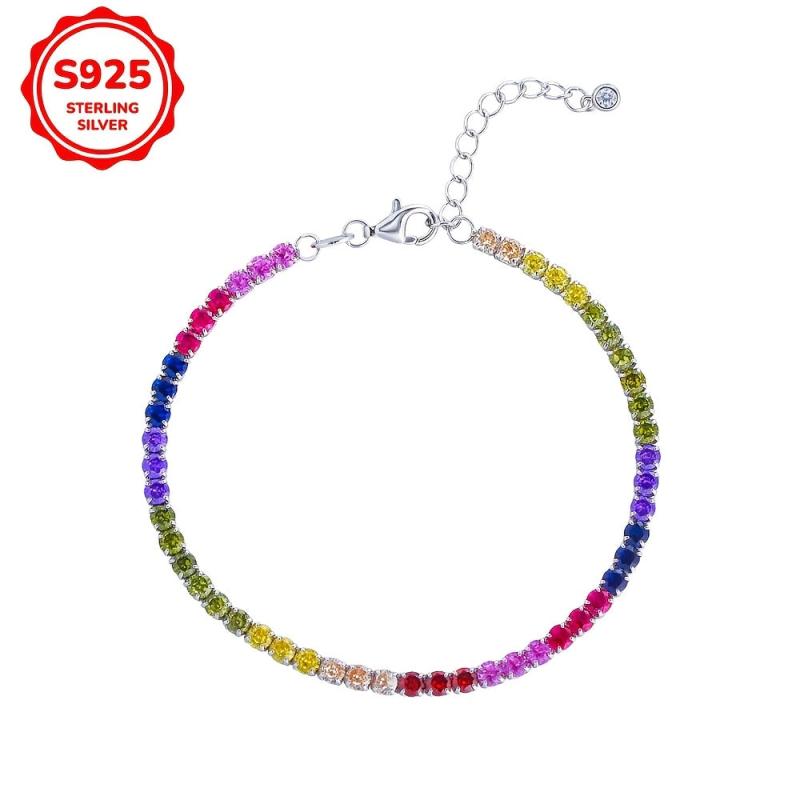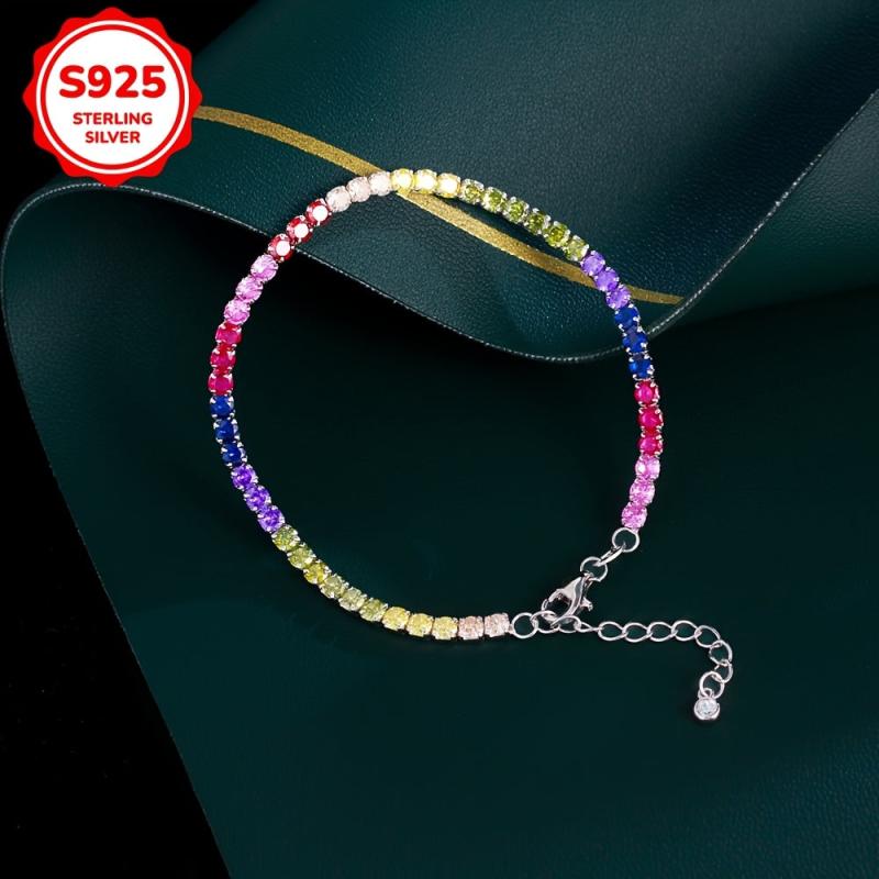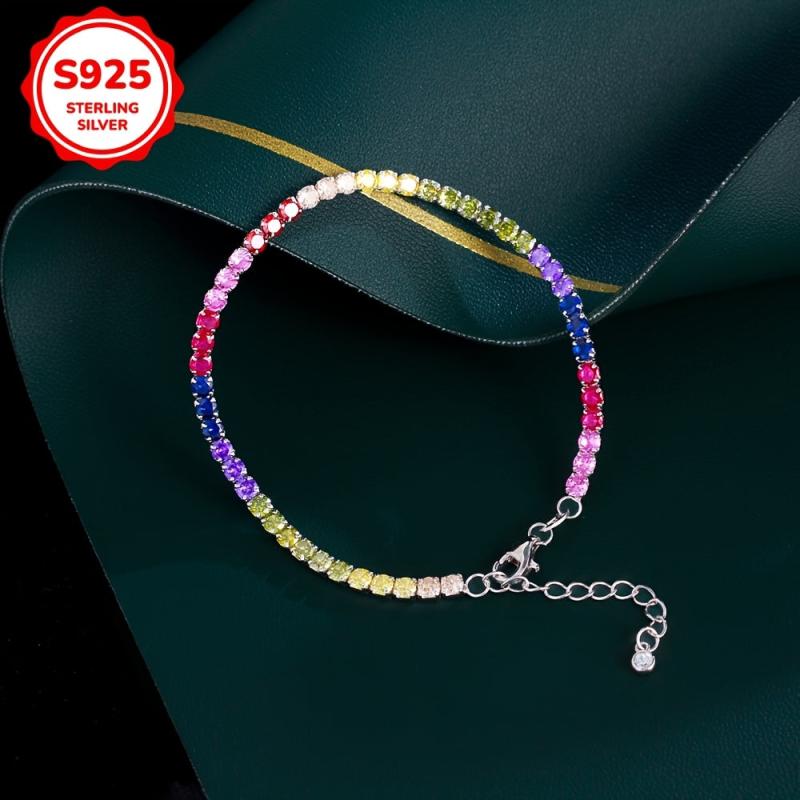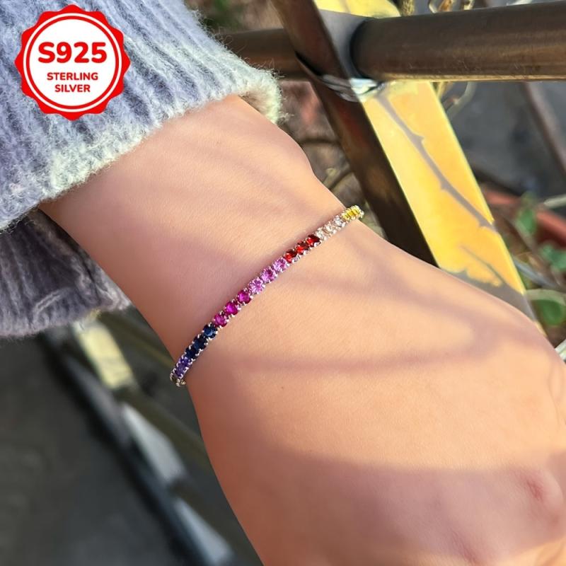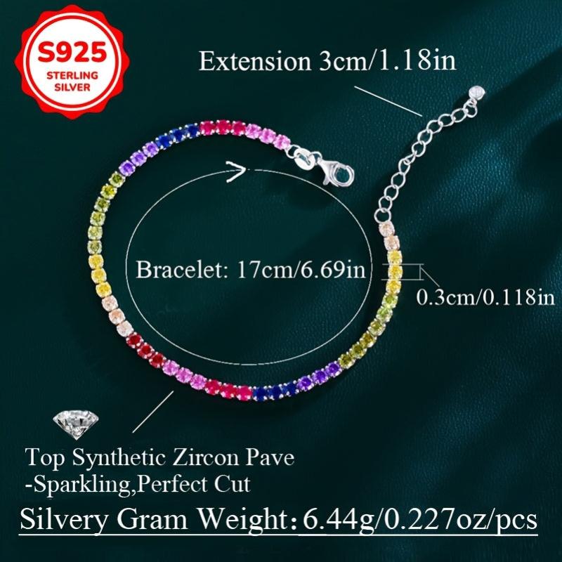 Add a pop of color to your outfit with this stunning rainbow tennis bracelet, crafted from high-quality 925 sterling silver and adorned with vibrant synthetic zirconia stones.