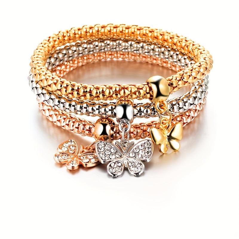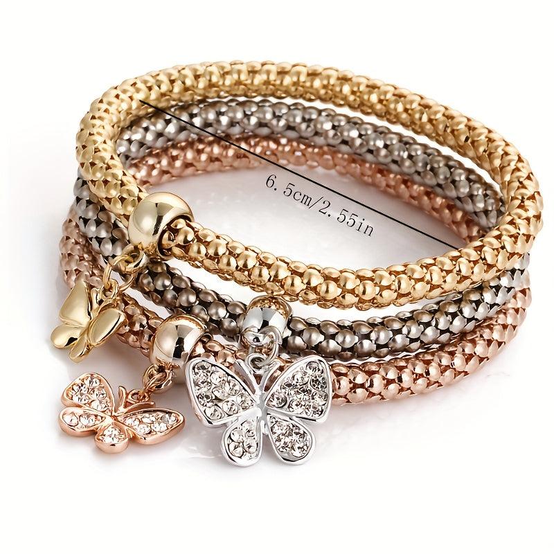 Stay stylish with this trendy three-chain bracelet set featuring a beautiful butterfly design embellished with shimmering rhinestones.