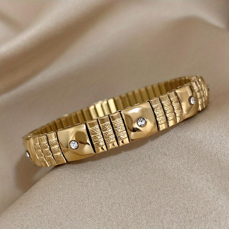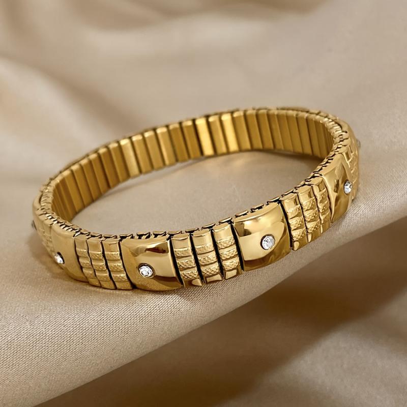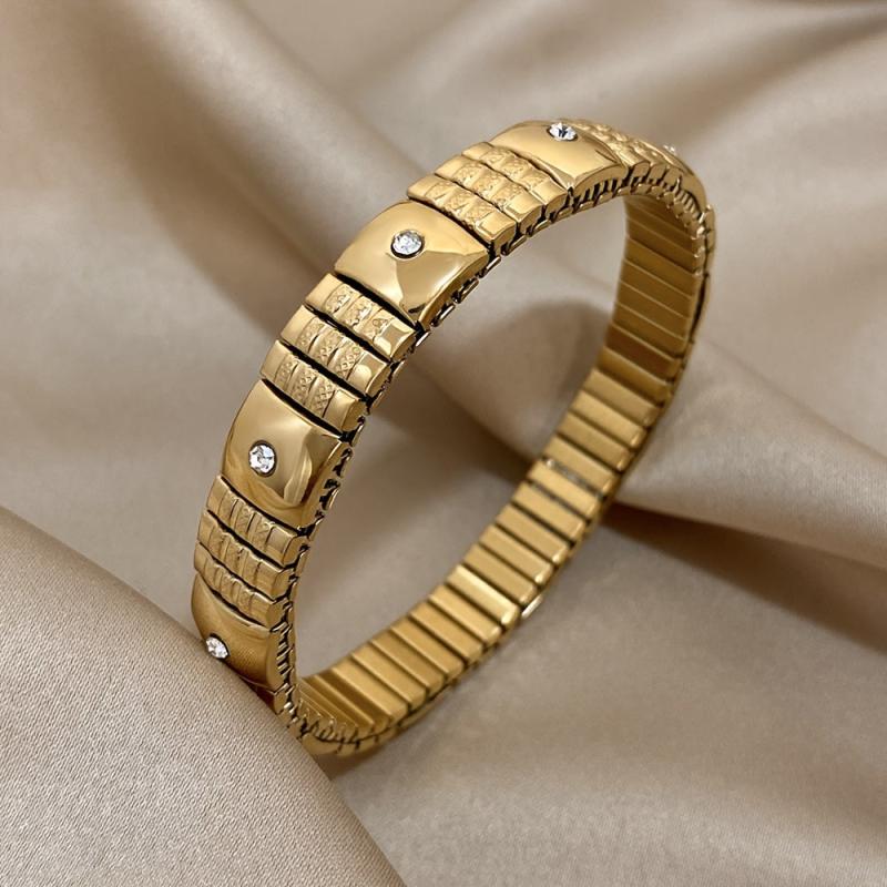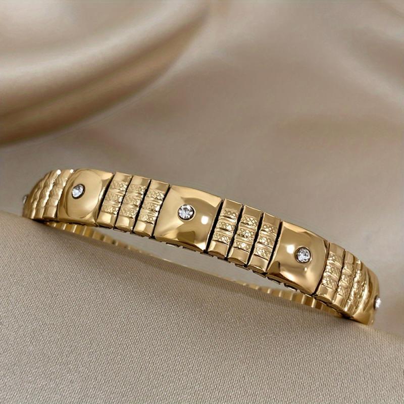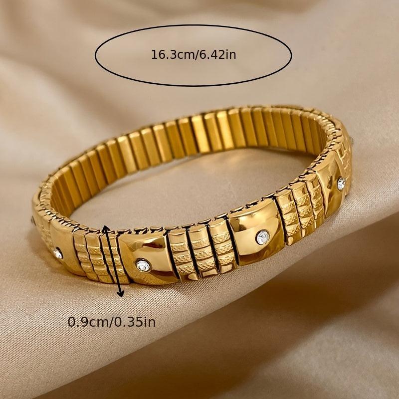 Elegant and stylish bracelet crafted from golden plated stainless steel with an elastic spring featuring embedded rhinestones. Ideal for both men and women.