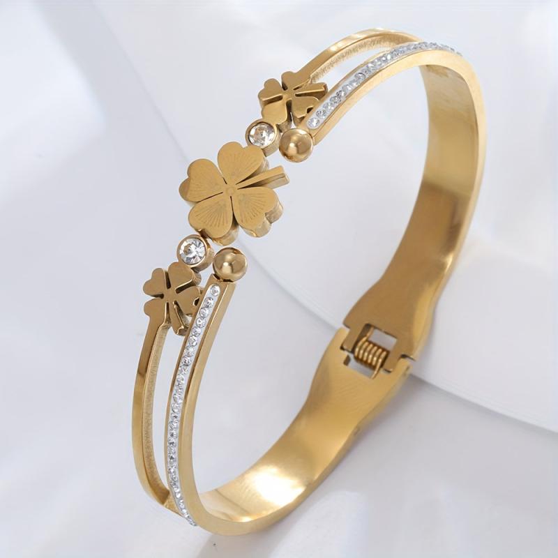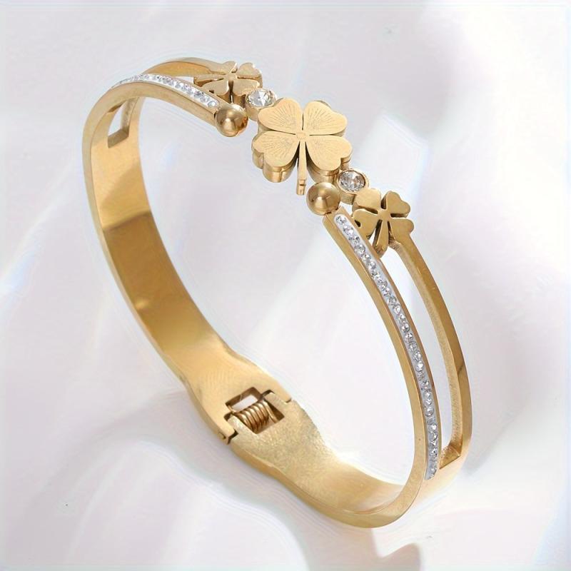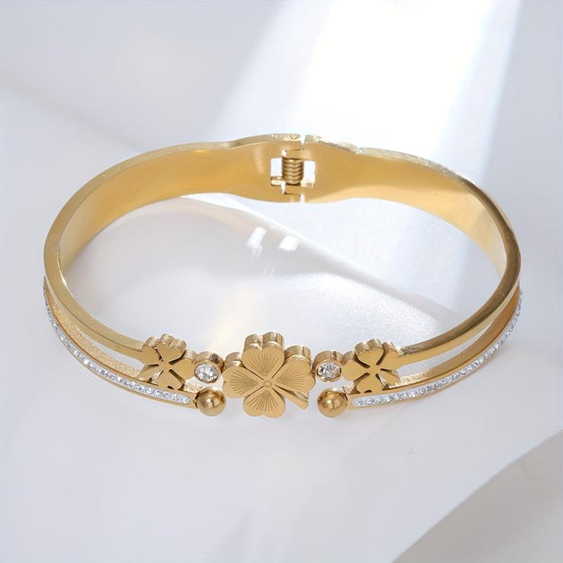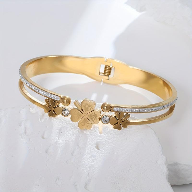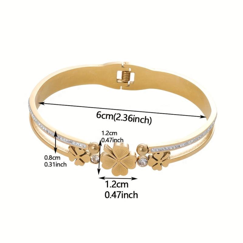 Add a touch of elegance to your outfit with this stainless steel bangle featuring rhinestone flower and leaf design. Perfect for daily wear, parties, prom, or vacations. Makes a great gift for women.
