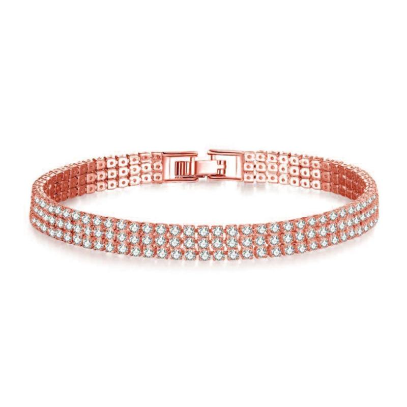 This stunning three-row bracelet features sparkling crystals and a secure clip lock clasp. Perfect gift for birthdays and anniversaries.