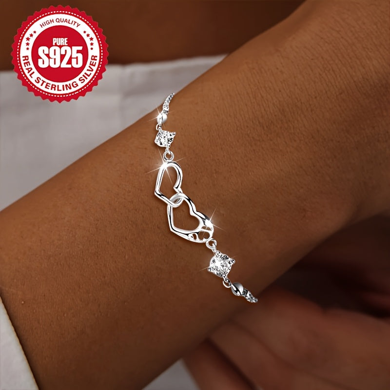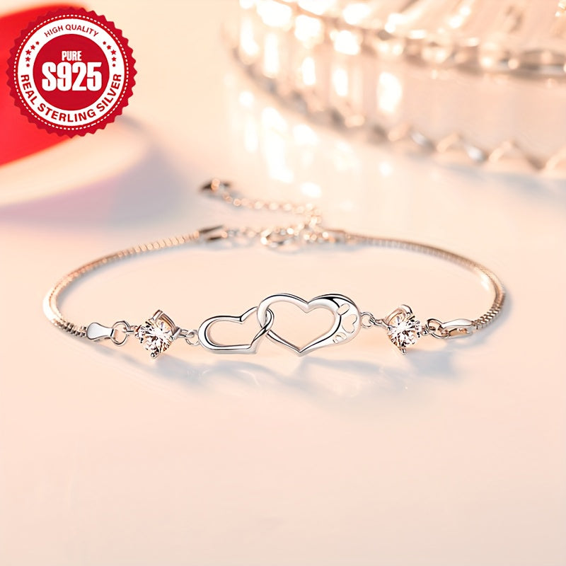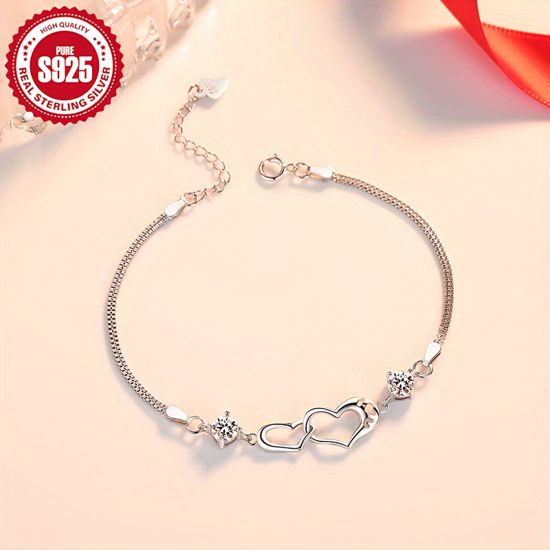 This stylish and minimalist bracelet features double hearts adorned with zirconia, making it a perfect gift for Valentine's Day and Mother's Day. Hypoallergenic and bling bling design.