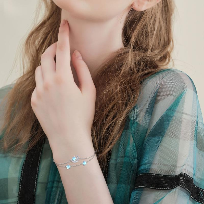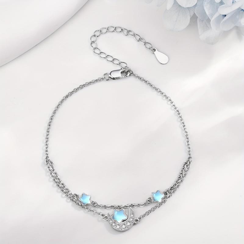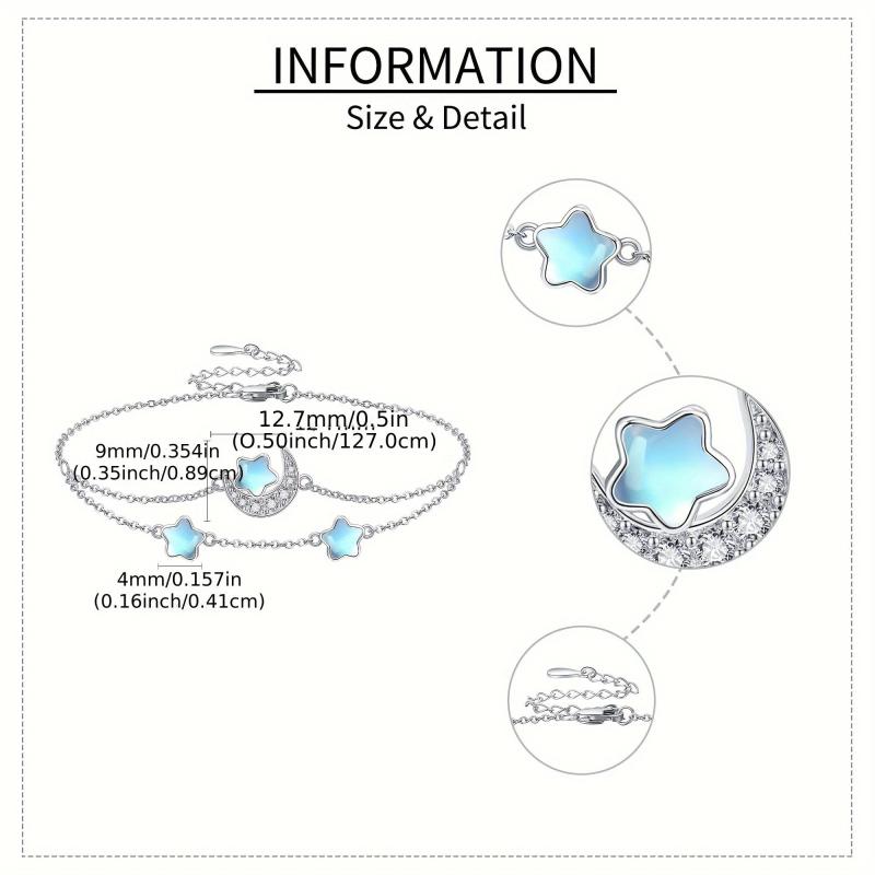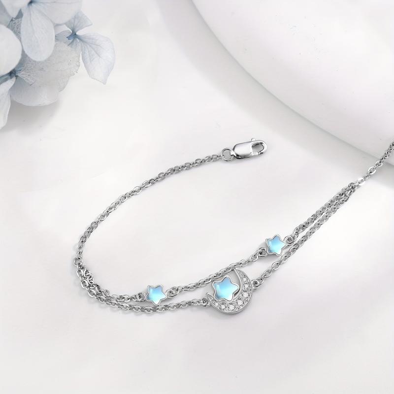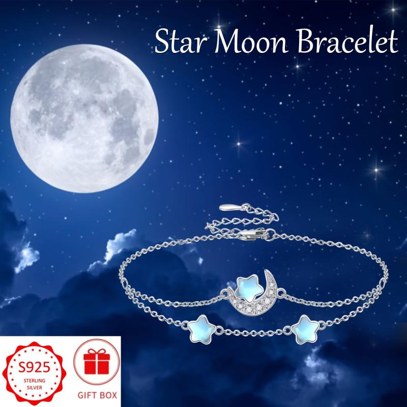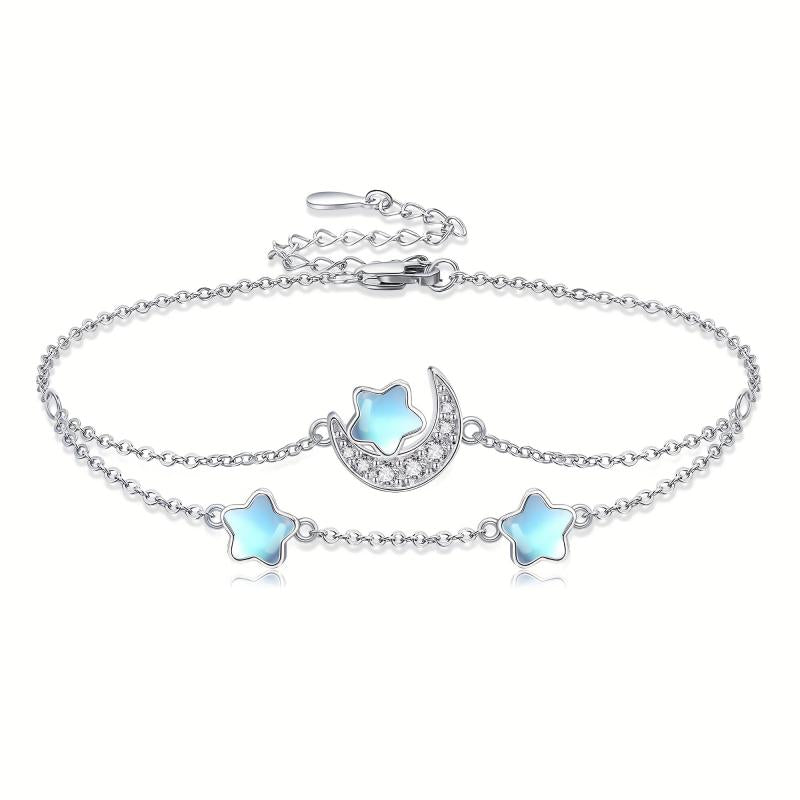 Elegant moon and star link bracelet featuring artificial moonstone. This S925 sterling silver bracelet is a perfect addition to your jewelry collection. Comes in a beautiful gift box.