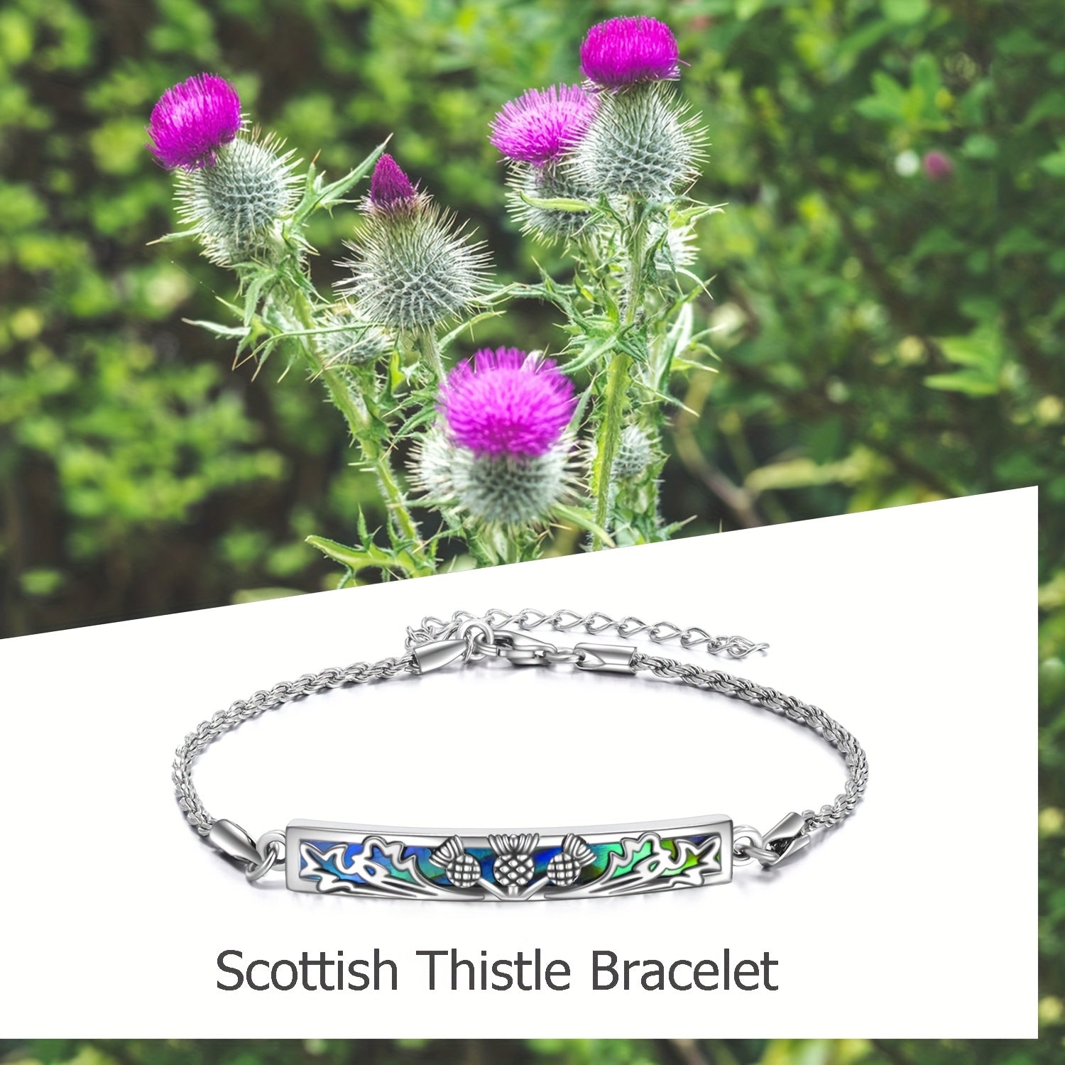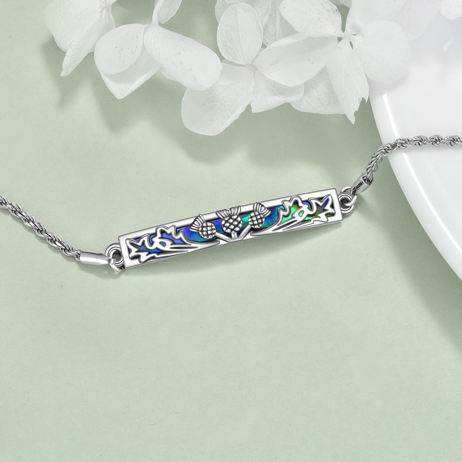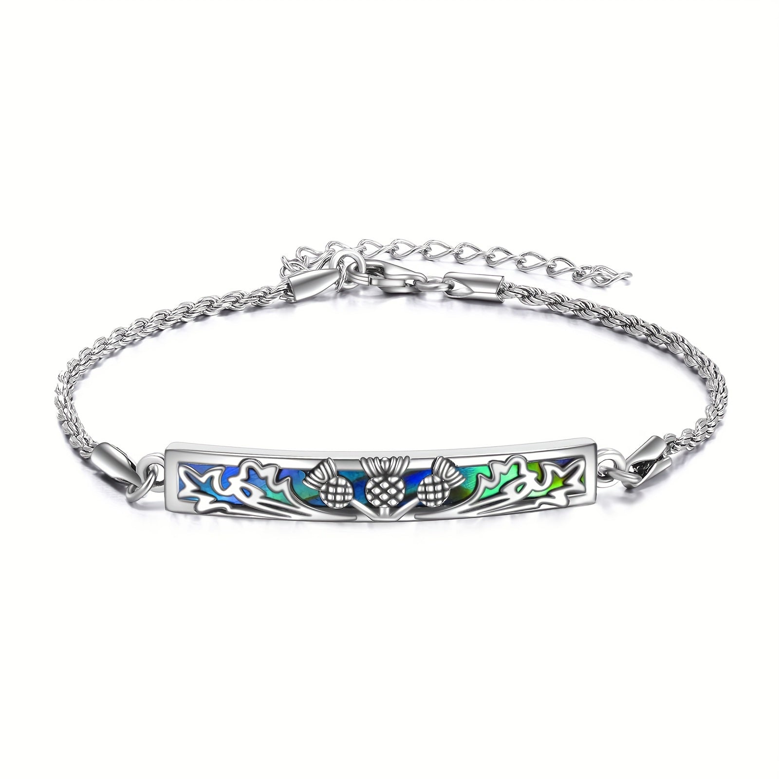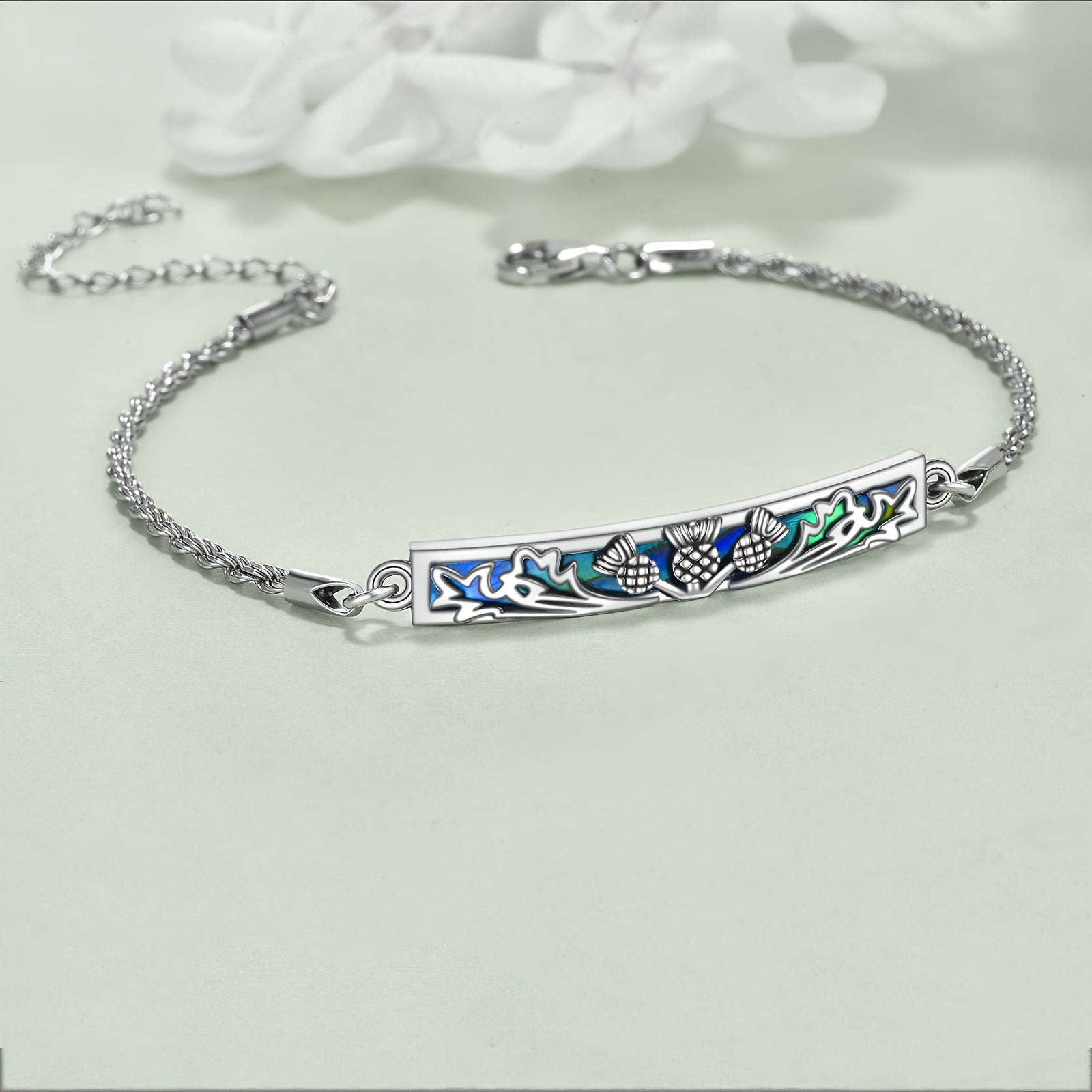 This stunning Scottish Thistle bracelet is made with 925 sterling silver and features beautiful abalone shell accents. It's a natural element jewelry piece that makes a perfect gift for women.