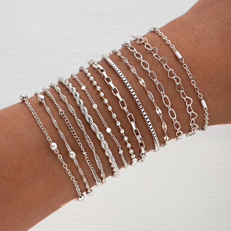 This set includes 13 basic stacked hollow love heart bracelets, perfect for girls' daily outings or dating. The silvery finish adds a touch of vintage charm to any outfit.