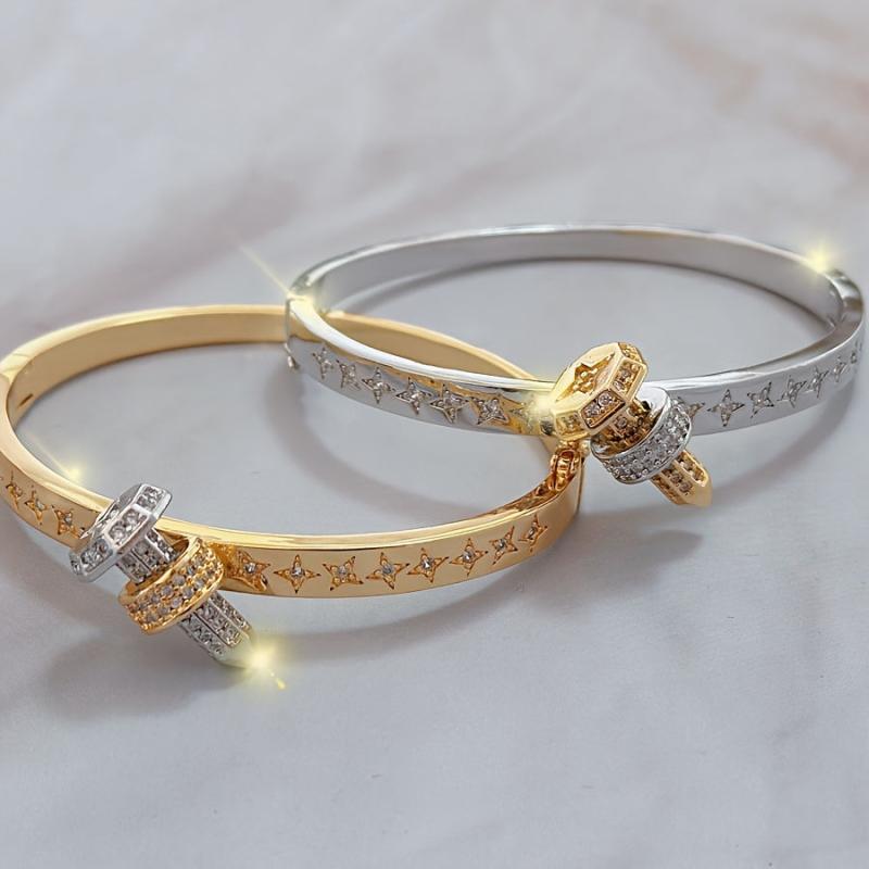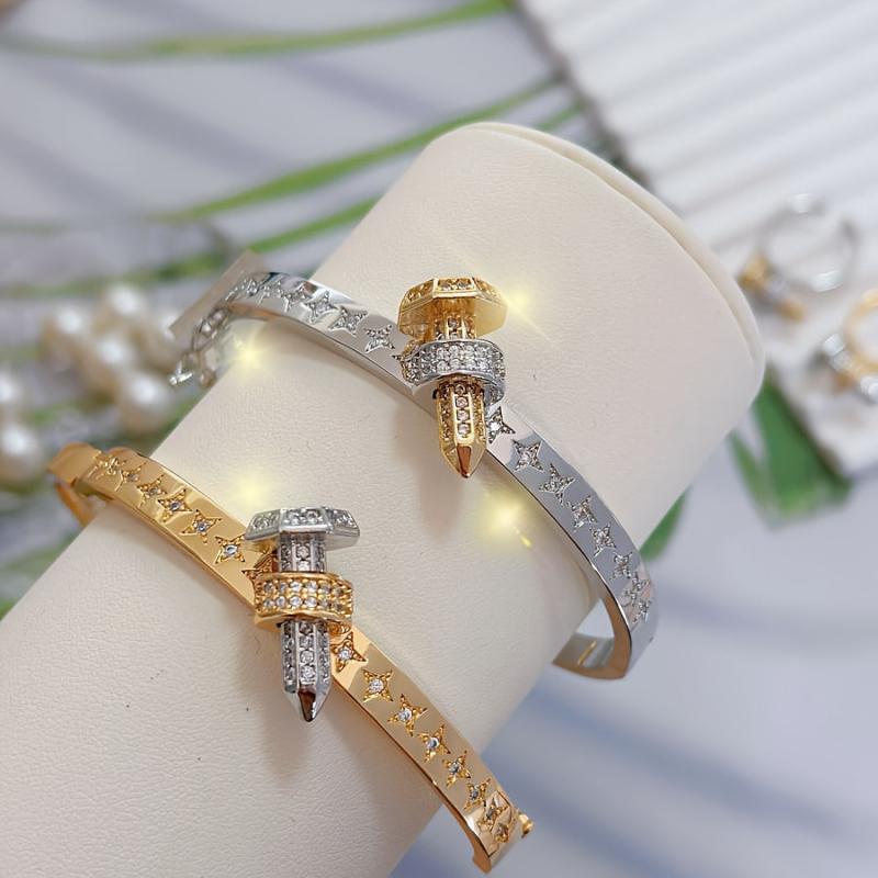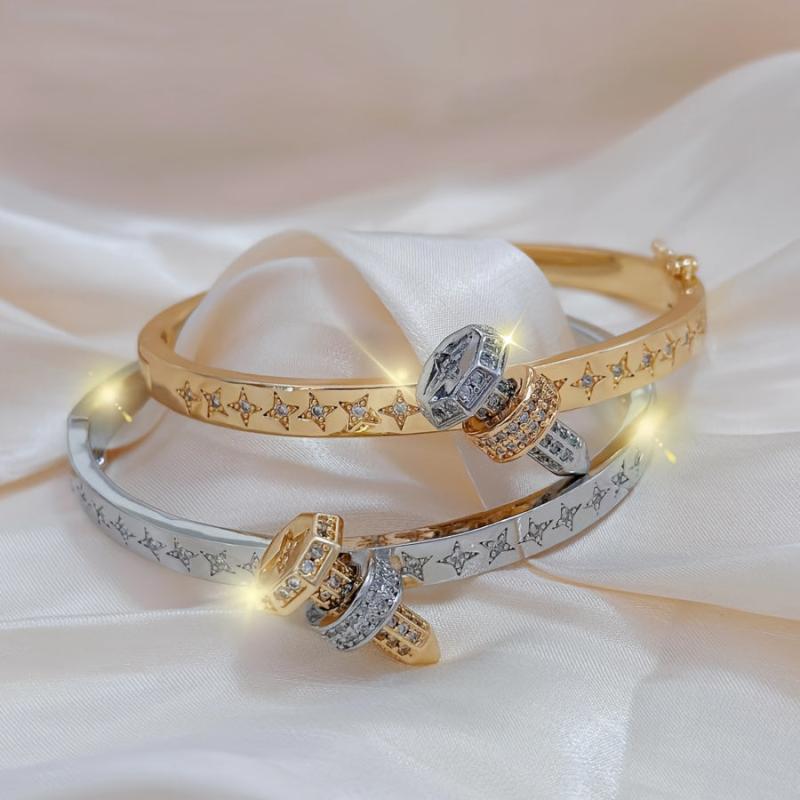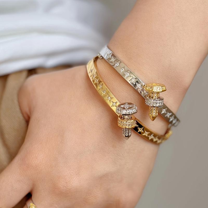 Add a touch of sparkle to your look with this unique nail-shaped bracelet featuring a sparkling star carving pattern. Perfect for fashion-forward girls.