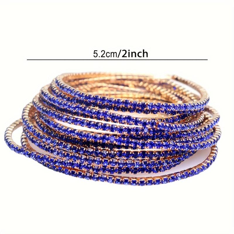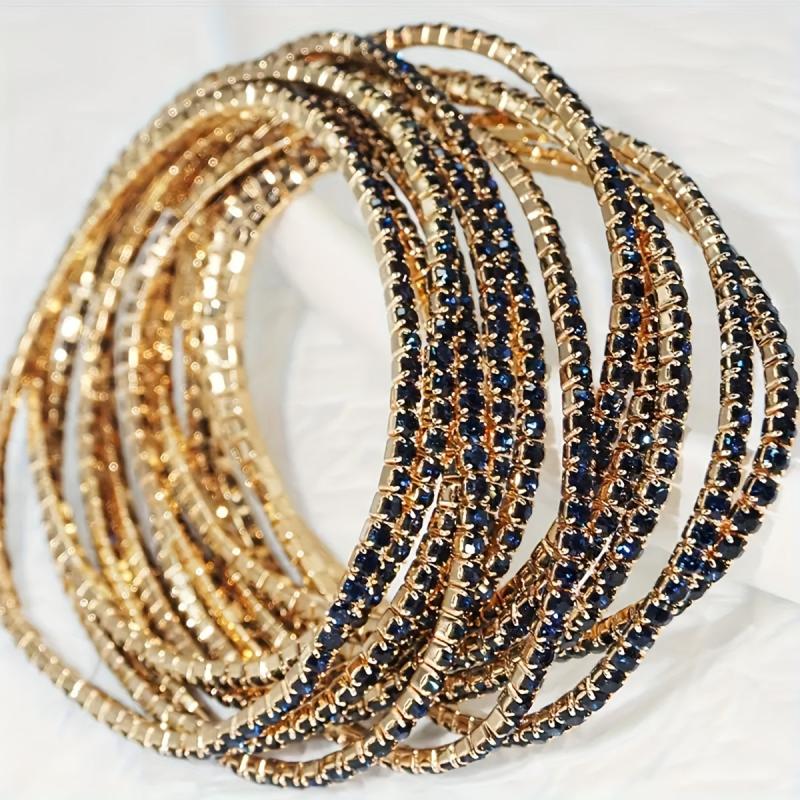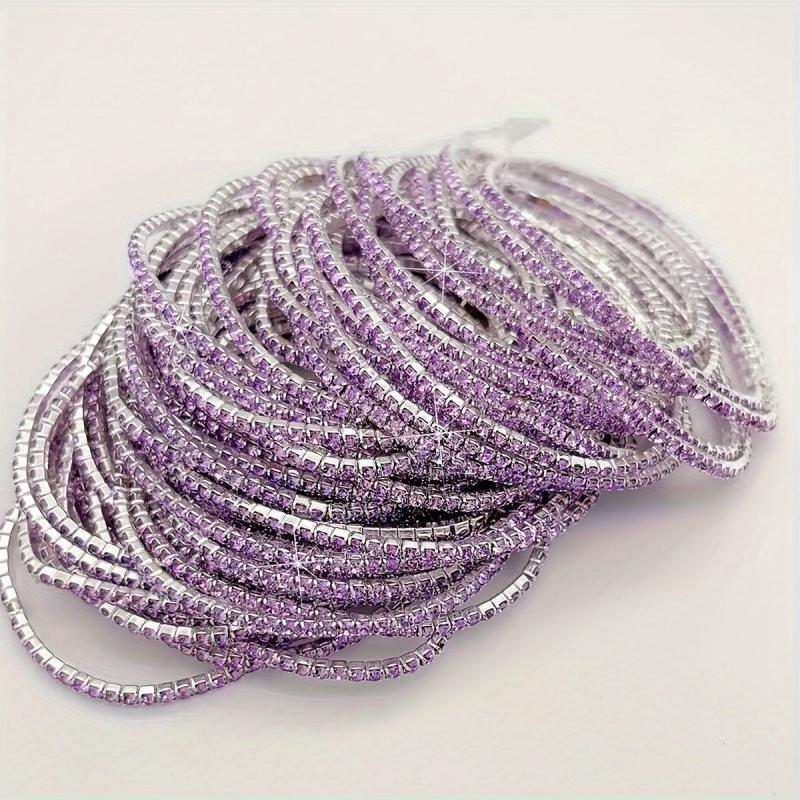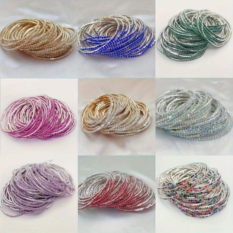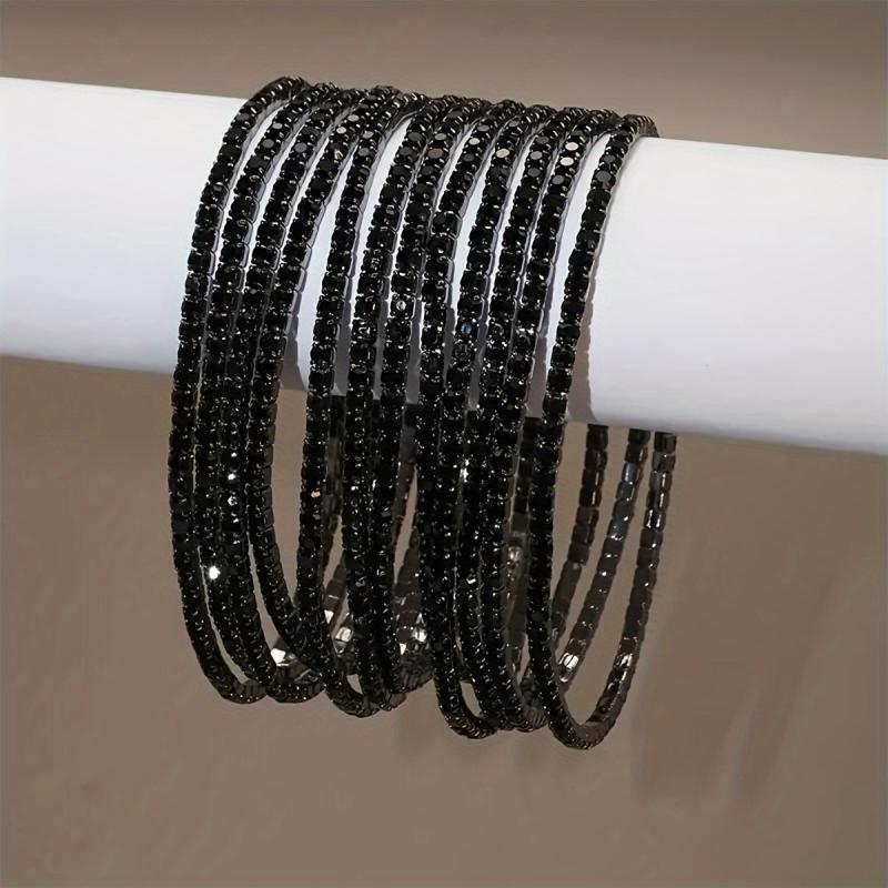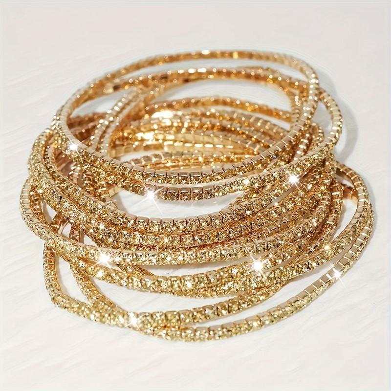 Add some glamour to your look with this set of 12 sparkling rhinestone tennis bracelets. These stretchy bracelets are perfect for casual attire or parties, adding a touch of elegance and sparkle to your outfit.