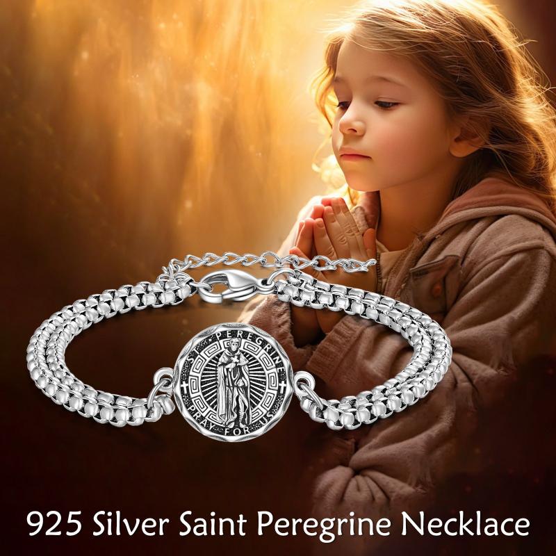 This Saint Peregrine bracelet is crafted from sterling silver and is a religious protector bracelet symbolizing St. Peregrine. It makes a meaningful gift for both women and men.