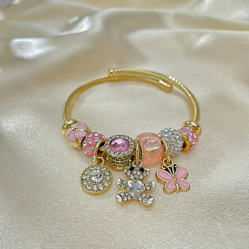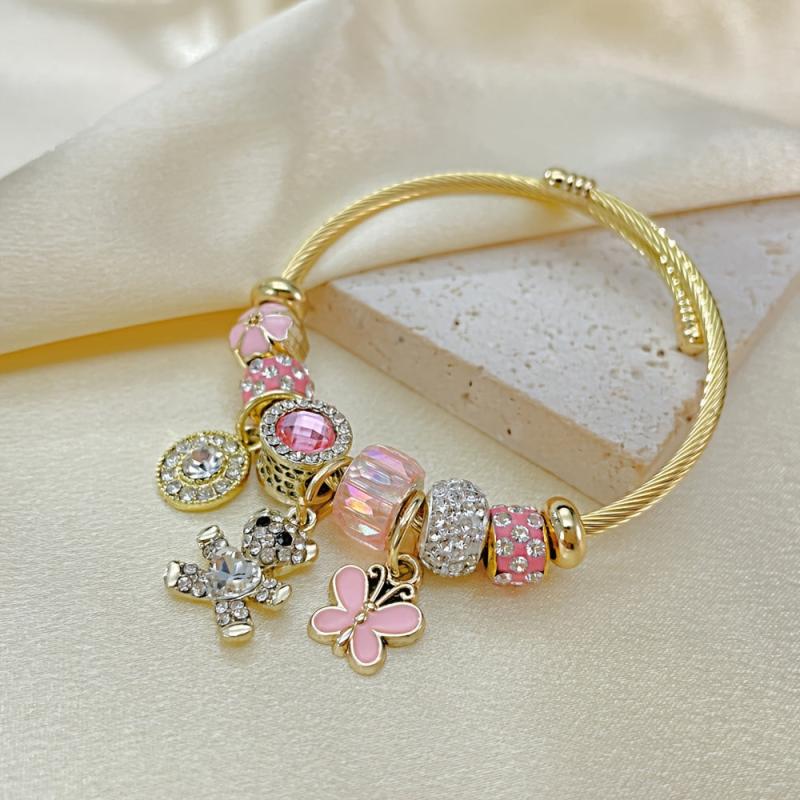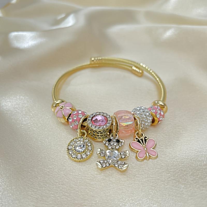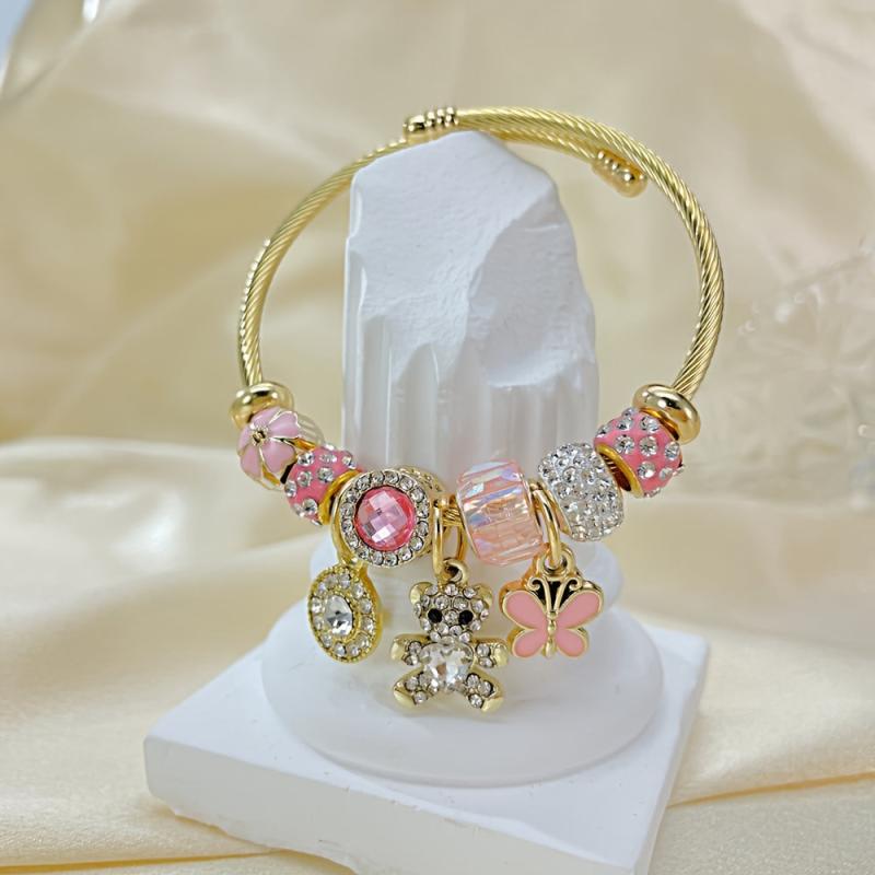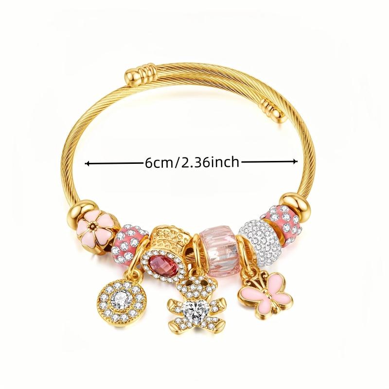 This stainless steel cuff bracelet features adorable heart, bear, and flower designs with crystal and zirconia charms, perfect for casual attire.