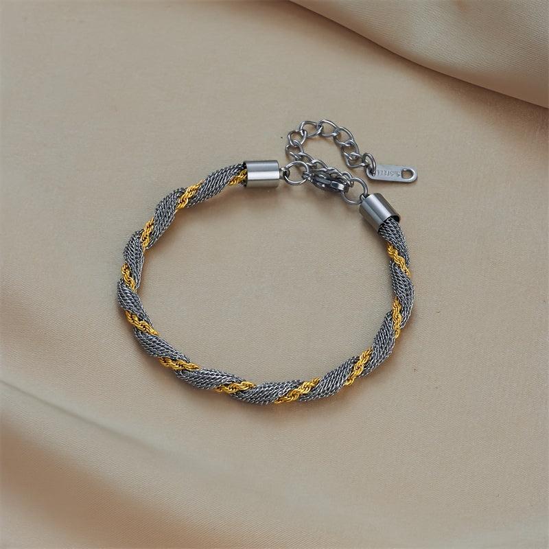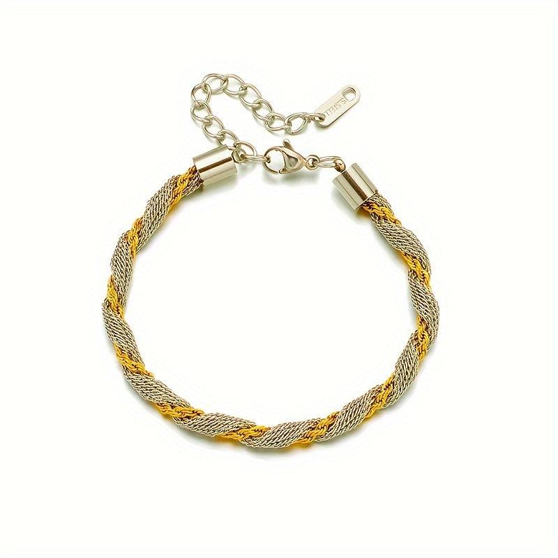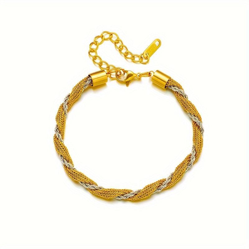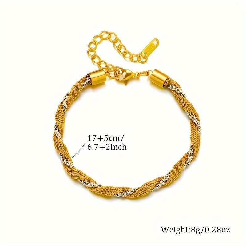 This stylish bracelet is designed for both daily wear and party occasions. It features a hip hop punk design with a two-tone twisted link chain, made of stainless steel and plated with 18K gold.