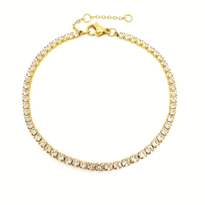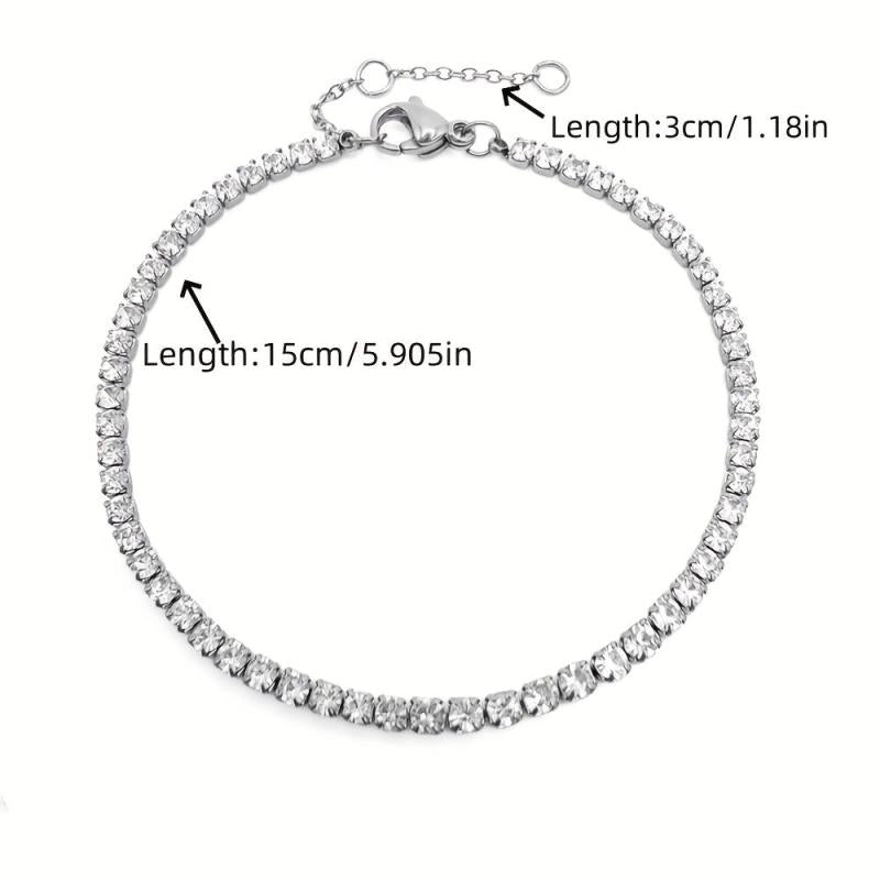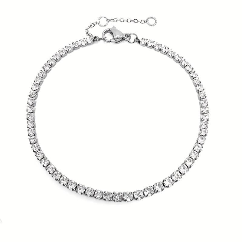 Elegant women's tennis bracelet made of stainless steel with dazzling rhinestones and a round crystal charm.