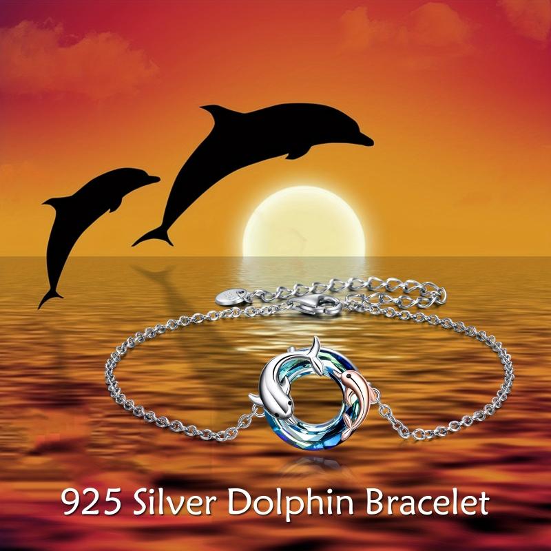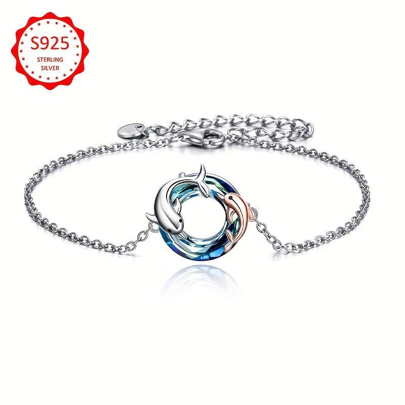This dolphin bracelet is made of sterling silver and features an artificial crystal dolphin charm. It is a beautiful piece of ocean-themed jewellery for women.
