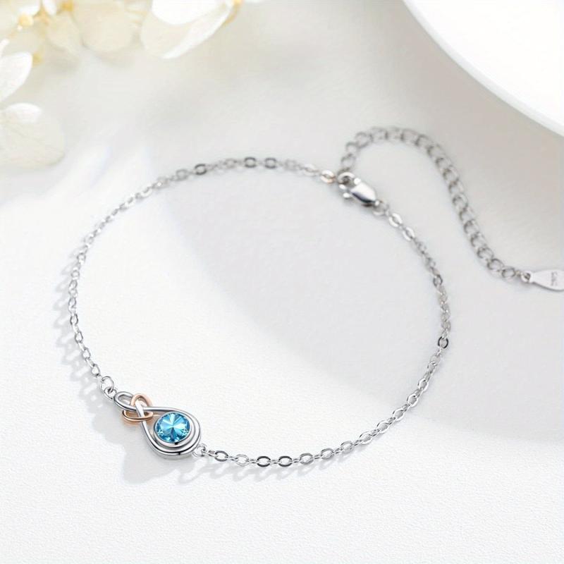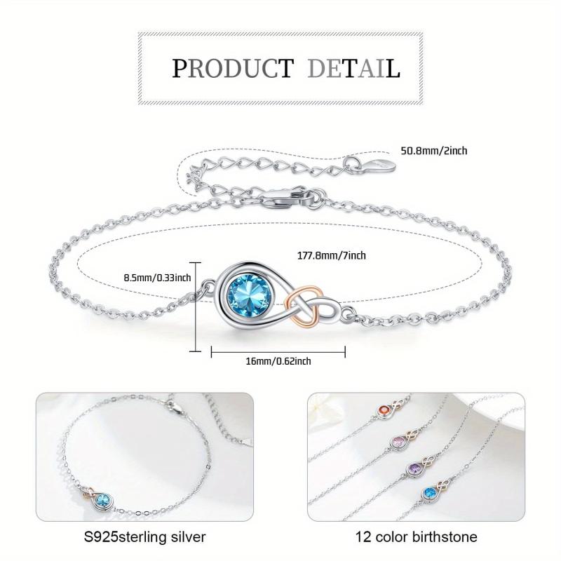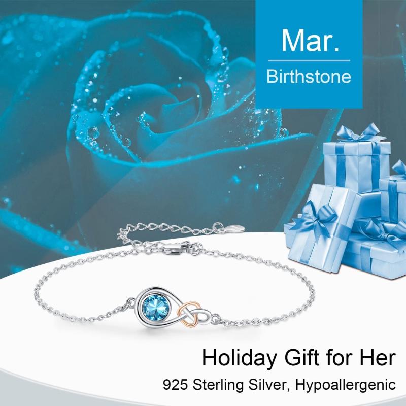 This elegant 925 sterling silver bracelet features an infinity symbol design and a beautiful March birthstone charm. It is adjustable to fit most wrist sizes and makes a perfect birthday gift for her.