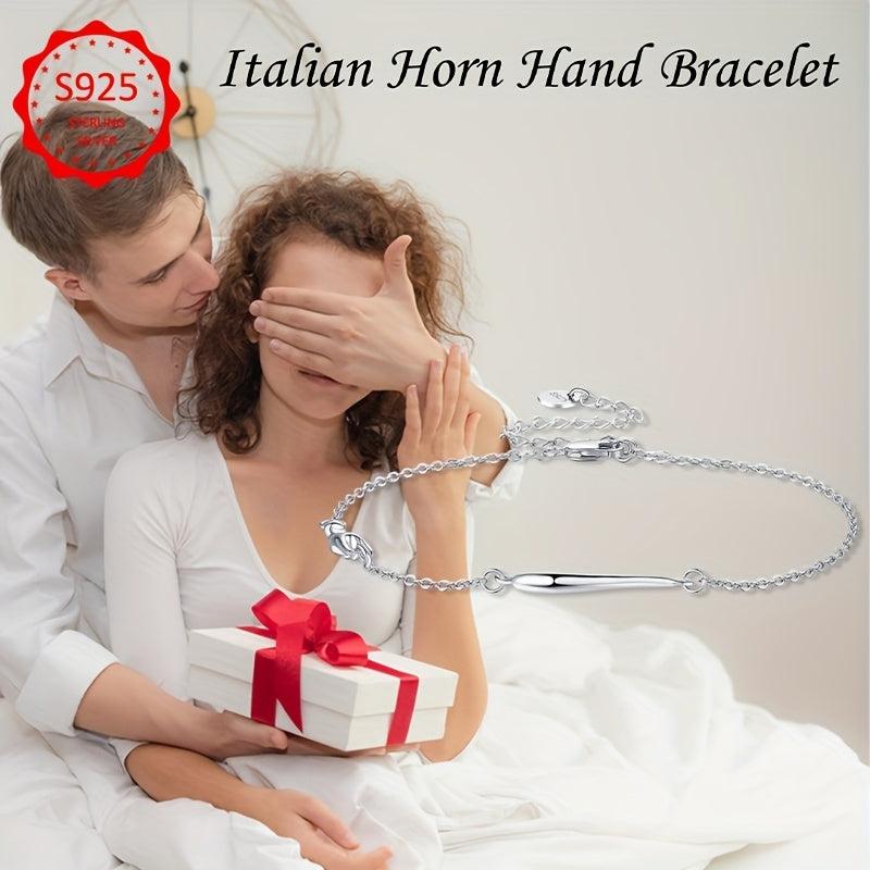 This Italian horn hand bracelet is a symbol of good luck and protection. Made of sterling silver, it is a beautiful amulet jewellery piece for women.