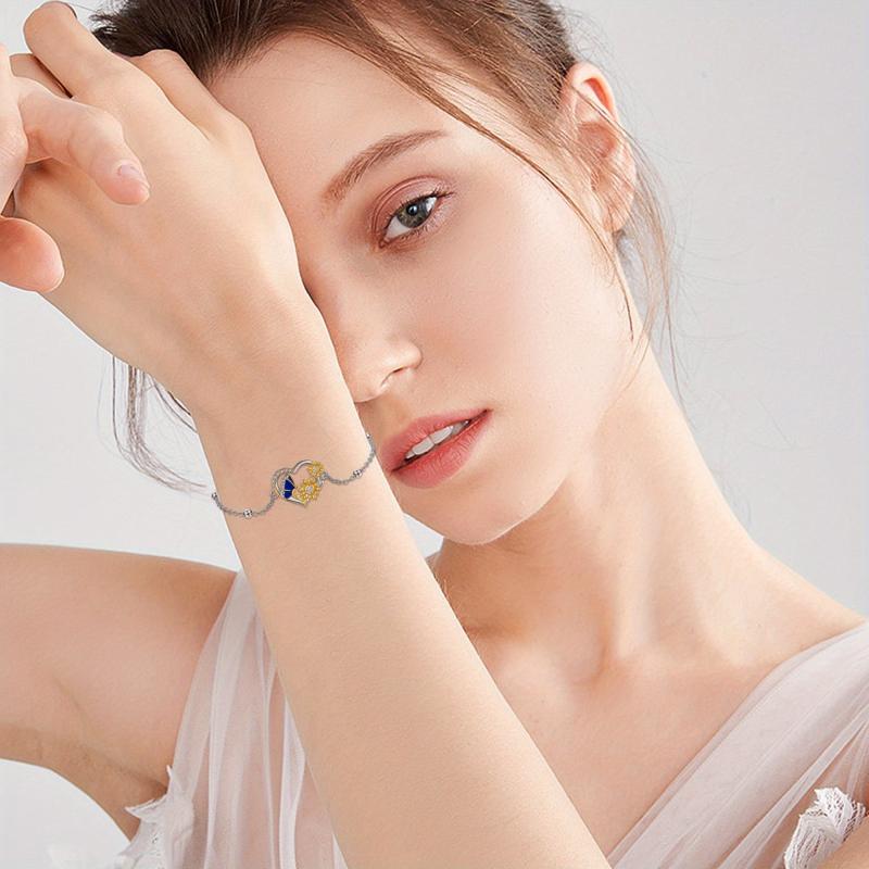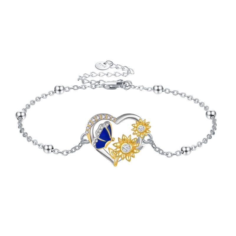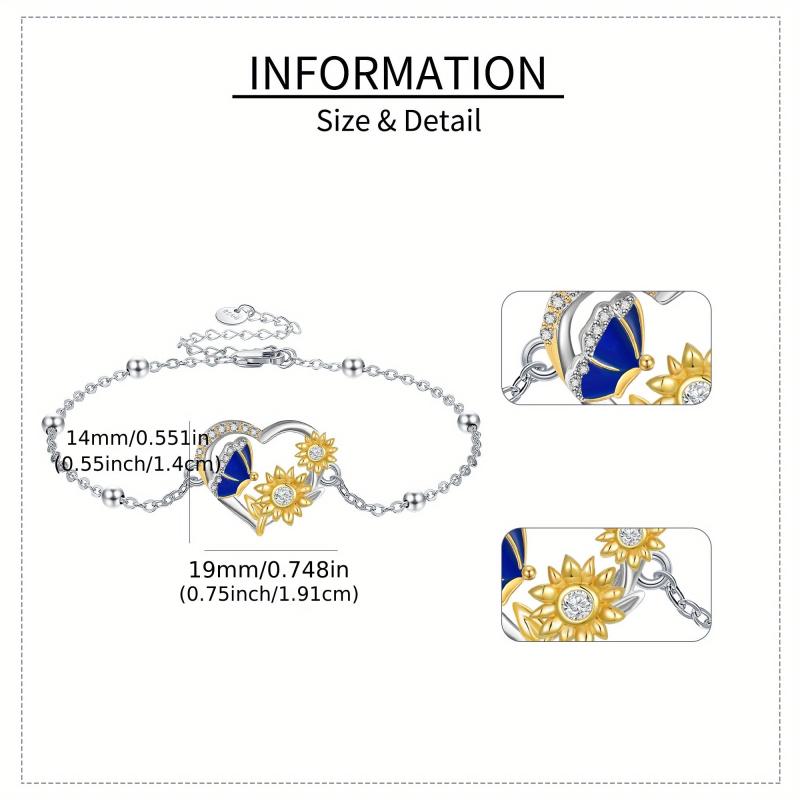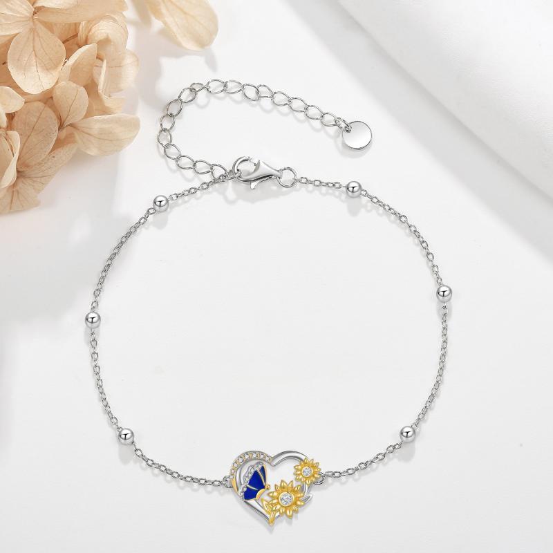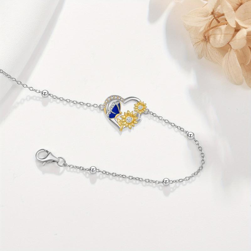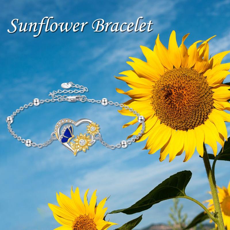 Adorn your wrist with this beautiful sterling silver sunflower bracelet featuring a butterfly heart pendant. Perfect sunflower jewelry for women.