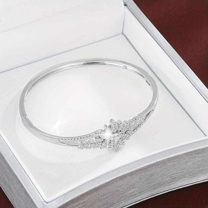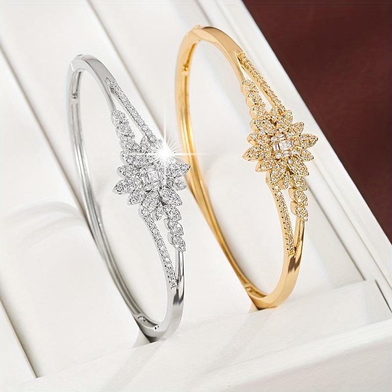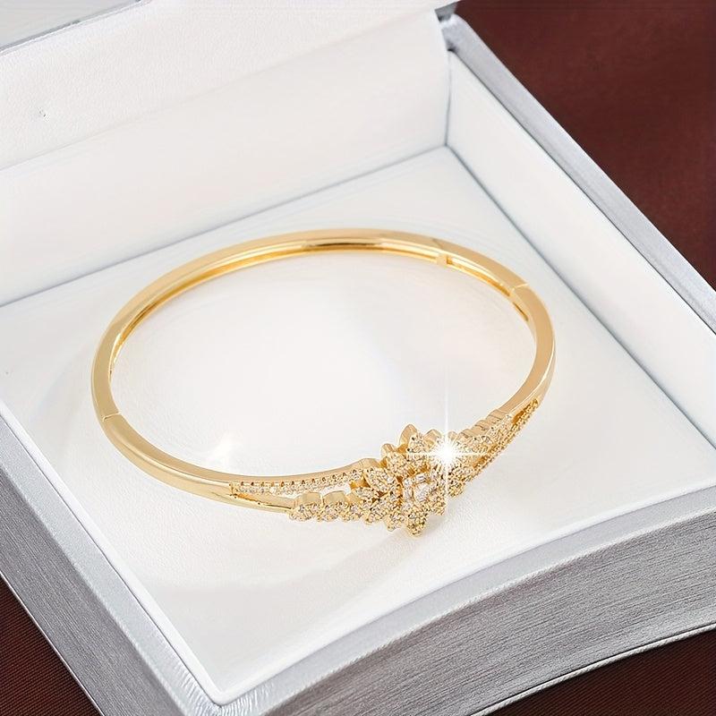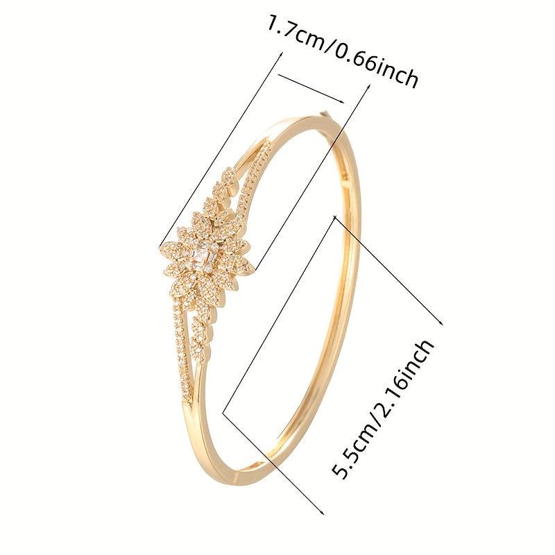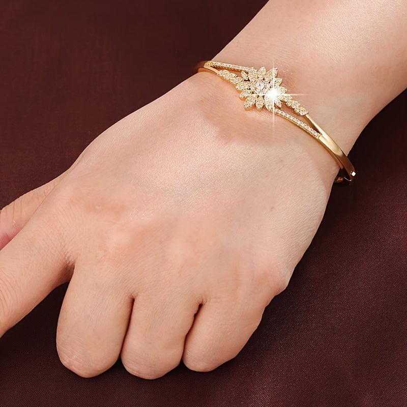 Elegant bracelet featuring sunflower design with synthetic zirconia stones set in golden tone copper. Perfect for daily wear or as a thoughtful gift for women.