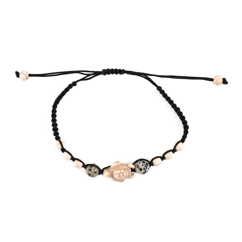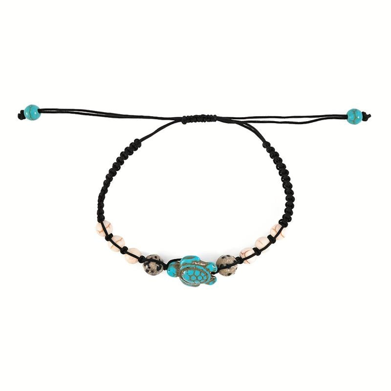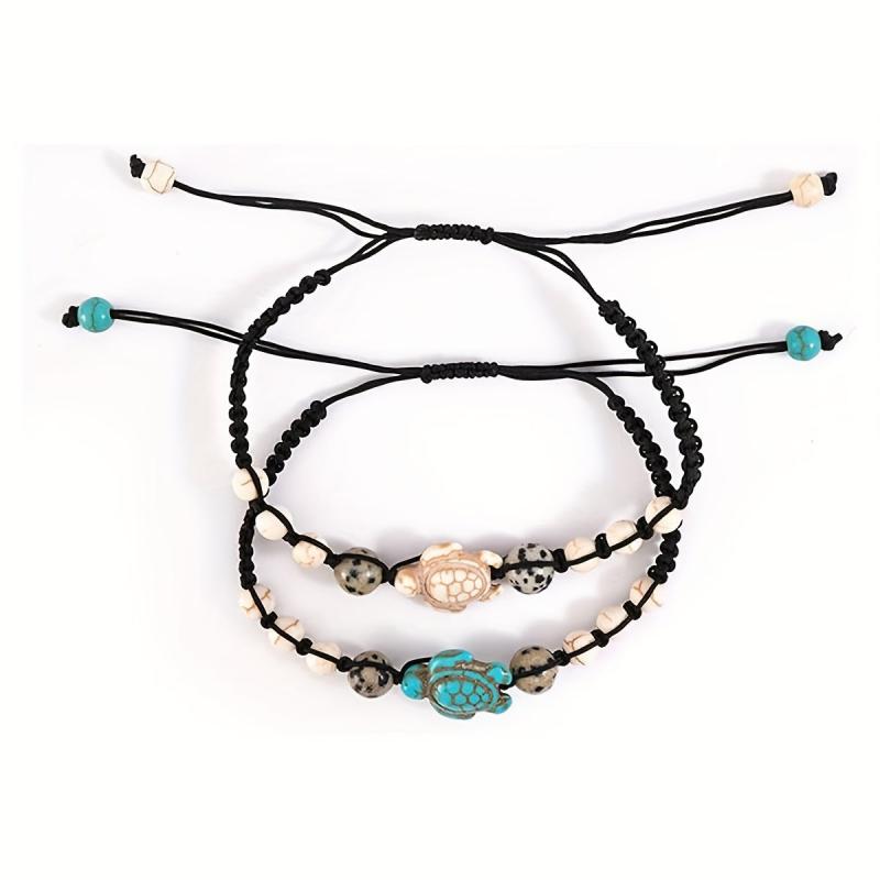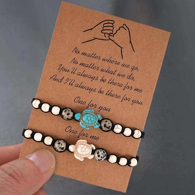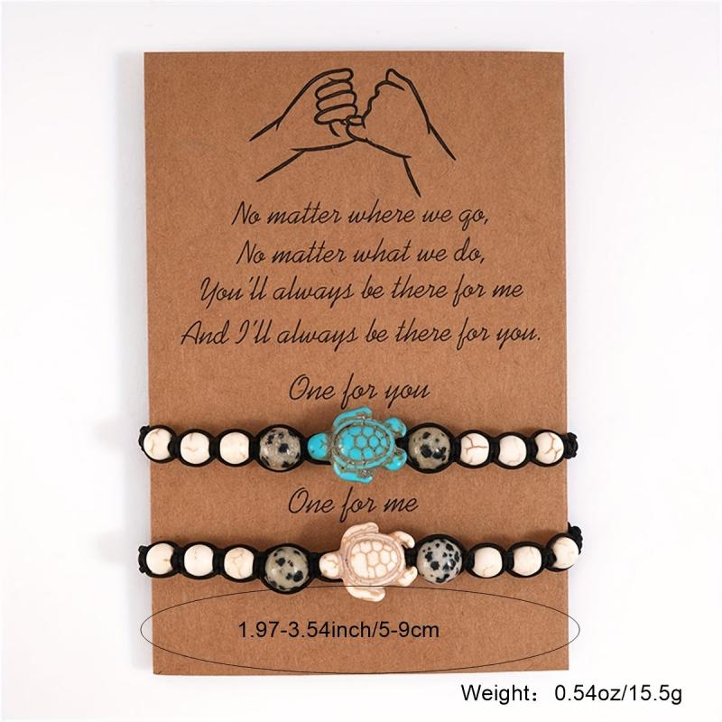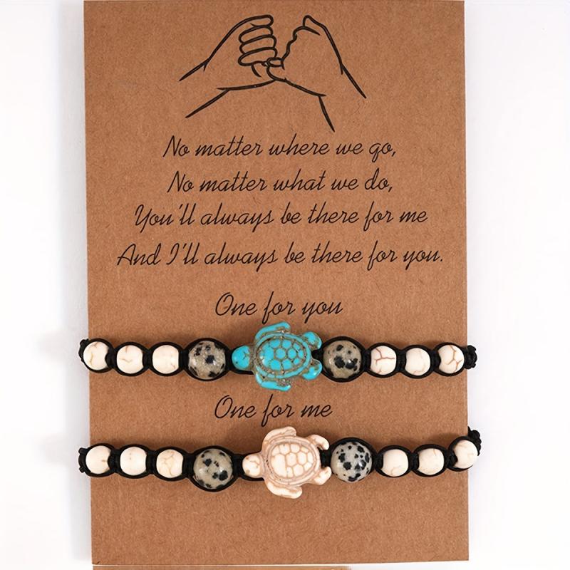 This set includes 2 handwoven bracelets with synthetic turquoise beads. Comes with a personalized note, making it a perfect gift for couples.