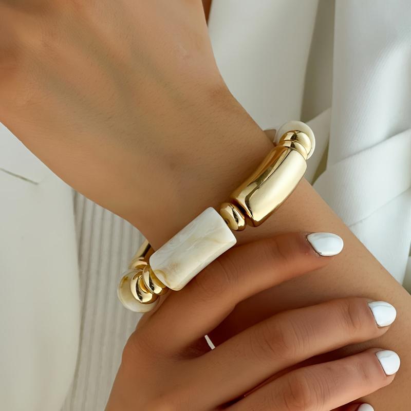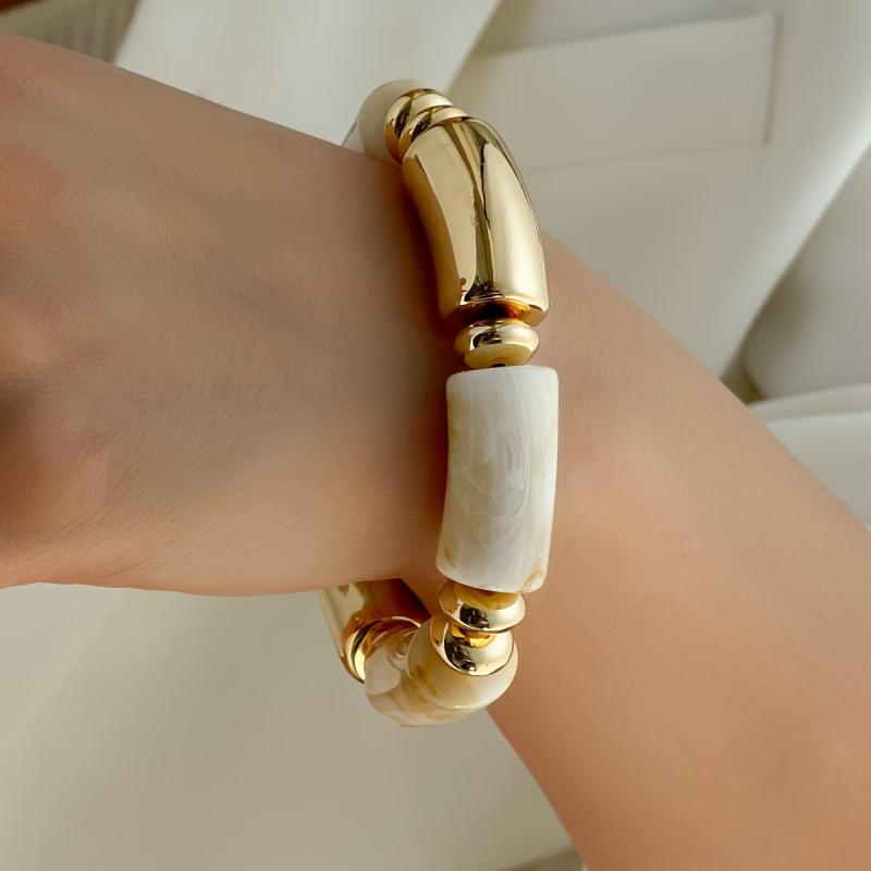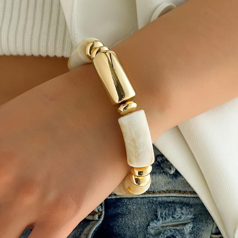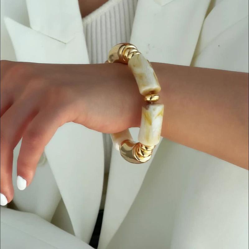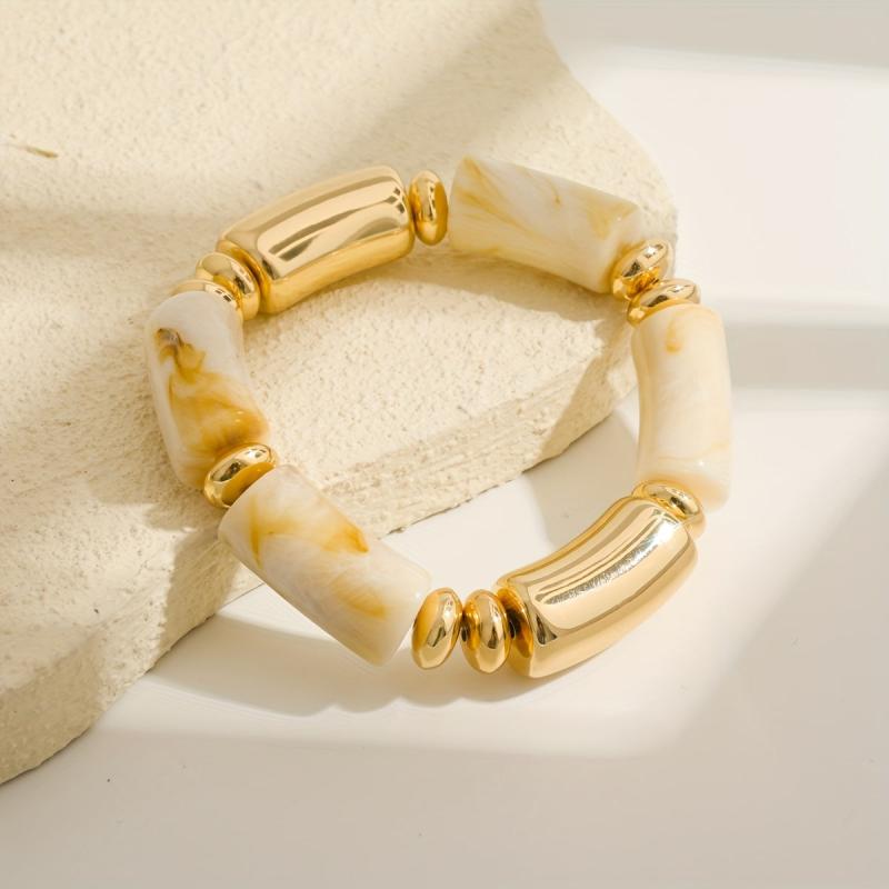 This vintage acrylic beaded bracelet features a layer of brown and golden tones, making it perfect for women and couples to wear daily. The bracelet is suitable for all seasons as an everyday accessory with a vintage style.