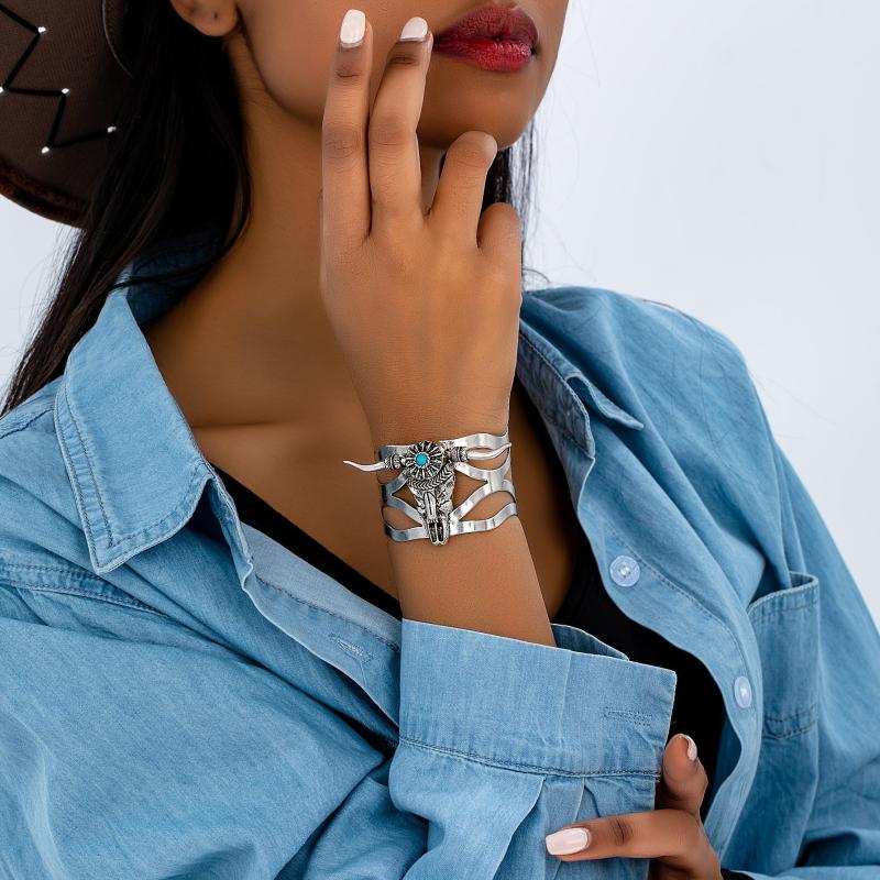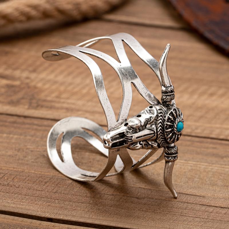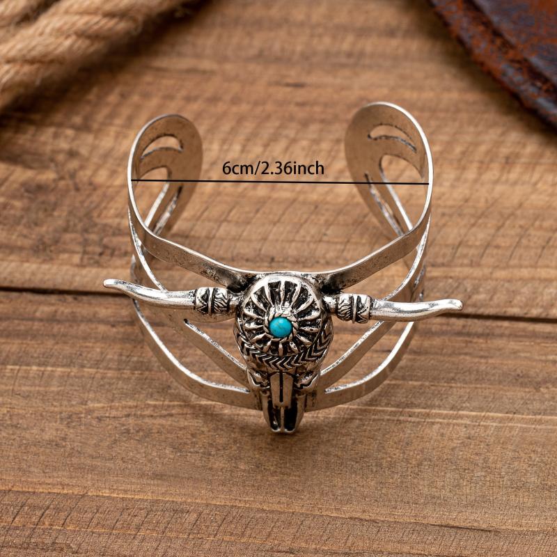 Add a touch of Western style to your outfit with this vintage cuff bracelet. Features a bull head design with turquoise inlay. Made of zinc alloy, this open bangle is a fashionable statement piece for daily wear.