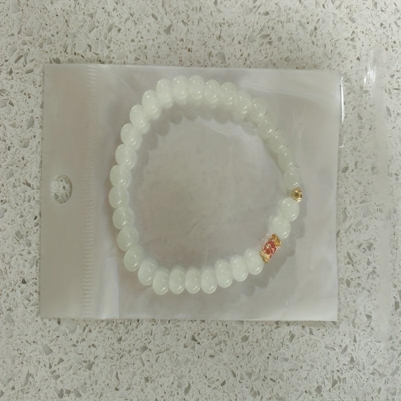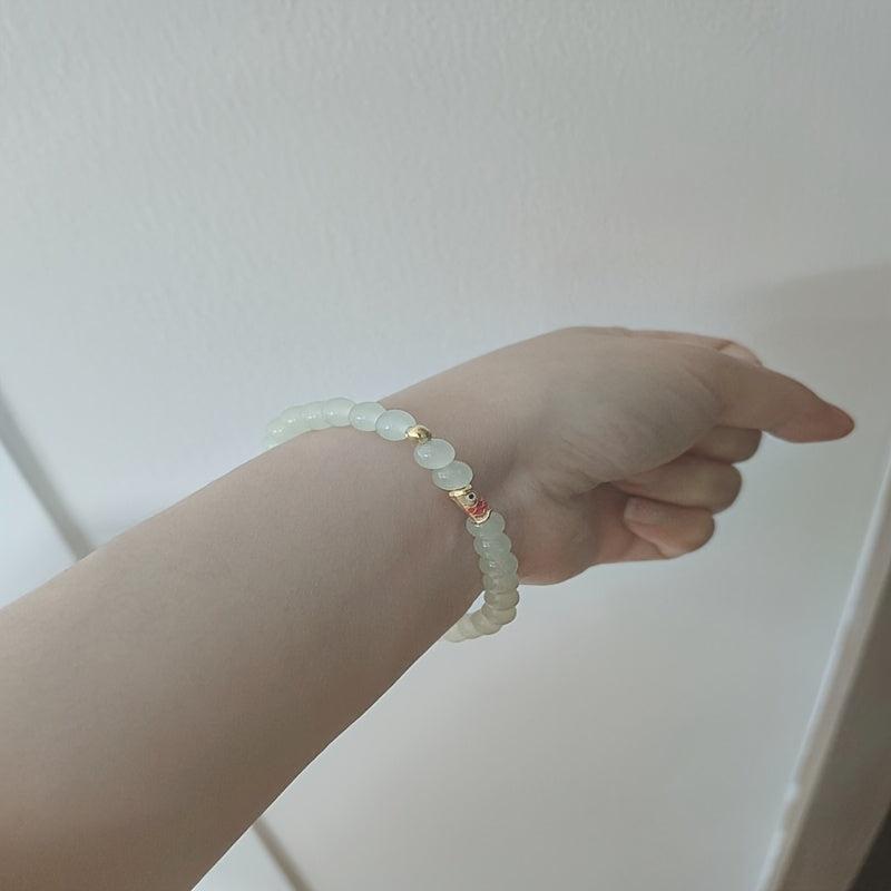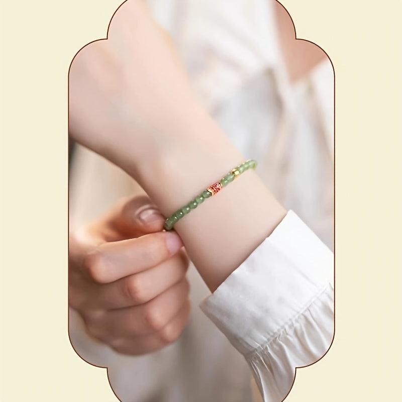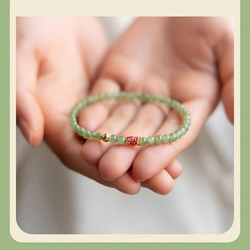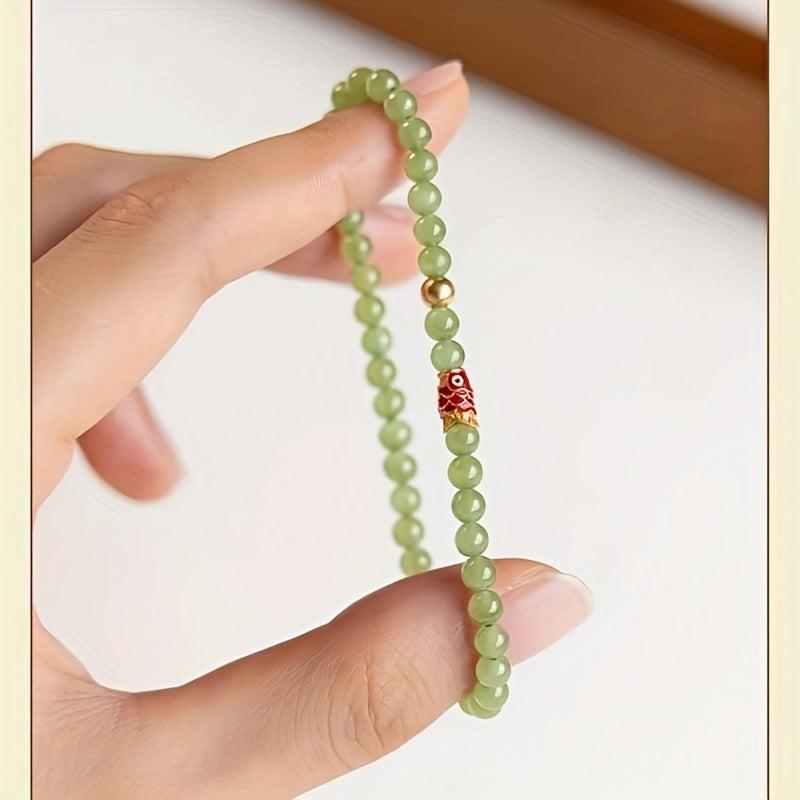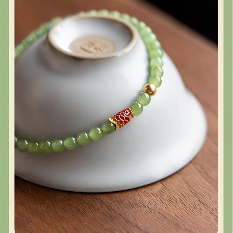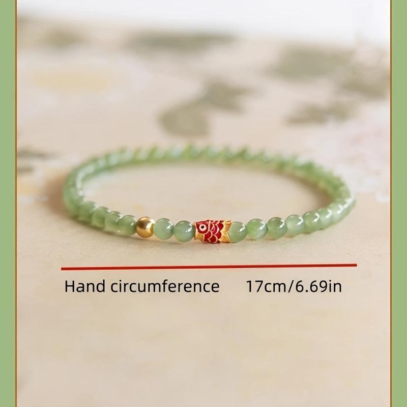 Add a touch of elegance to your casual attire with this faux jade beaded bracelet. Featuring 6mm beads in emerald green with lucky koi accents, this bracelet exudes a vintage Chinese charm.