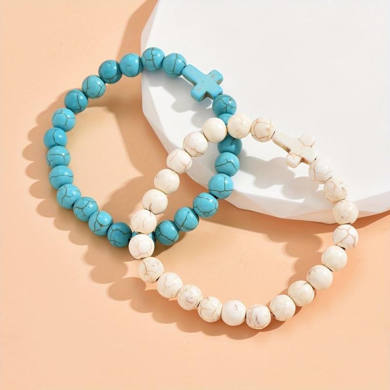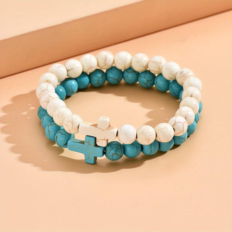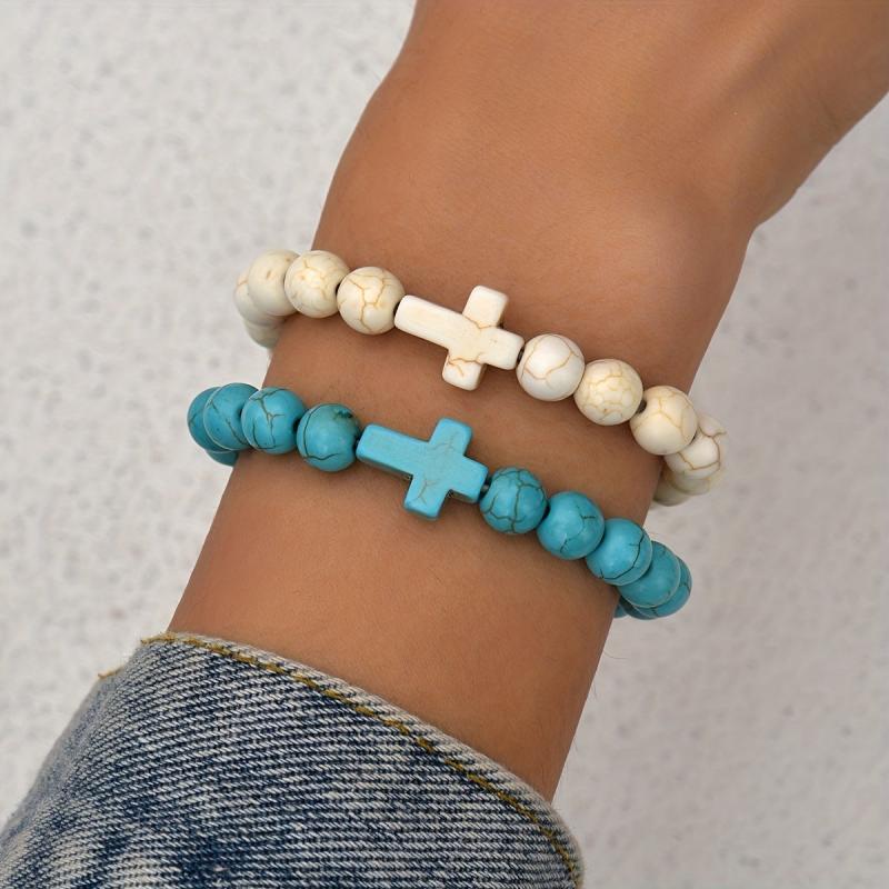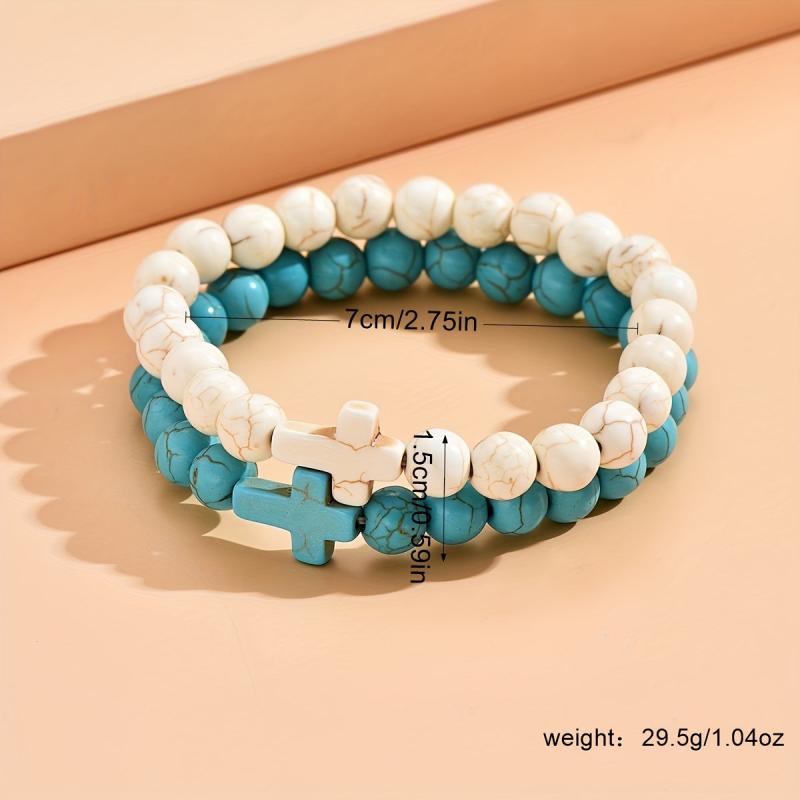 These 2pcs vintage cross stretch bracelets are perfect for both women and men. Made with boho turquoise beads and elastic bands, they are ideal for daily wear and vacation. They also make a perfect Valentine's gift.