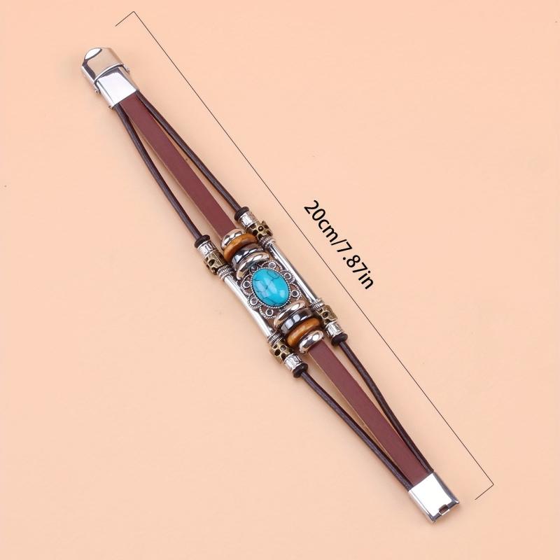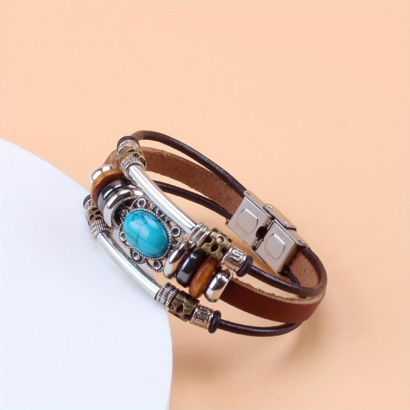 This stylish bracelet features green turquoise beads on a PU leather band with a stainless steel buckle. Perfect for adding a touch of vintage charm to your outfit.