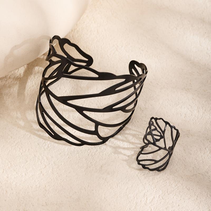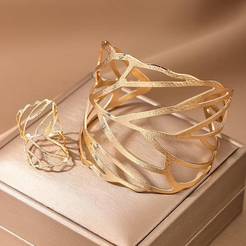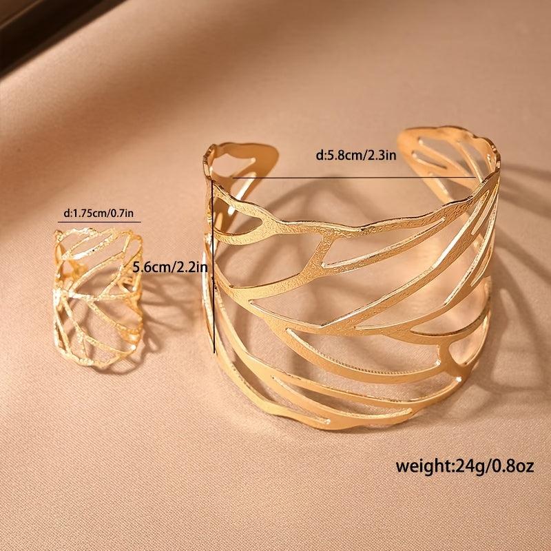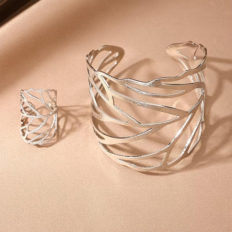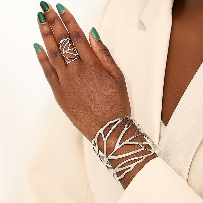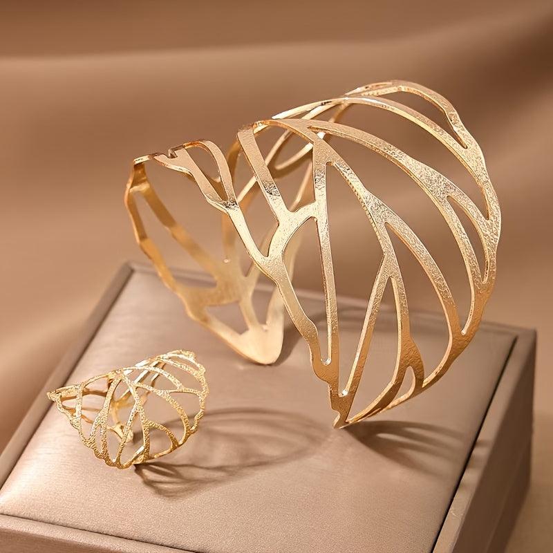 This set includes an exaggerated leaf hollow bracelet and a vintage leaf ring for a fashionable look.