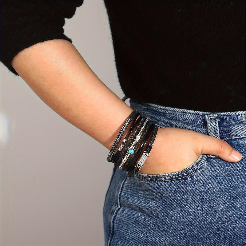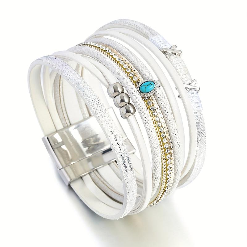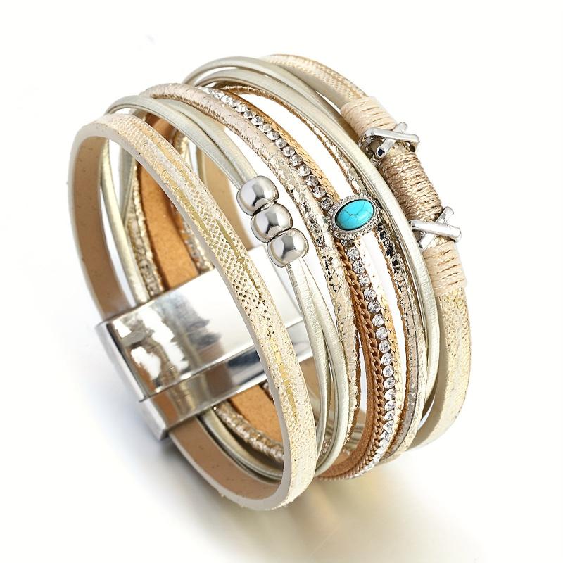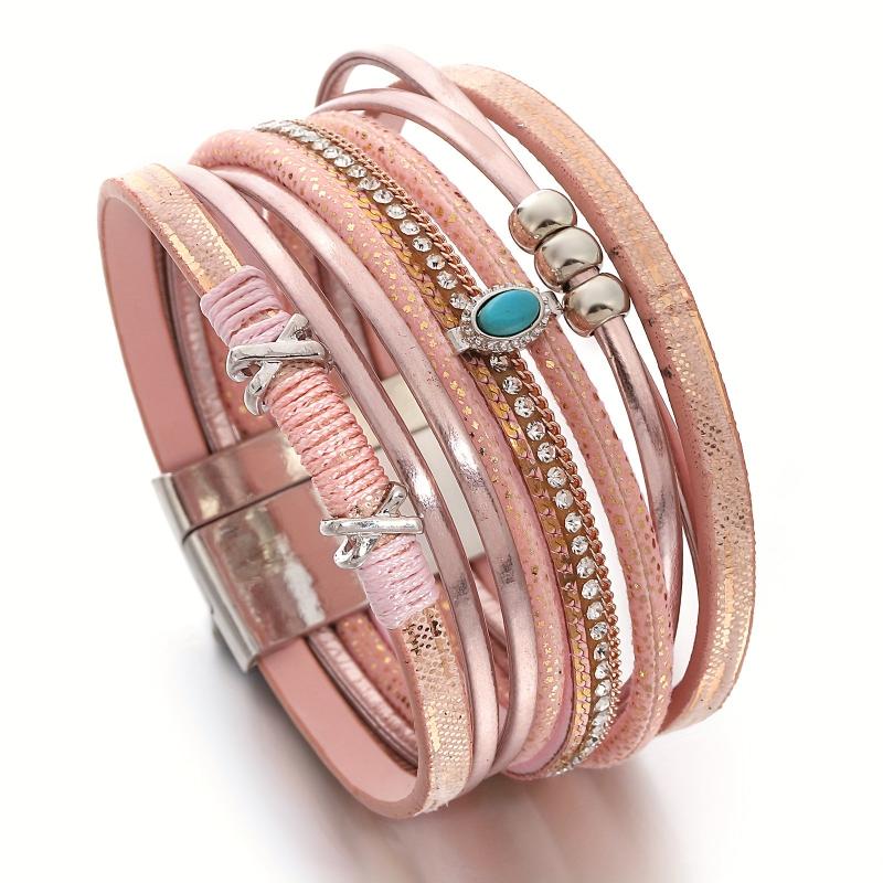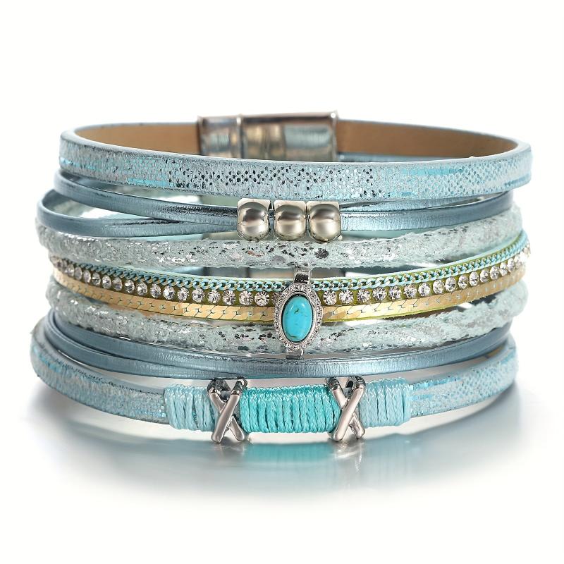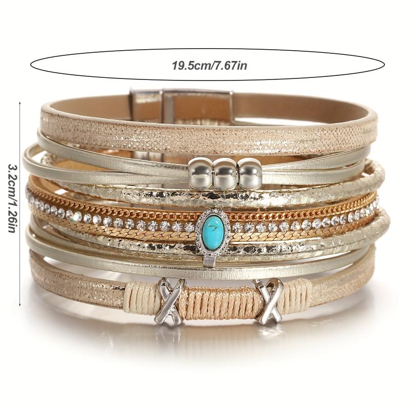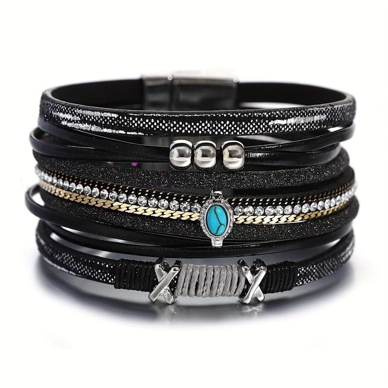 This vintage multilayer bracelet features crosses, stones, and rhinestones on artificial leather. Perfect for parties and everyday wear.