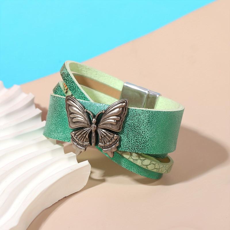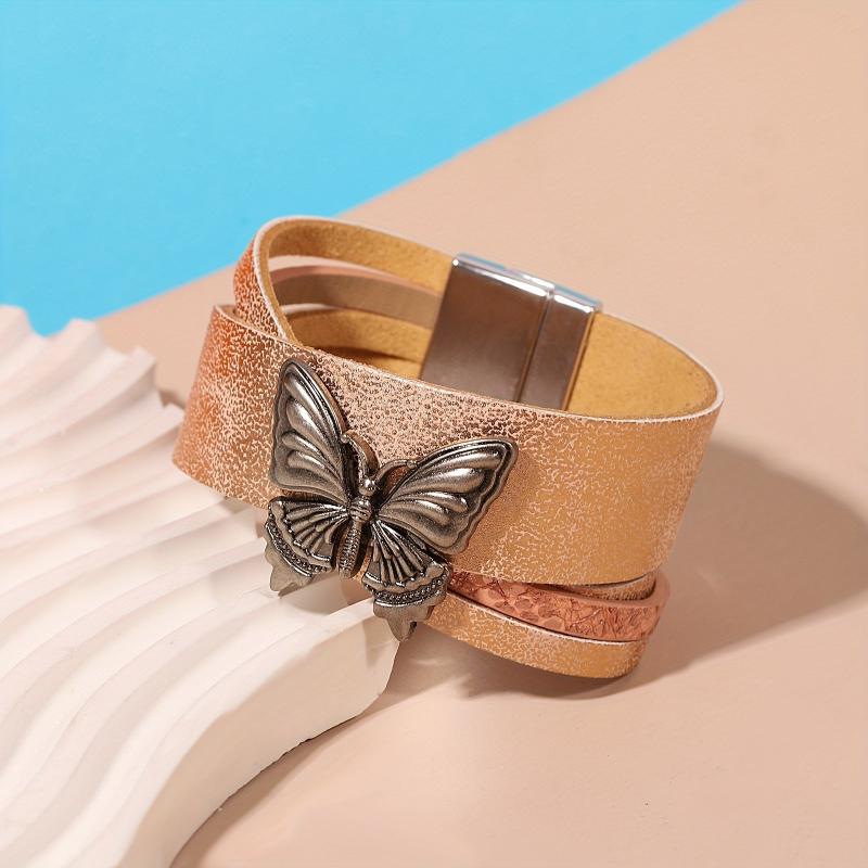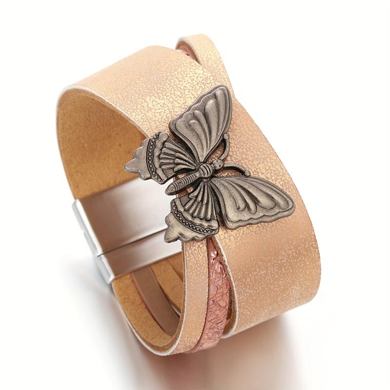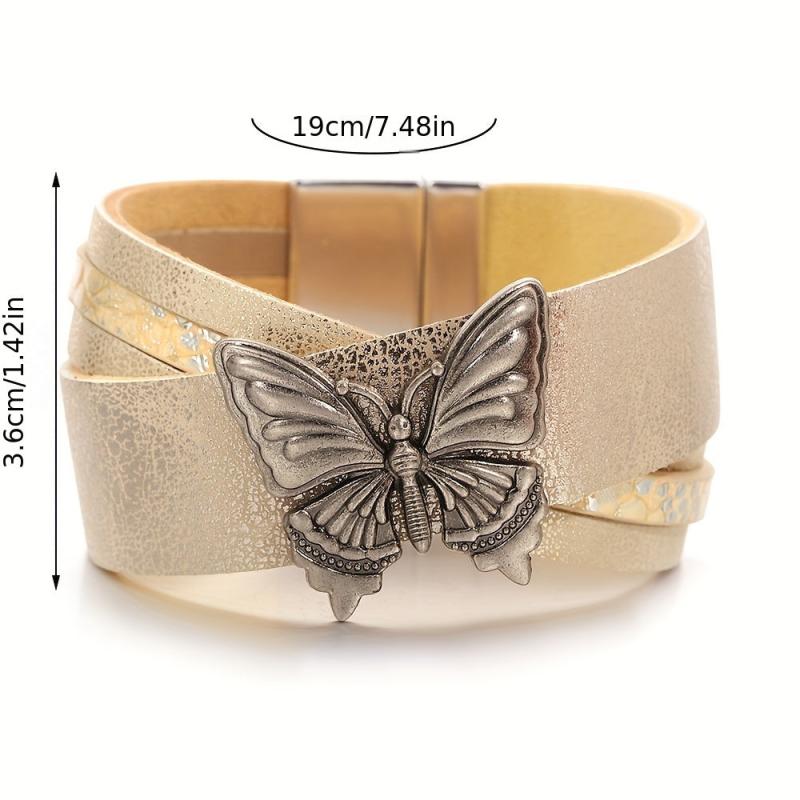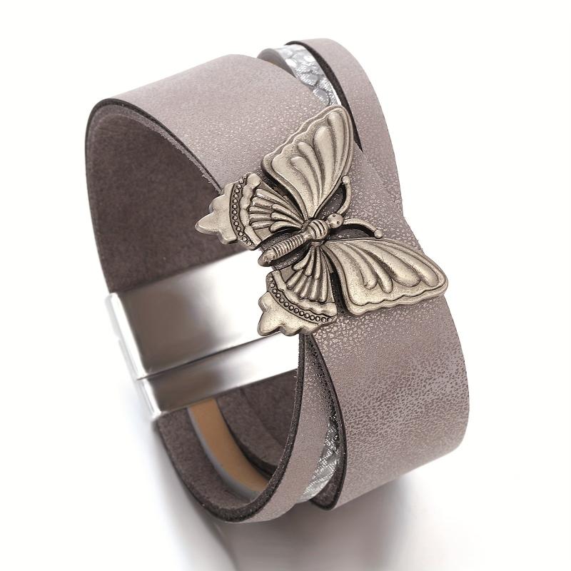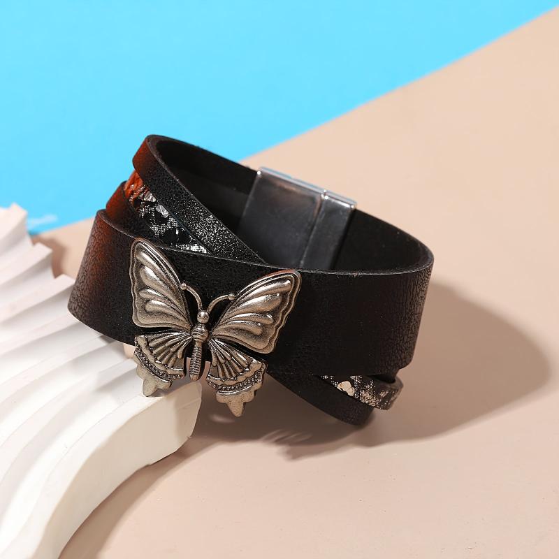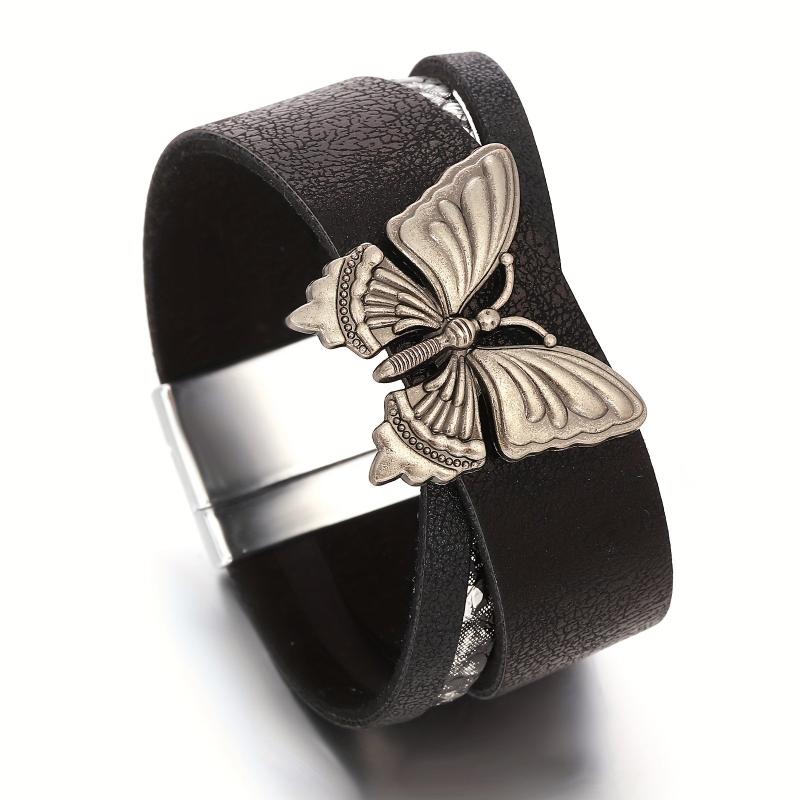 This vintage punk bracelet features a unique gun butterfly charm, made of PU leather, with an adjustable magnetic clasp. Perfect for daily wear or Halloween jewelry accessory.