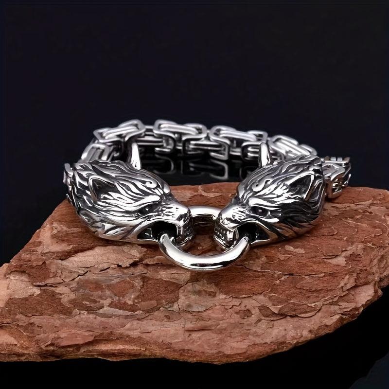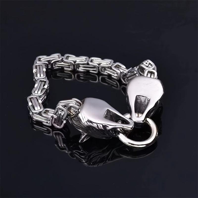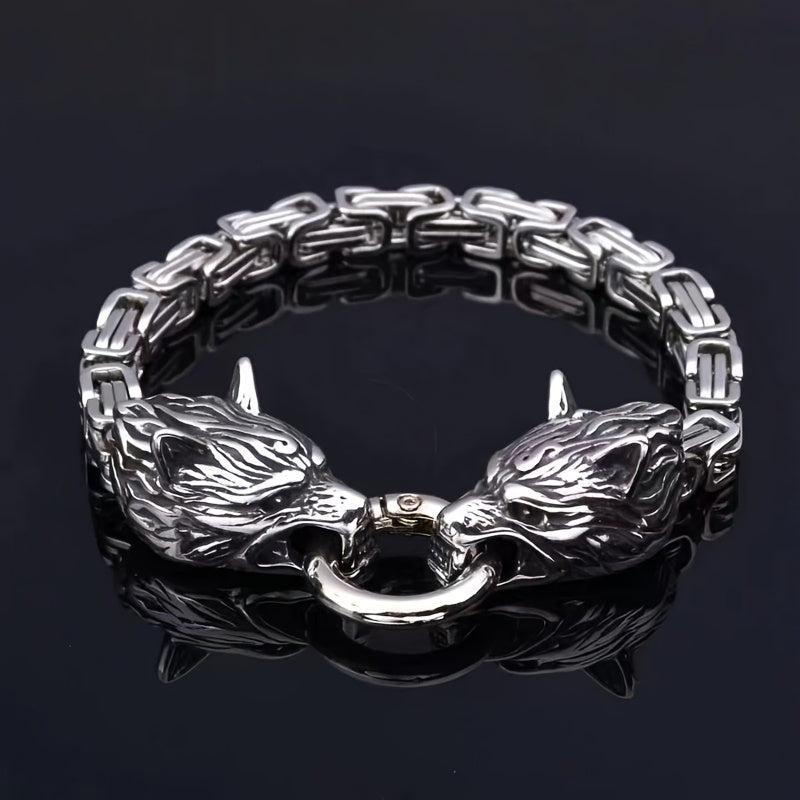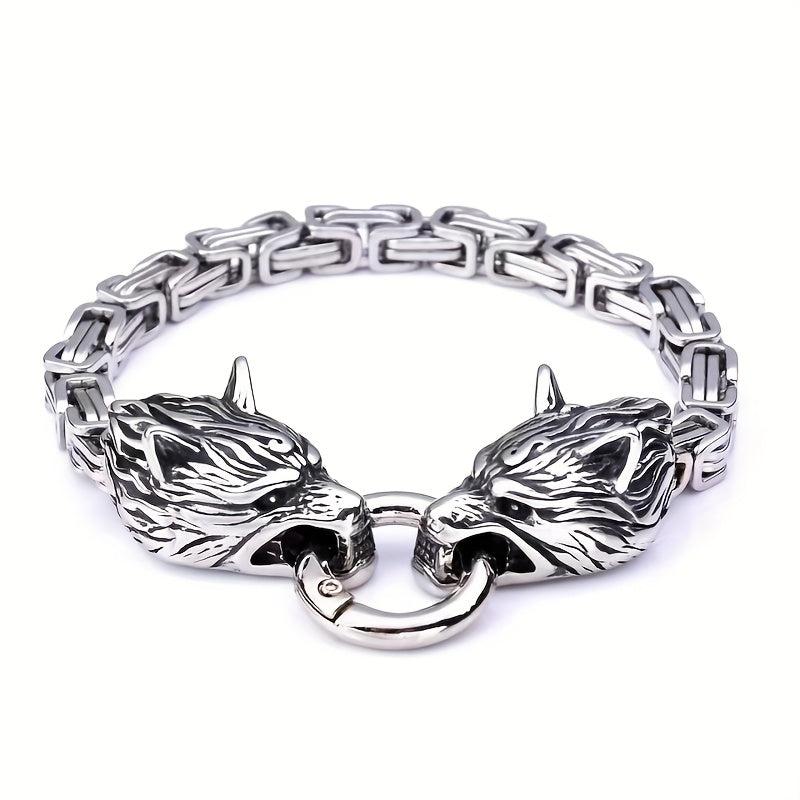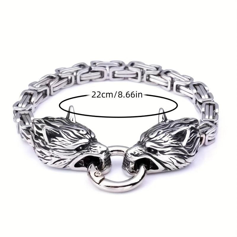 This vintage stainless steel bracelet features double wolf head design with intricate Celtic Byzantine chain links. A unique and stylish accessory that adds a touch of edgy charm to any outfit.