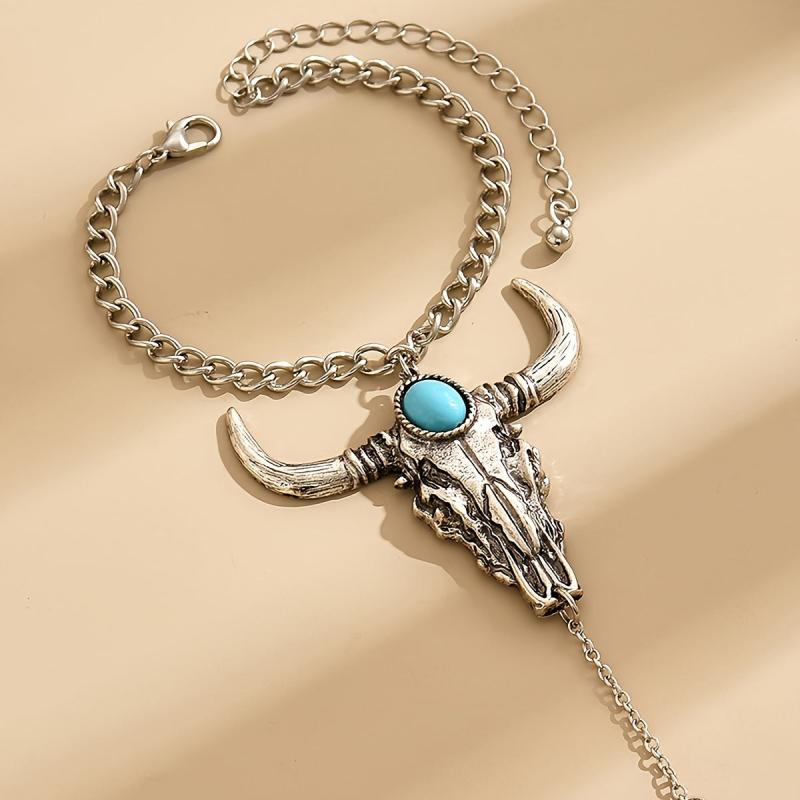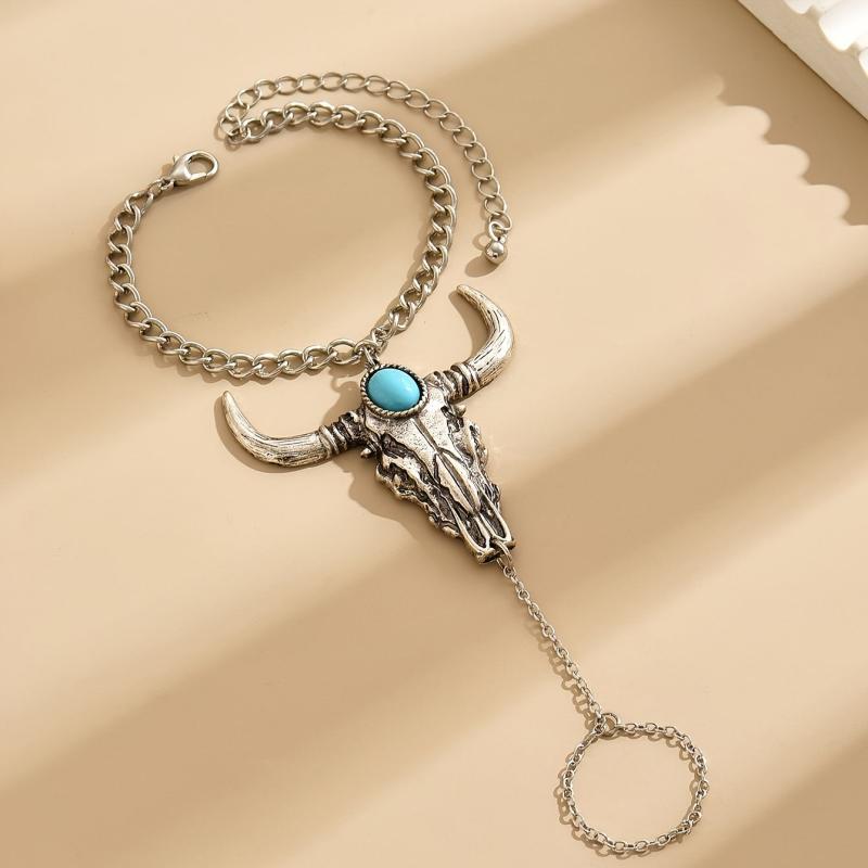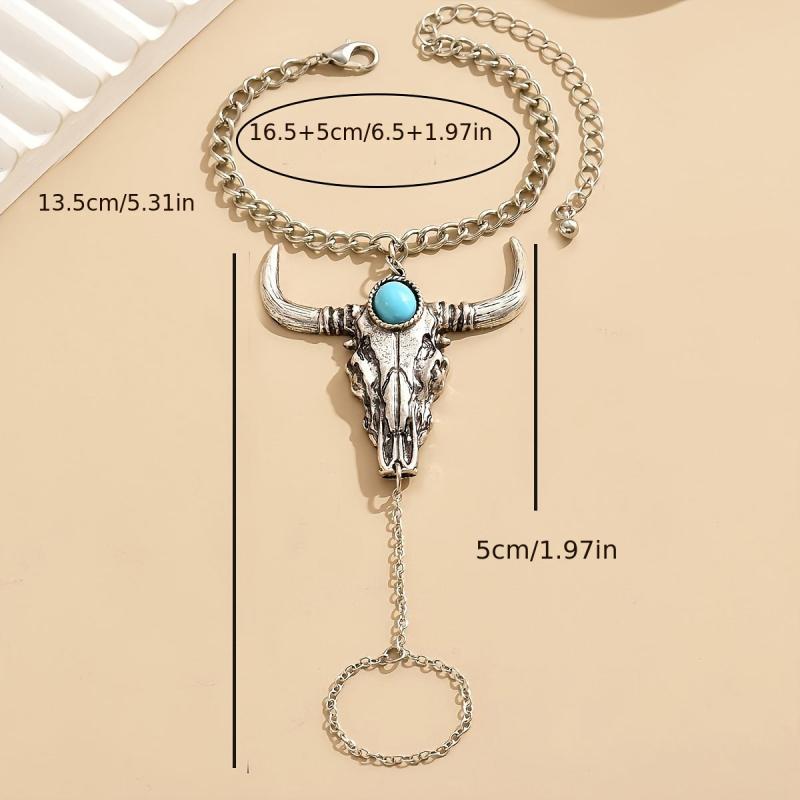Add a touch of the wild west to your outfit with this vintage cowboy style finger bracelet featuring a turquoise bull head design and unique farmhouse charm.