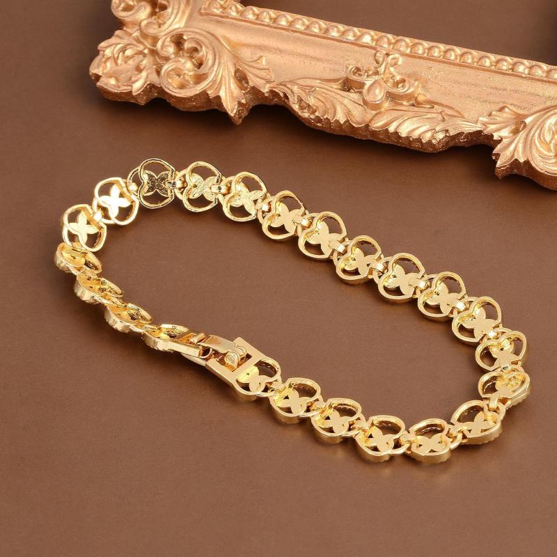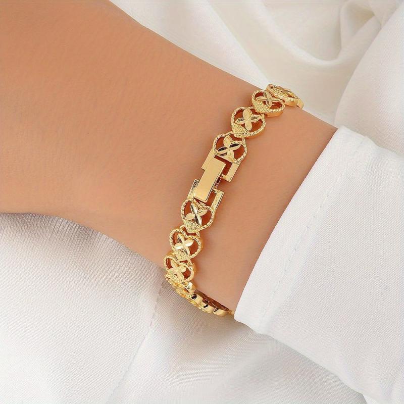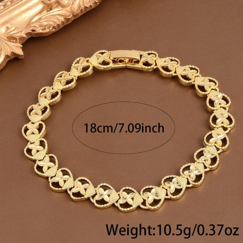 This bracelet features golden tone chain with intricate knotwork and heart charms. It is versatile for daily wear and special occasions.