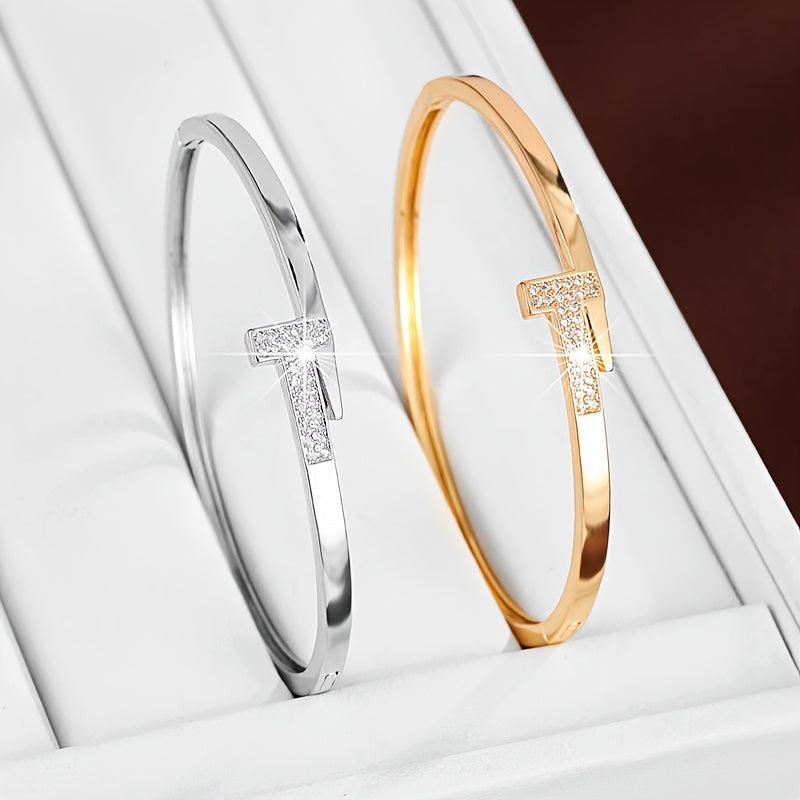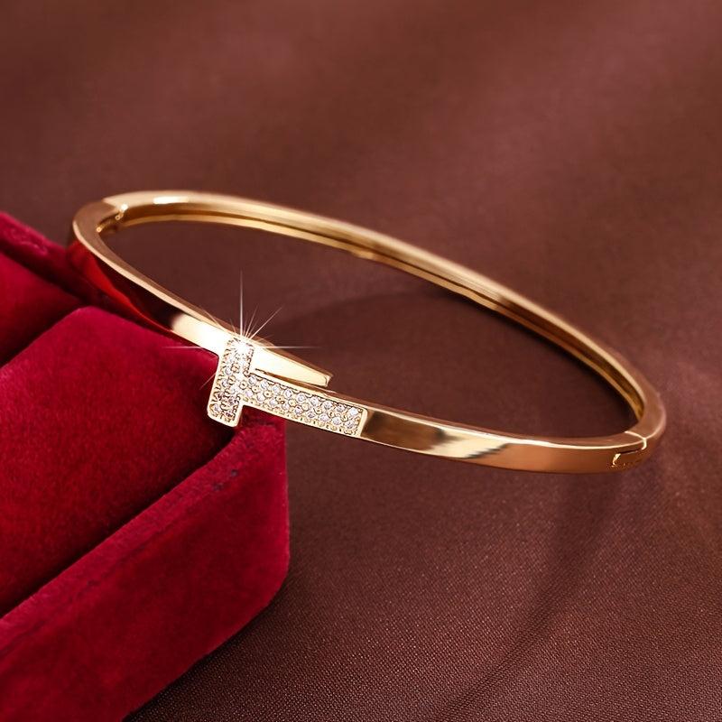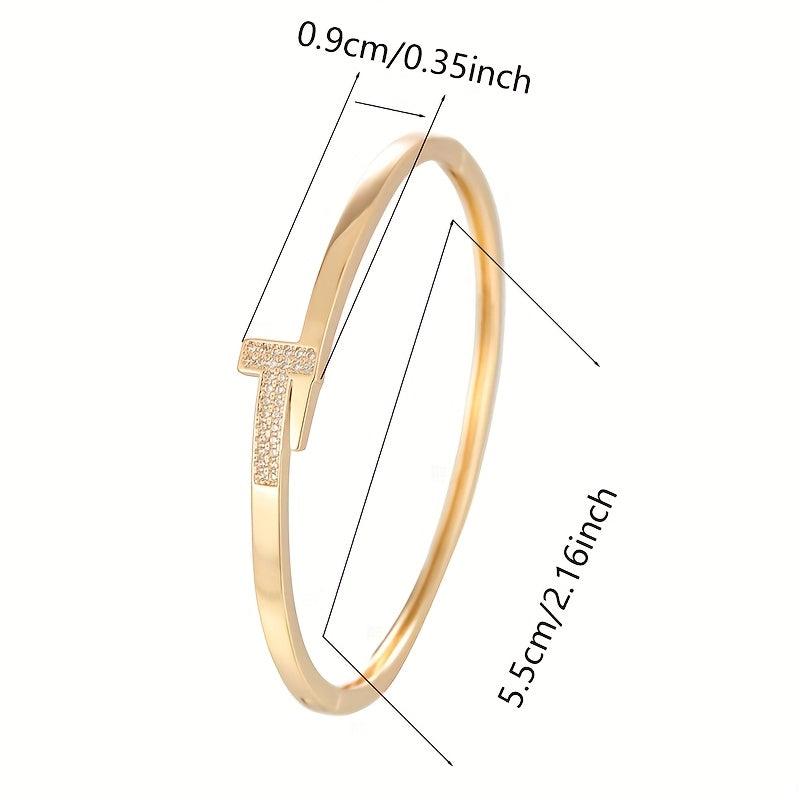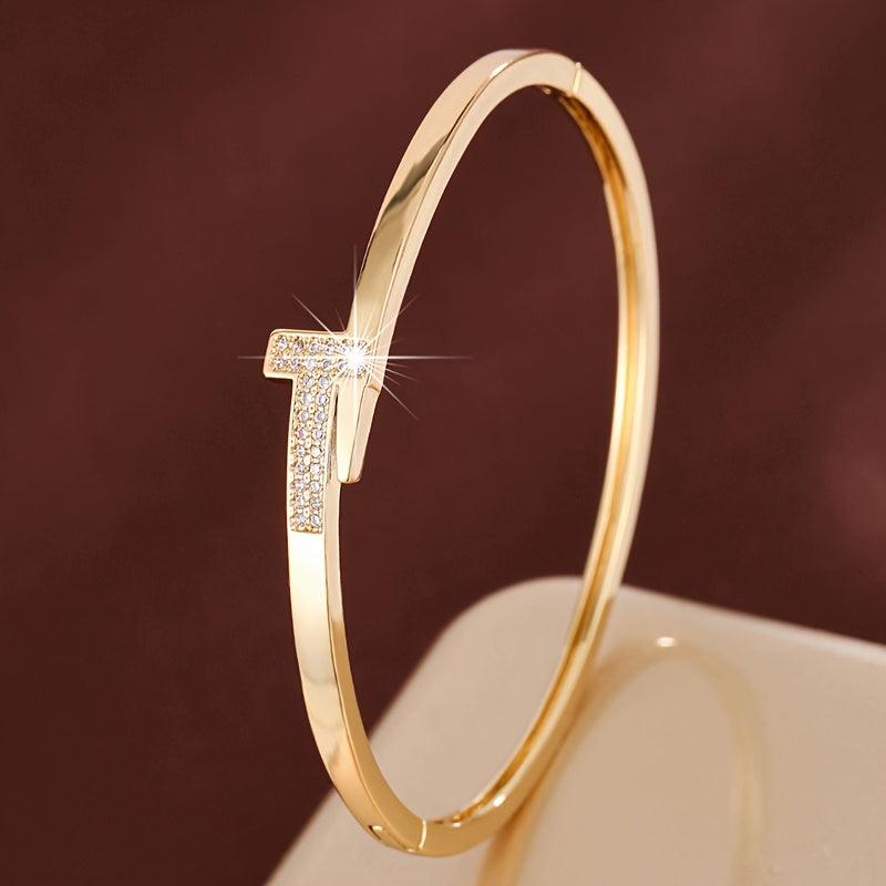 Add a touch of elegance to your casual attire with this T shaped letter bracelet featuring synthetic zirconia stones set in golden plated metal. Also makes a great gift for a loved one.