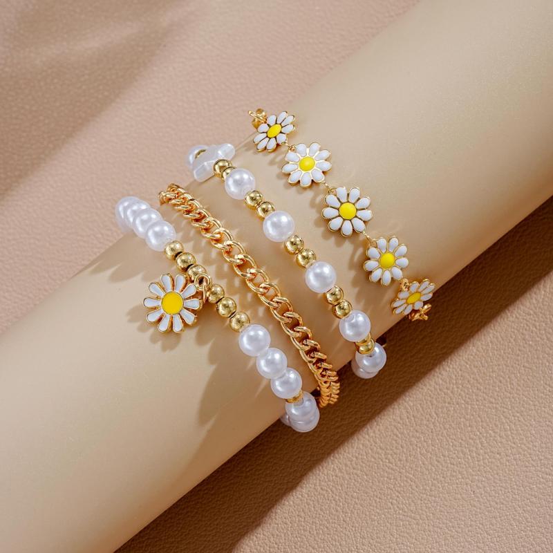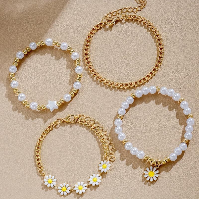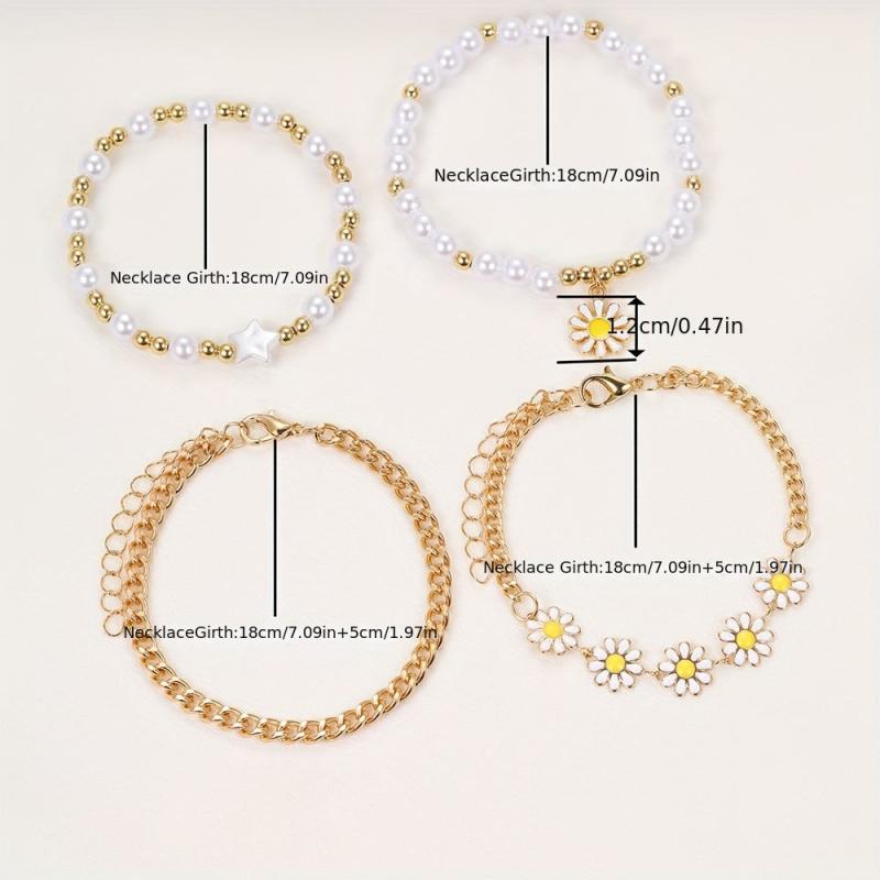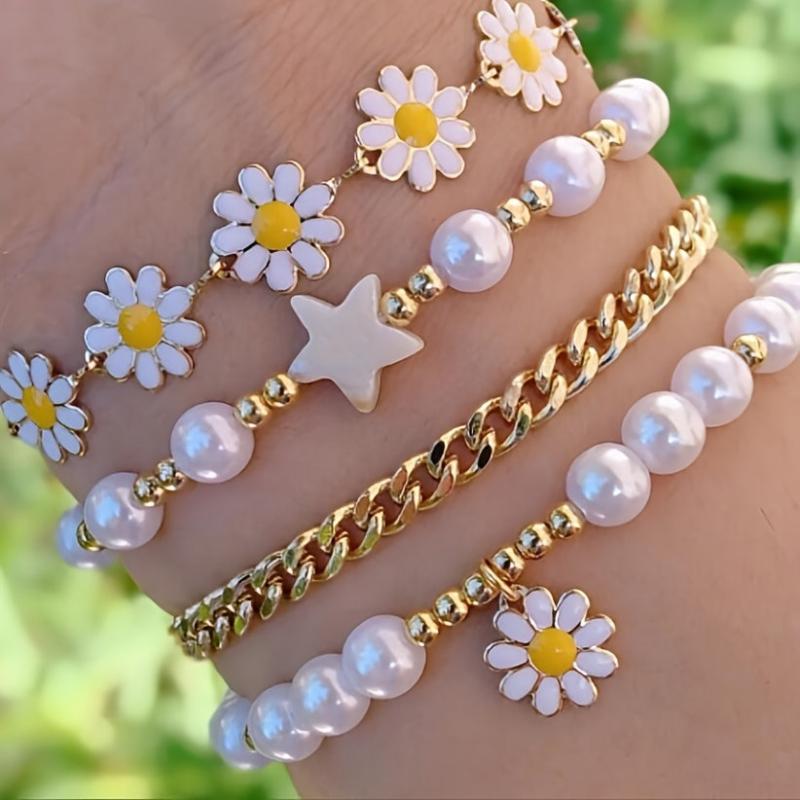 Embrace Y2K style with this 4-piece bracelet set featuring star, flower, and daisy charms on faux pearl beads made of zinc alloy. Perfect for vacation or gifting.