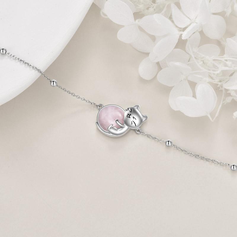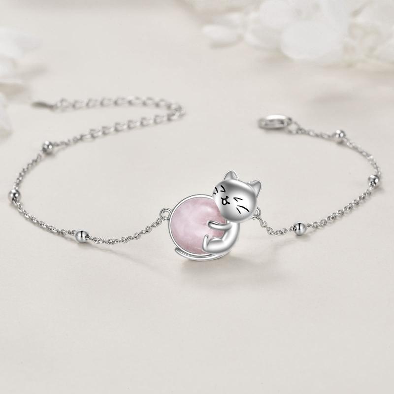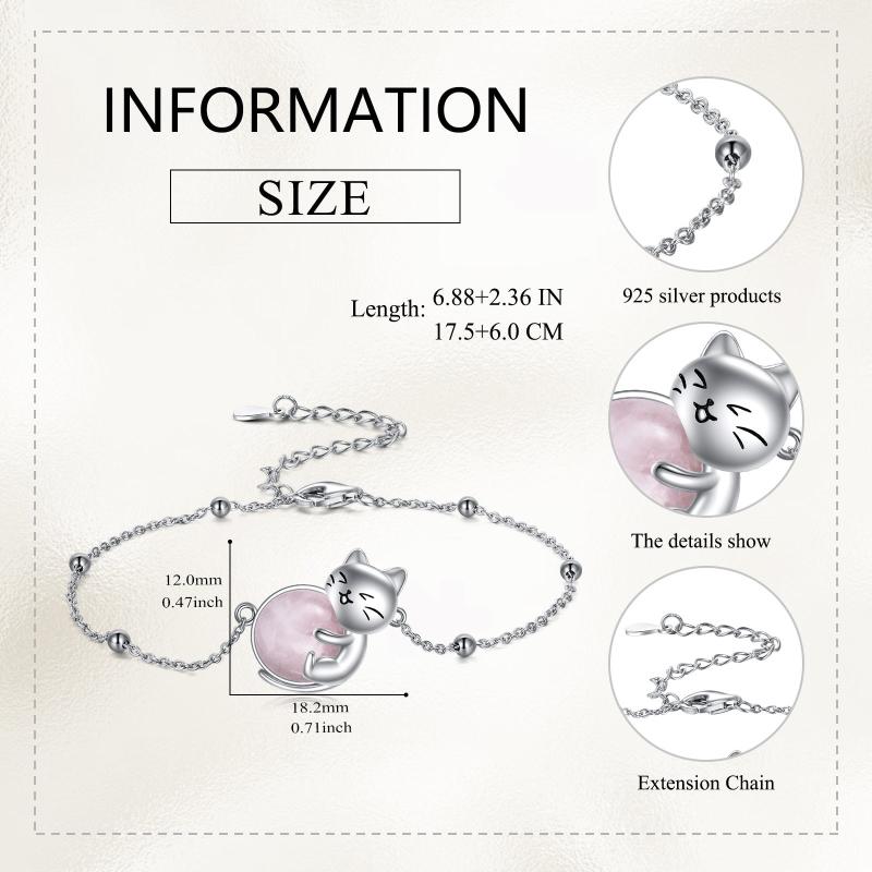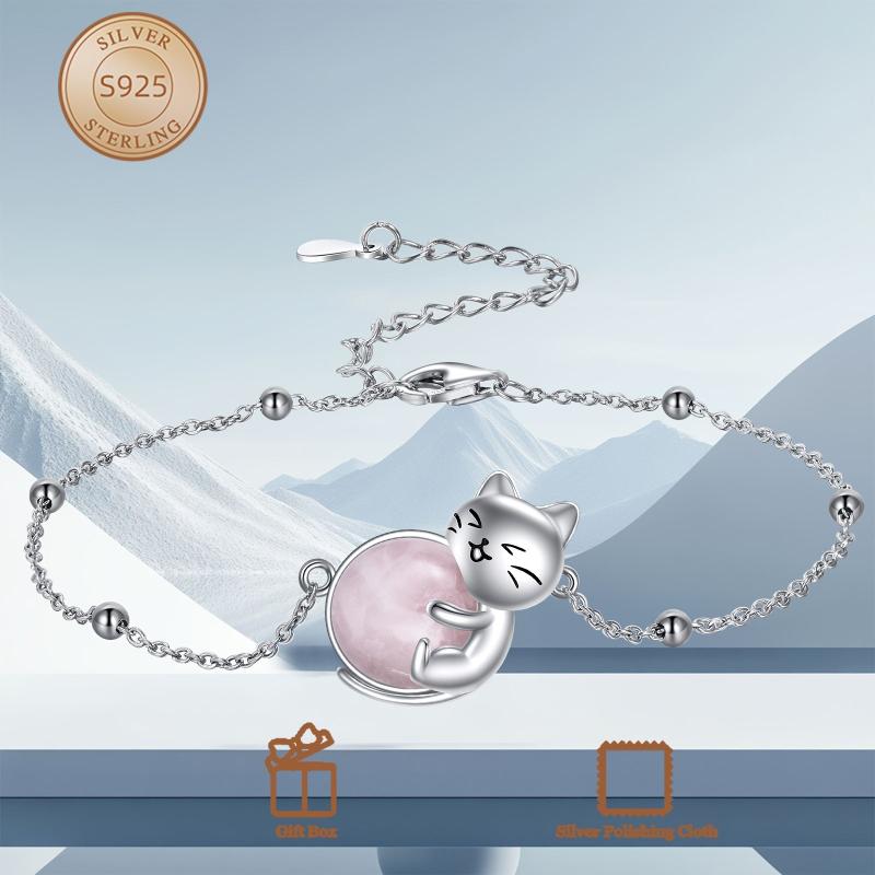 This sterling silver cat bracelet features a rose quartz gemstone and an adjustable chain anklet. A perfect gift for mothers or cat lovers, this animal-themed jewelry is both elegant and playful.