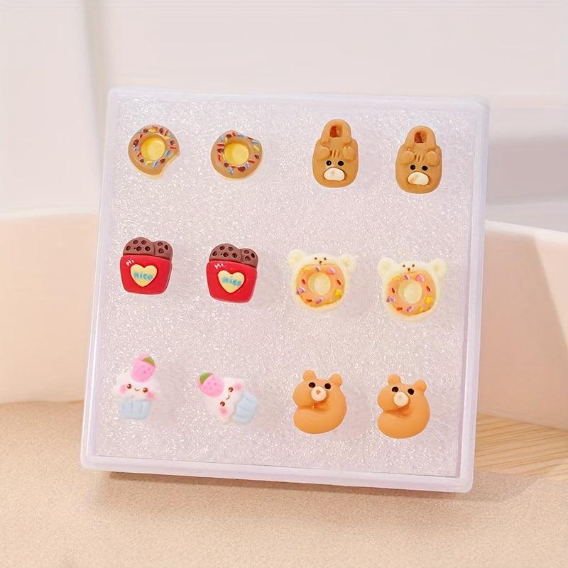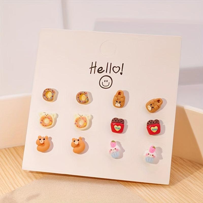 Add a touch of fun to your outfit with this set of 12 cartoon animal resin earrings. These hypoallergenic stud earrings come in a variety of cute shapes and are perfect for everyday wear.