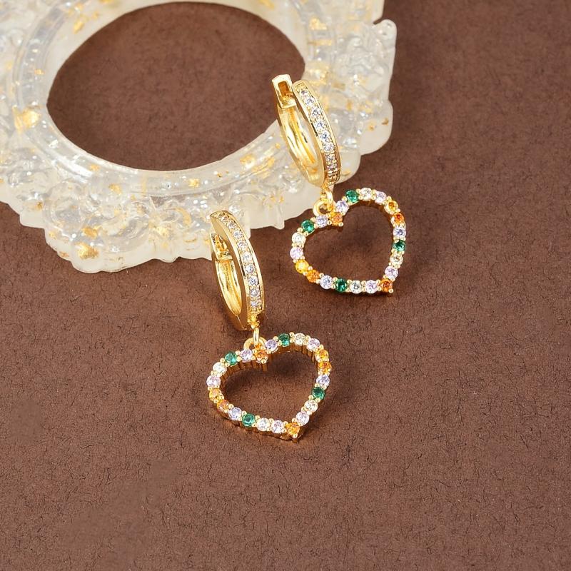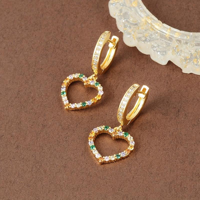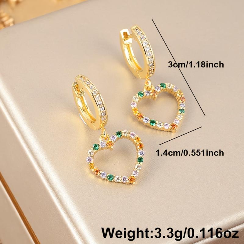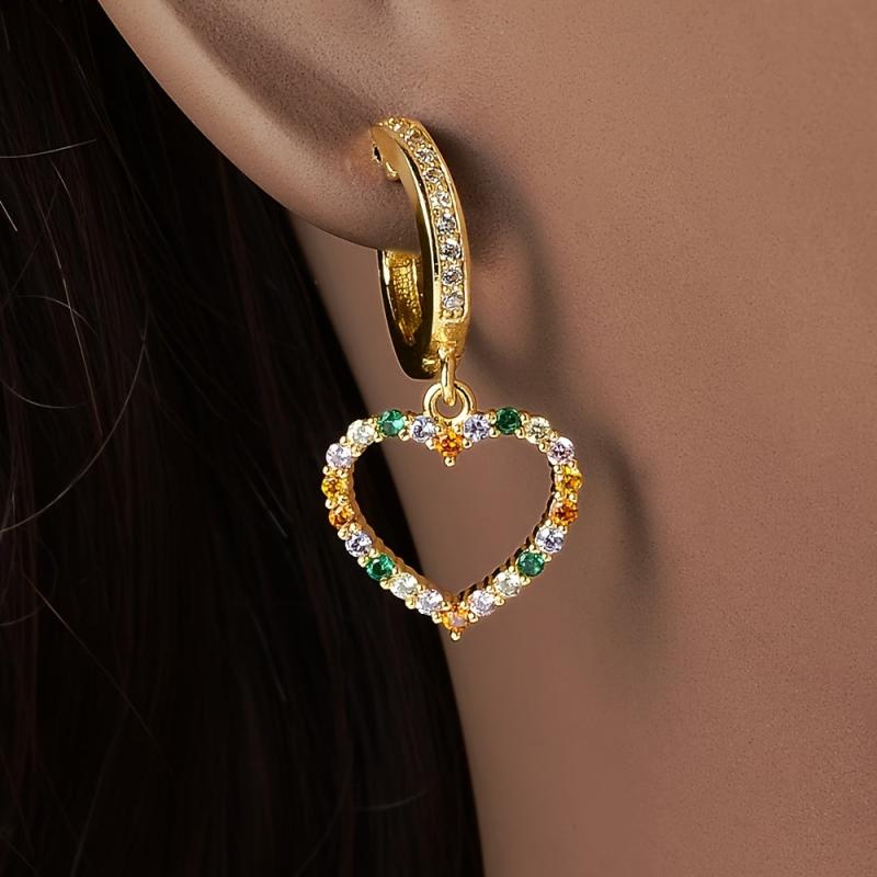Add a touch of glamour to your daily look with these stunning heart-shaped dangle earrings. Crafted from 18K golden plated copper, these earrings feature multicolor cubic zirconia stones that catch the light beautifully.