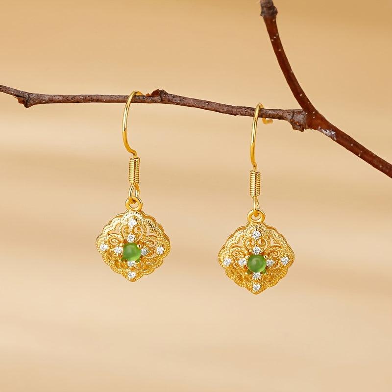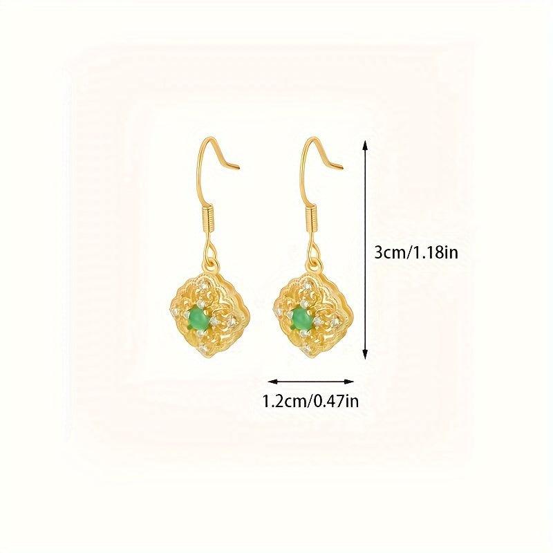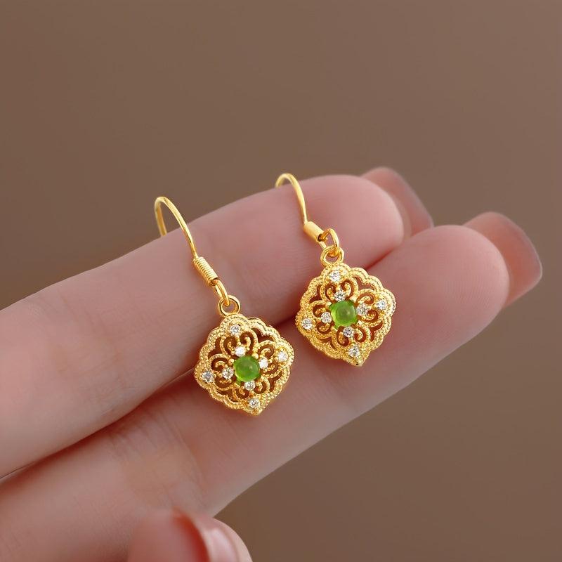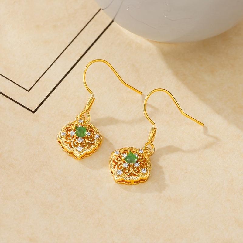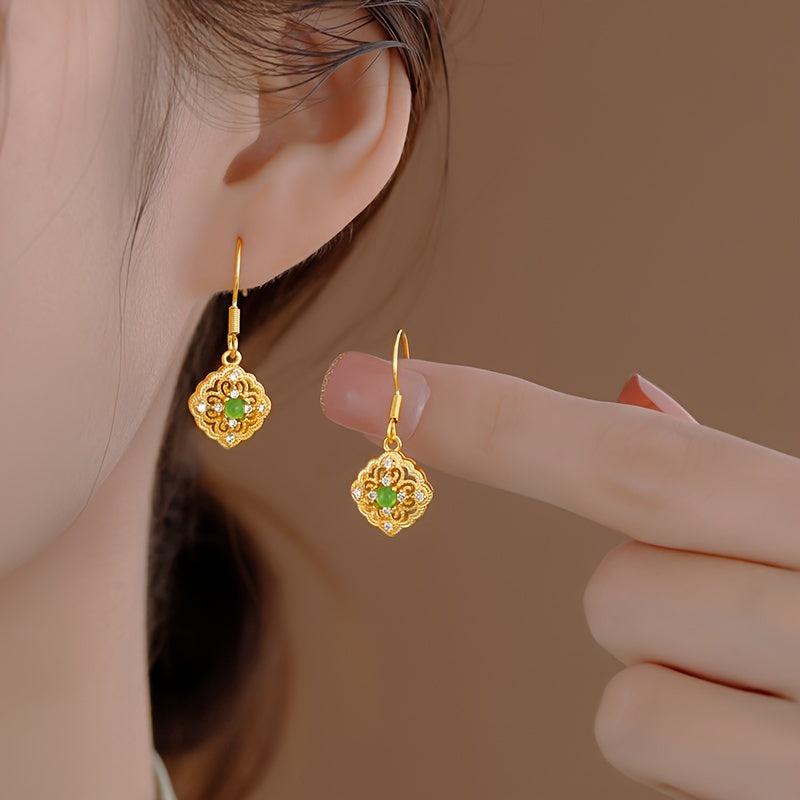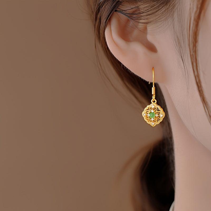 Add a touch of tribal inspiration to your daily look with these stunning 18K gold plated hoop earrings featuring synthetic jade. Perfect for daily wear.
